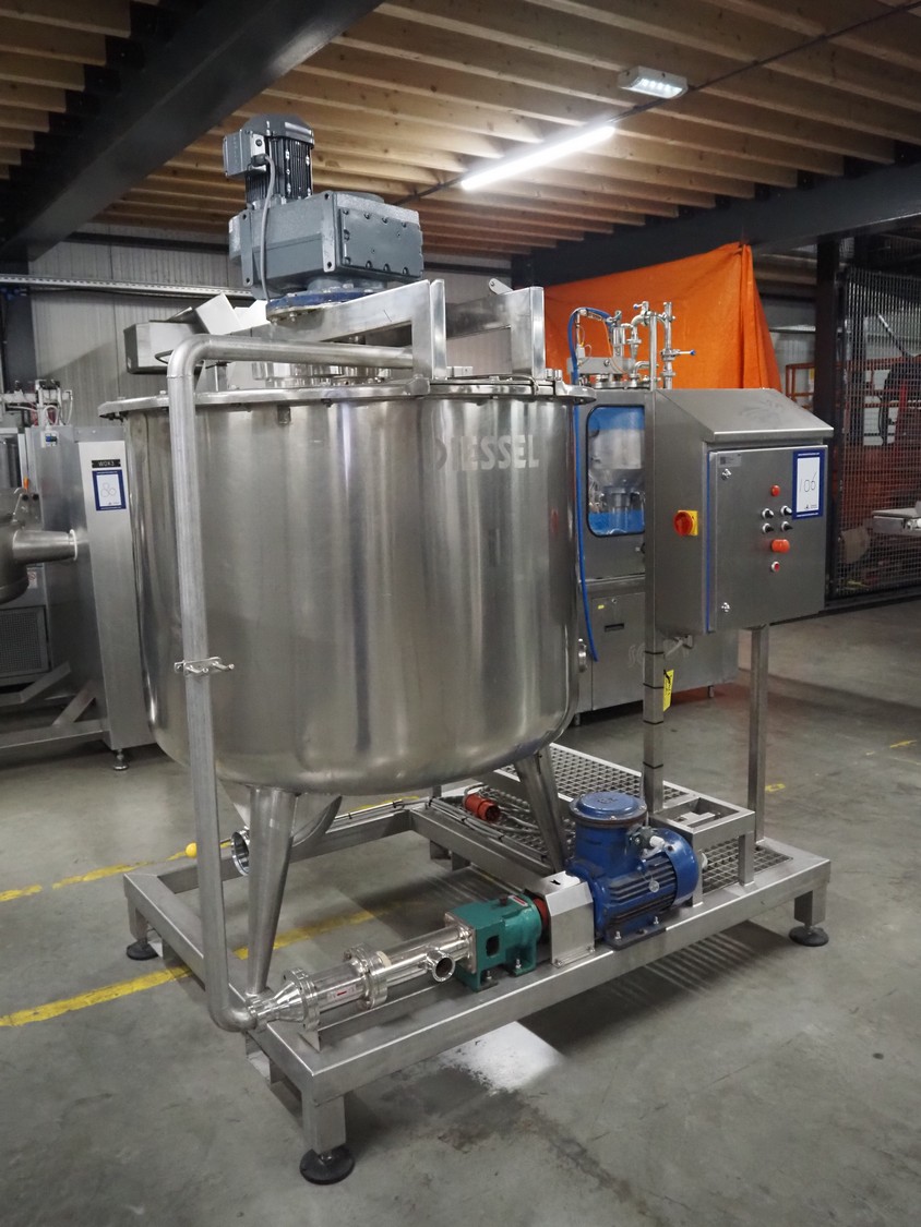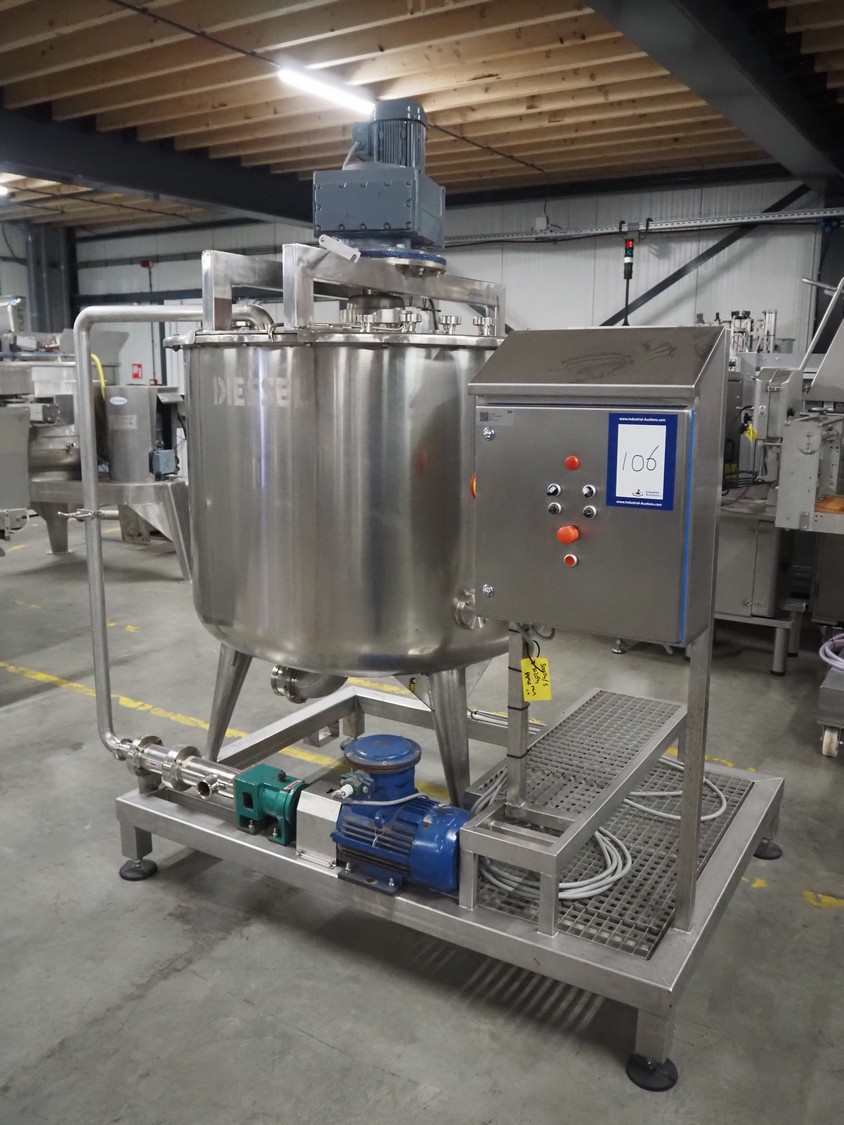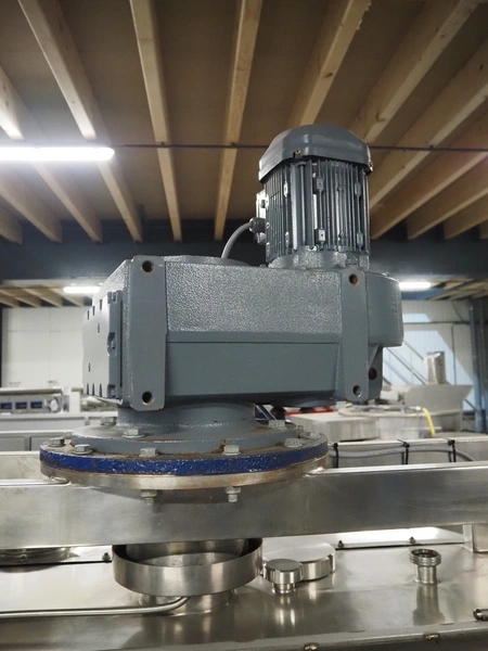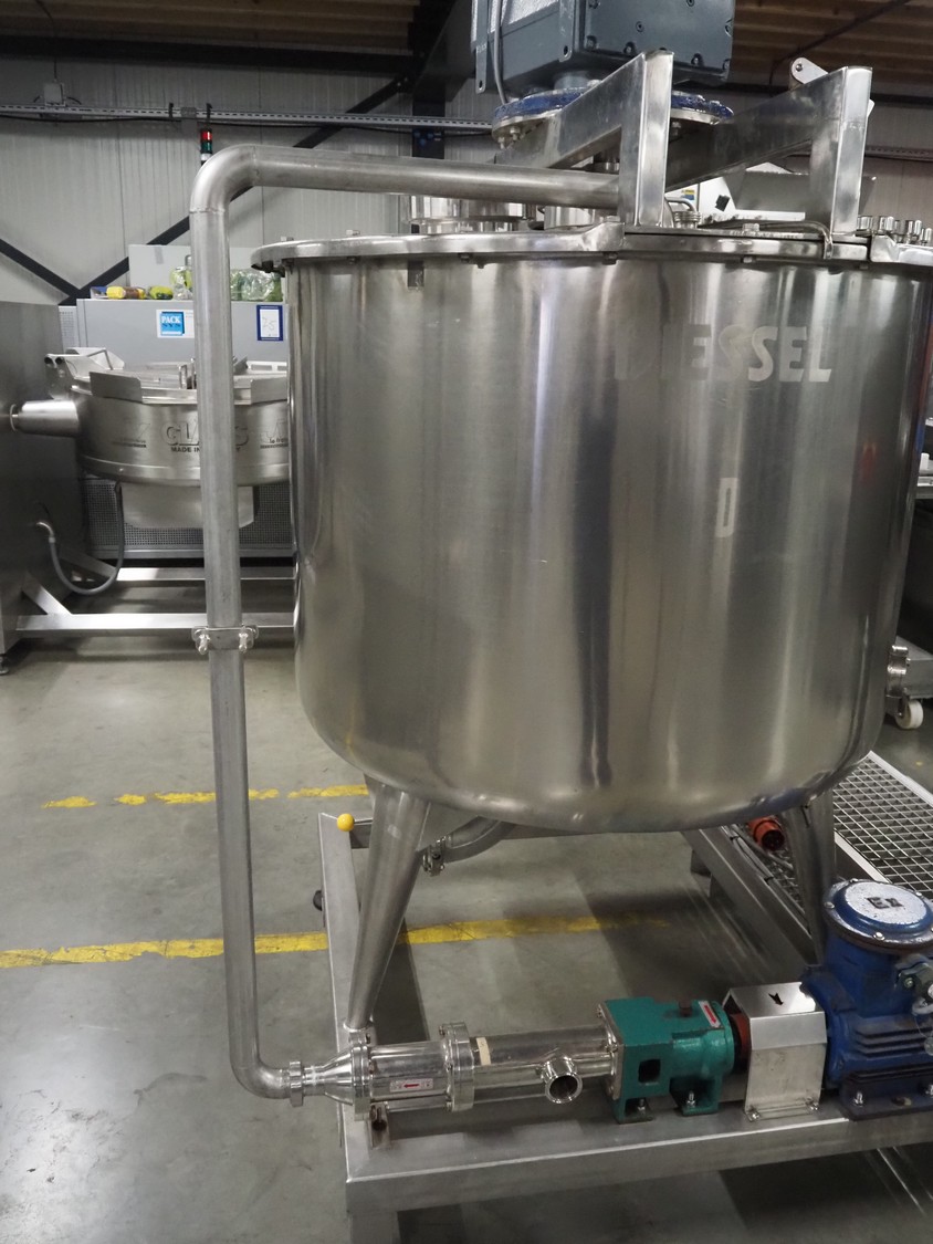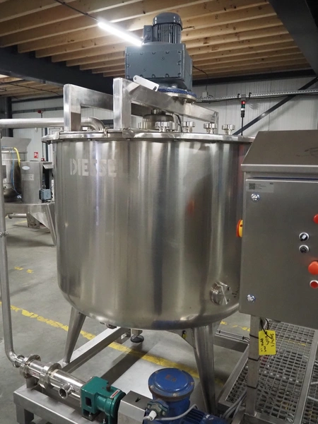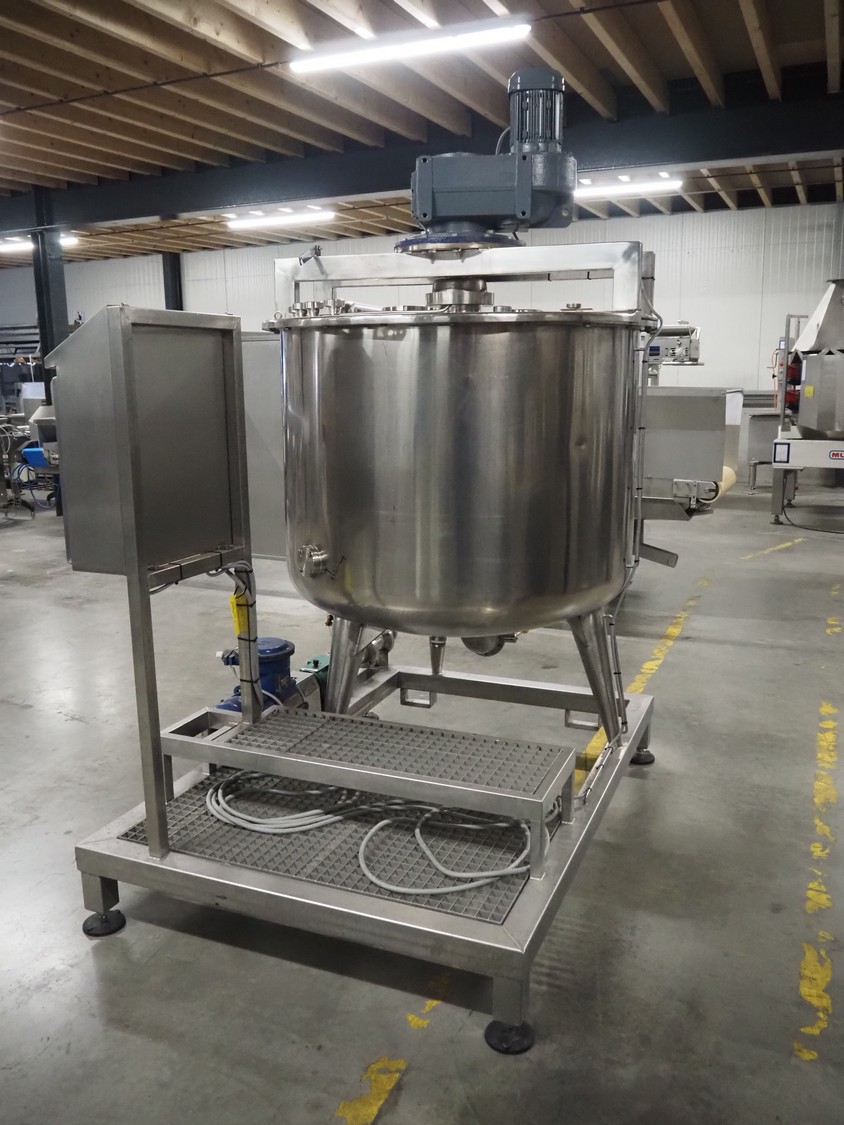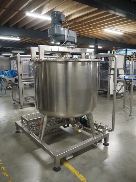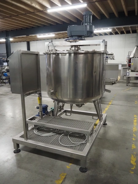 S/s skid with mixing tank, inside dimensions: Ø 1200 mm x 1000 mm, total dimensions: 2000 mm x 1350 mm x 2500 mm.