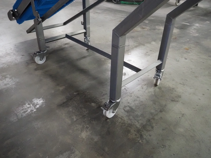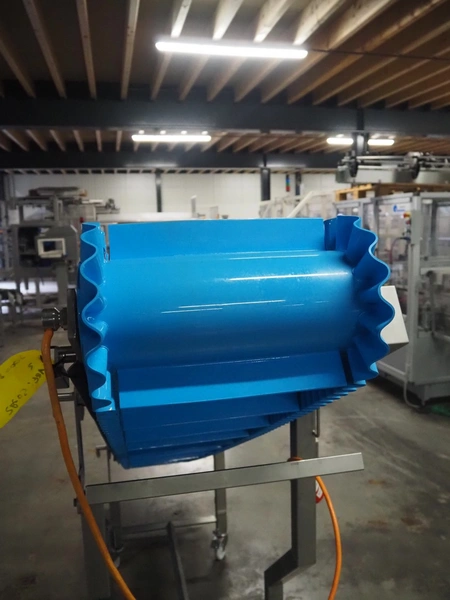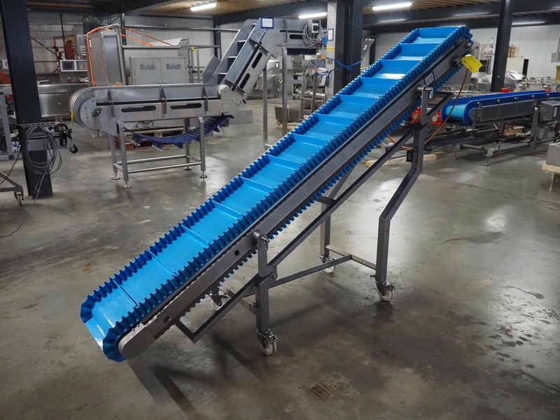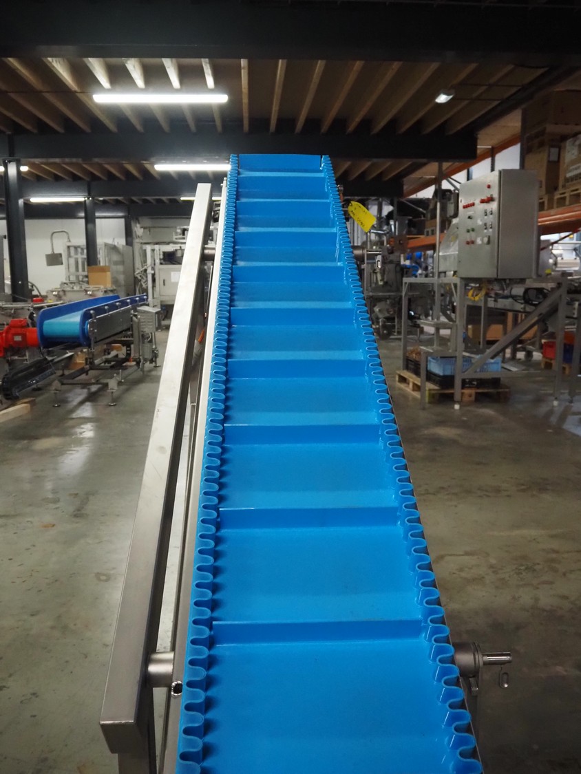 Elevating belt, s/s frame, plastic belt with dividers, belt width: 380 mm, distance between dividers: 210 mm, divider height: 50 mm, elevating height: 1600 mm, total dimensions: 2950 mm x 600 mm x 1640 mm.