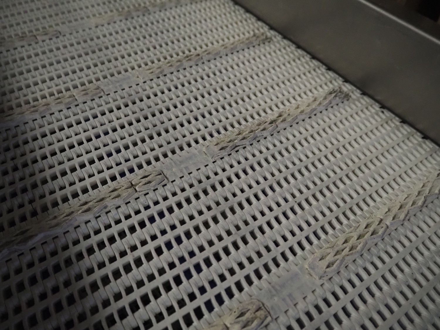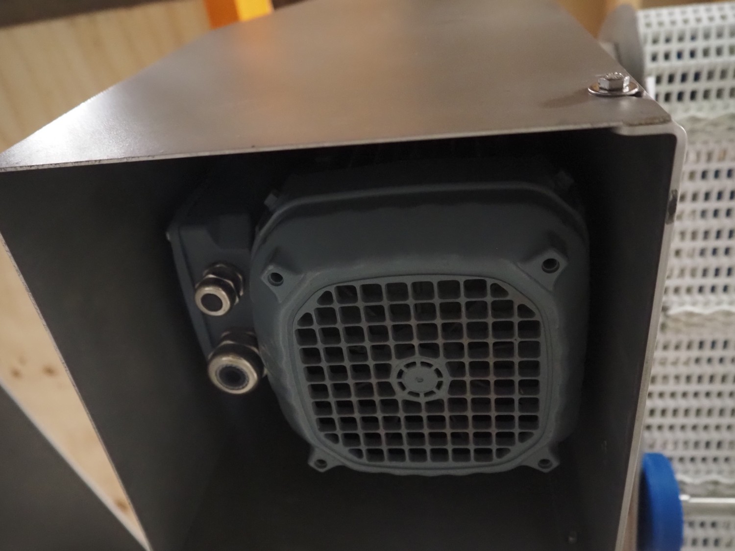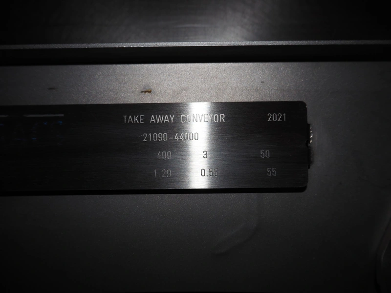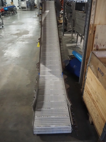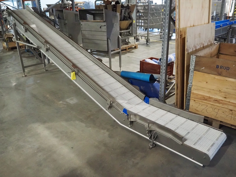 MACS elevating belt, s/s frame, type: TAKE AWAY CONVEYOR, number: 21090-44000, year of construction: 2021, 400 V, 3 Ph, 50 Hz, 1.29 A, 0.55 kW, plastic mesh belt, belt width: 450 mm, elevating height: 1500 mm, total dimensions: 4800 mm x 800 mm x 1600 mm.