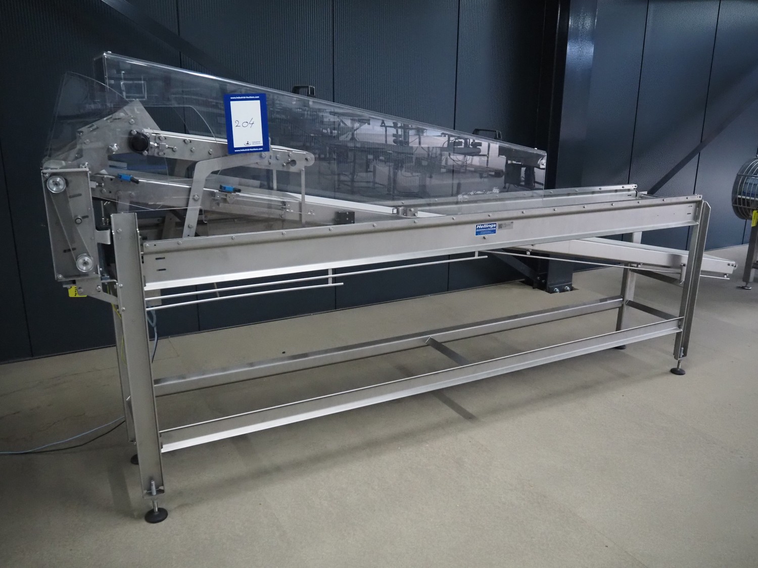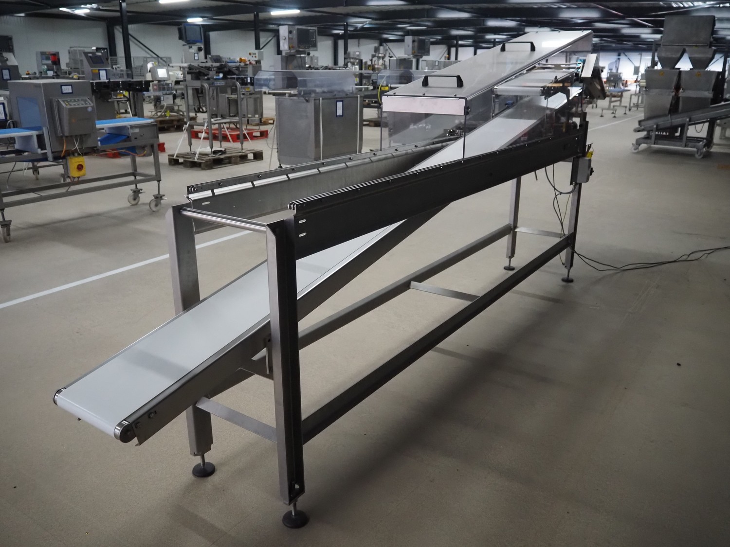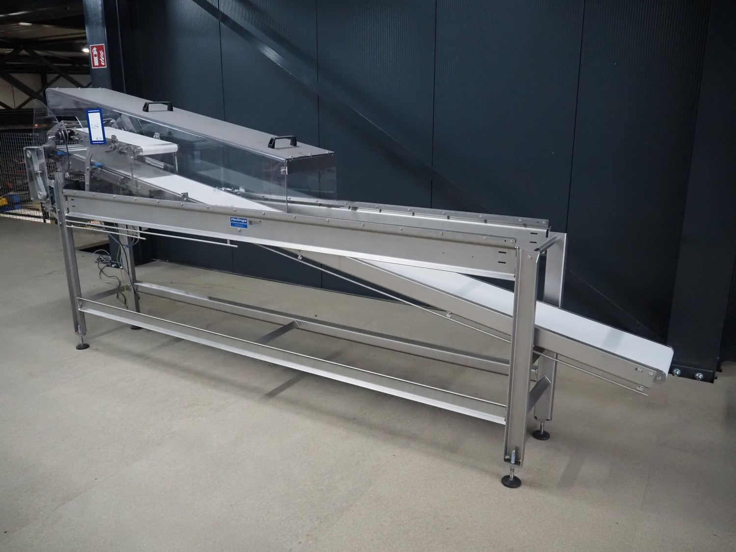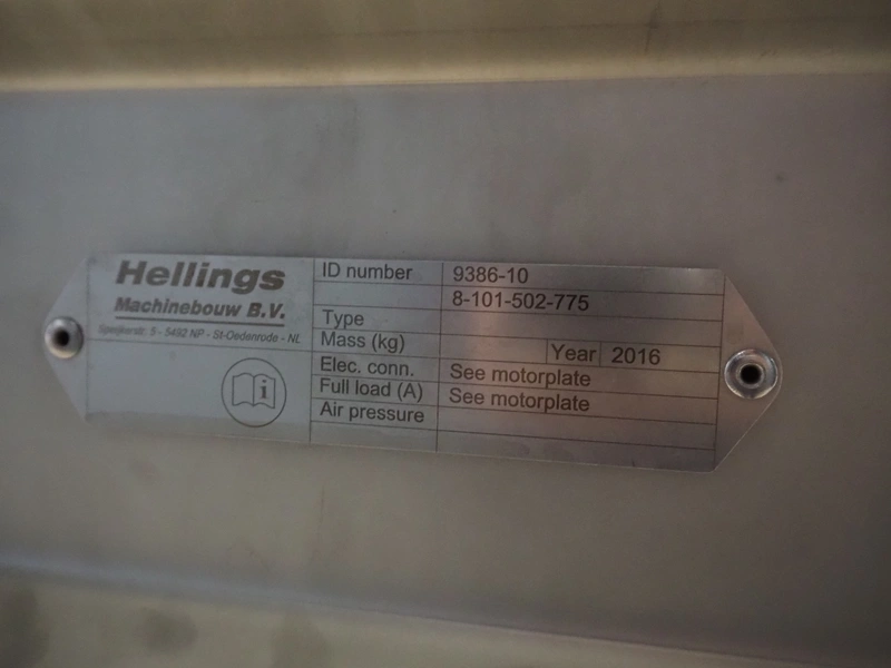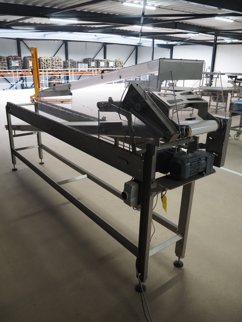 Hellings Machinebouw B.V. elevating belt, year of construction: 2016, plastic belt, belt width: 250 mm, elevating height: 1320 mm, total dimensions: 3650 mm x 600 mm x 1650 mm.