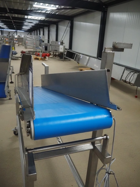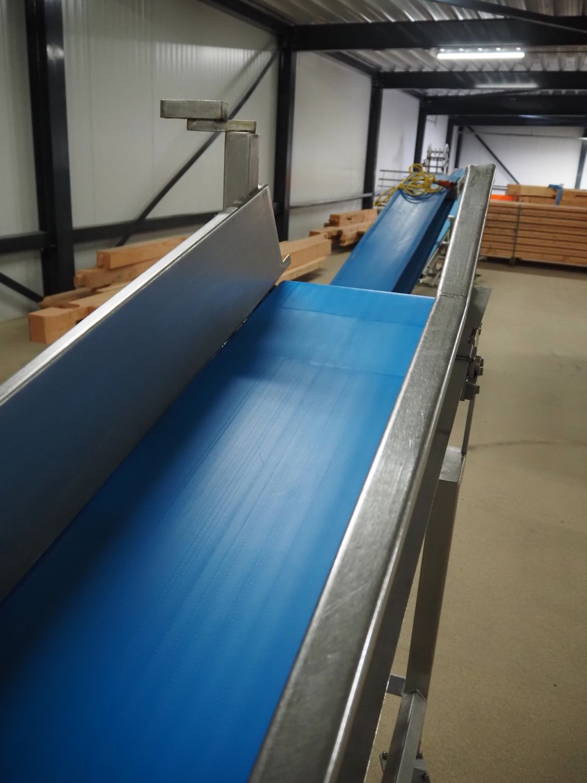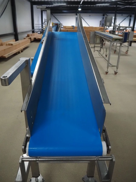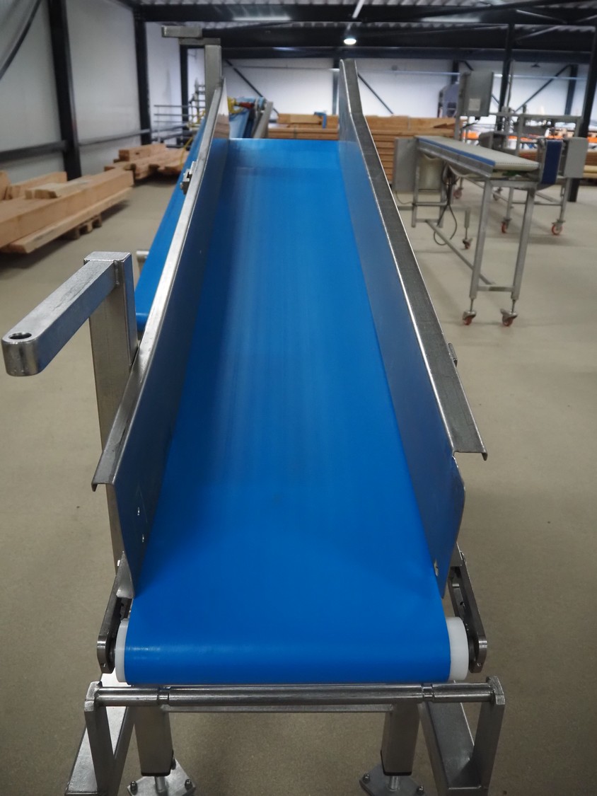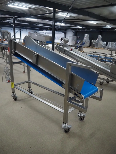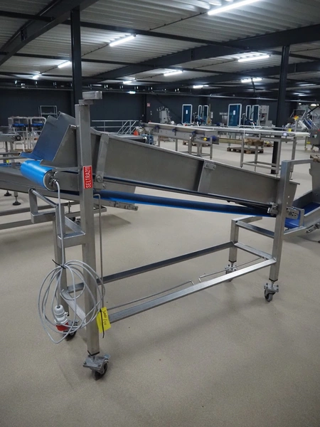 Mobile elevating belt, s/s frame, plastic belt, belt width: 375 mm, elevating height: 1160 mm, total dimensions: 2050 mm x 550 mm x 1510 mm.