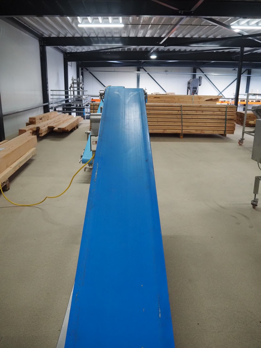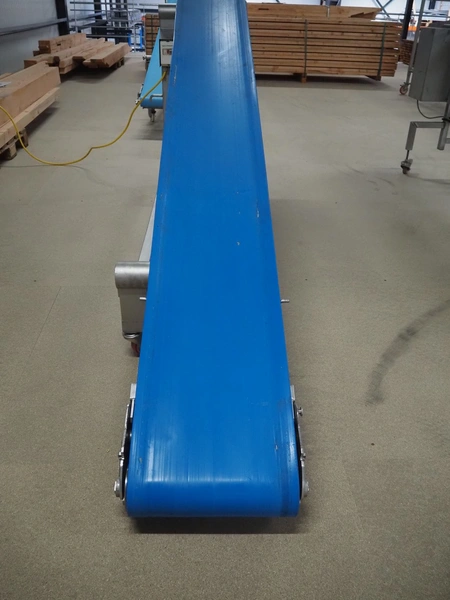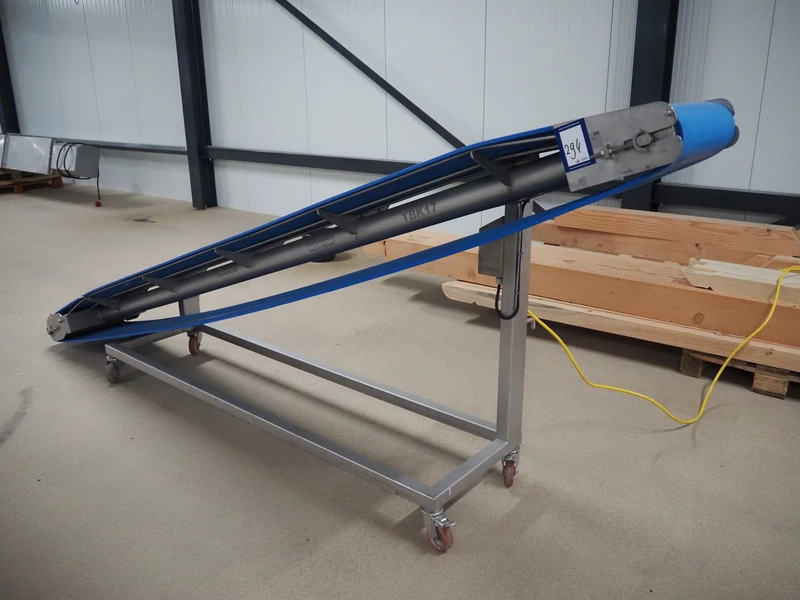 Mobile elevating belt, plastic belt, belt width: 400 mm, elevating height: 1350 mm, total dimensions: 3300 mm x 600 mm x 1340 mm.