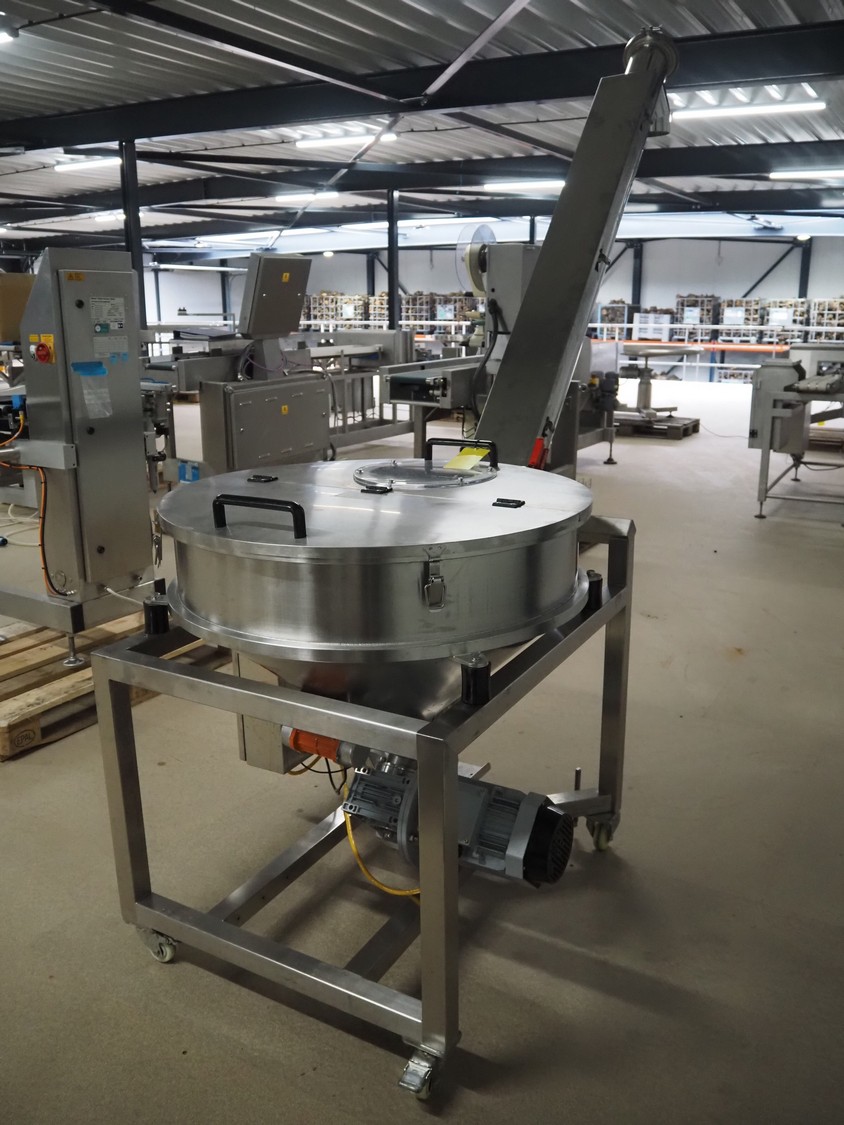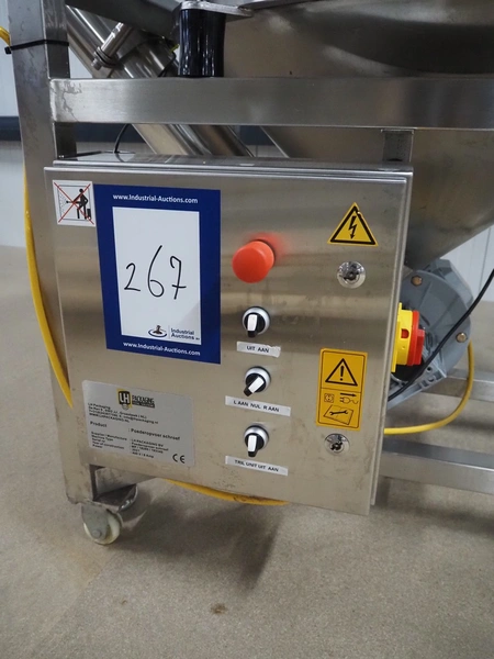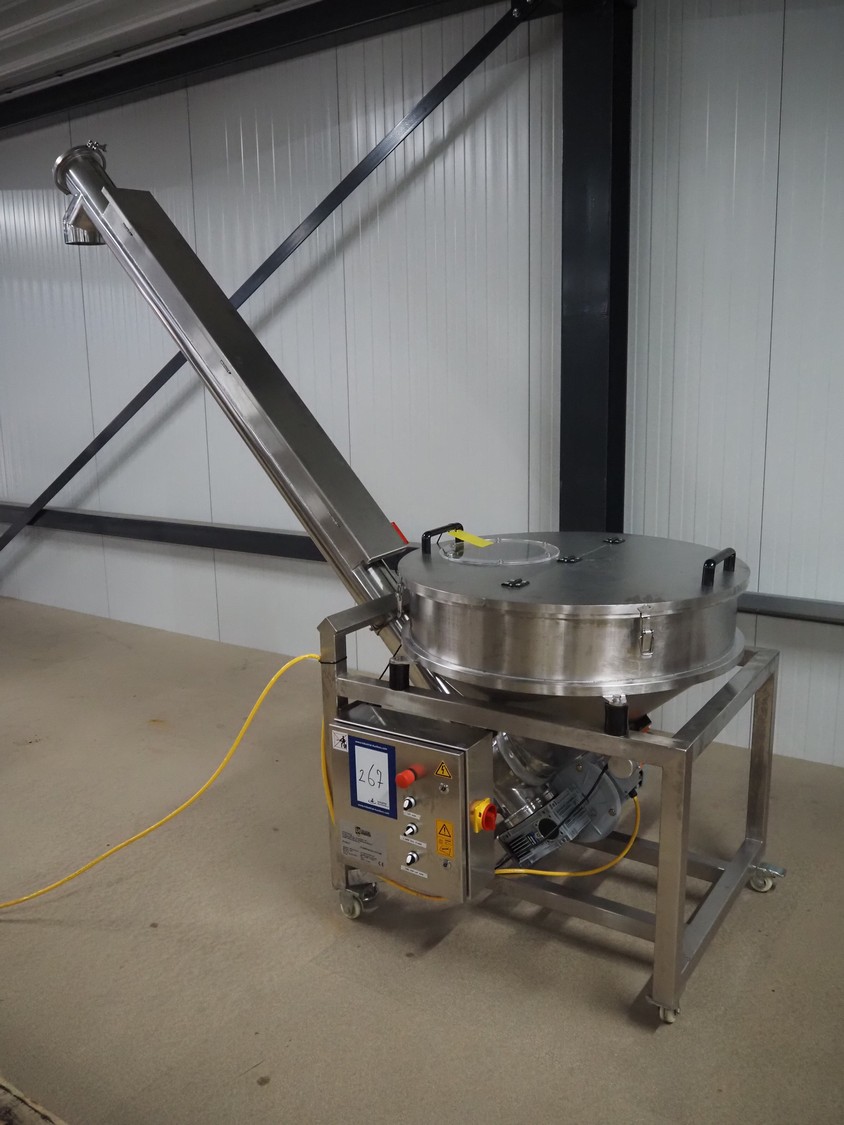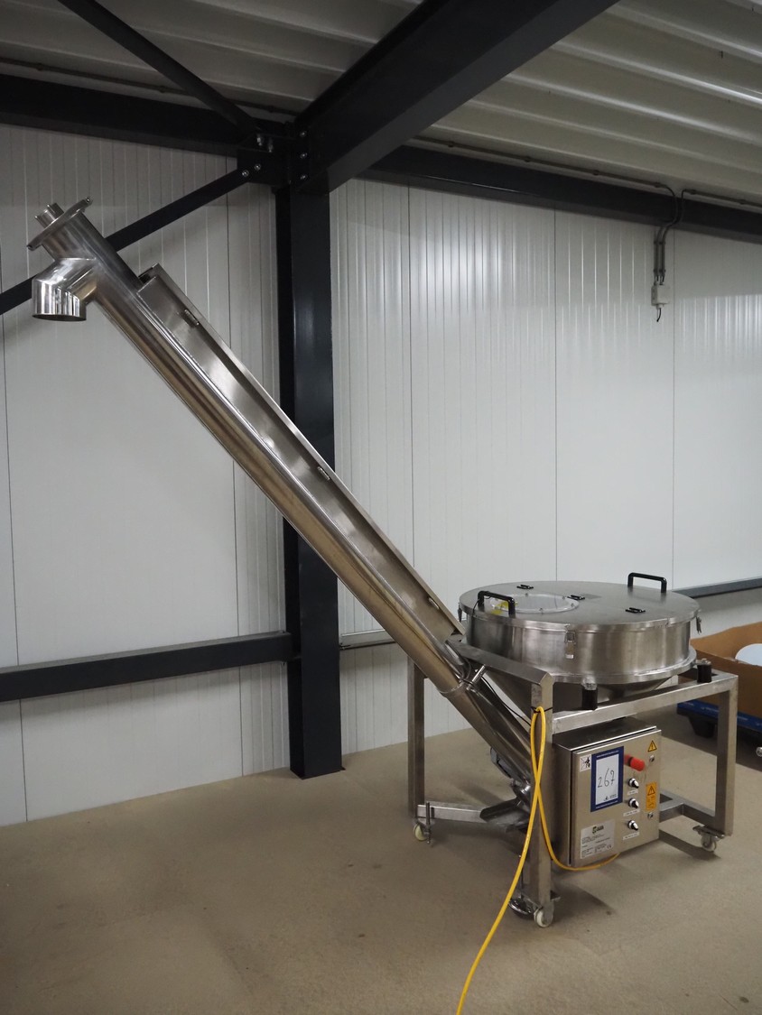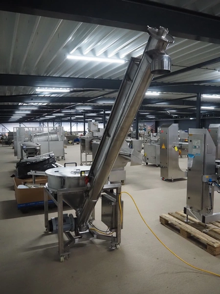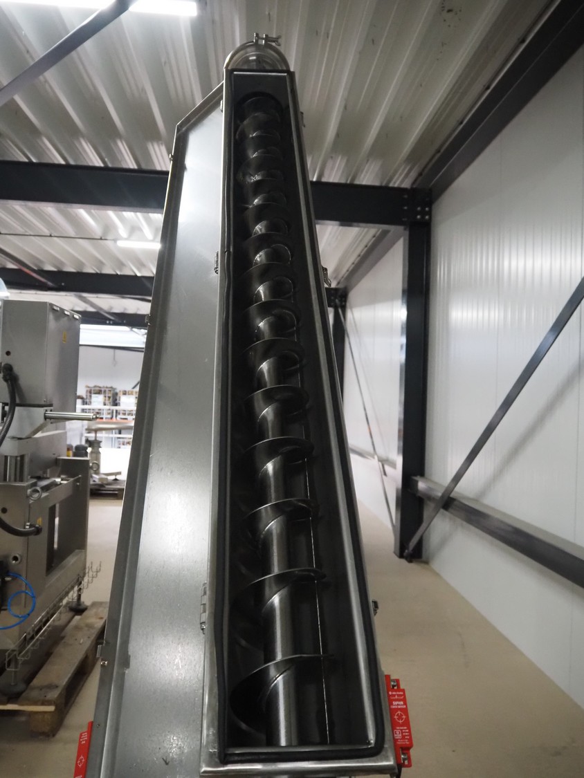 LH Packaging mobile elevating screw, type: Poederopvoer schroef, serial number: MP/18280/193340, year of construction: 2021, 400 V, 8 A, s/s screw, diameter screw: 130 mm, tier: 95 mm, elevating height: 1960 mm, total dimensions: 2380 mm x 940 mm x 2300 mm.