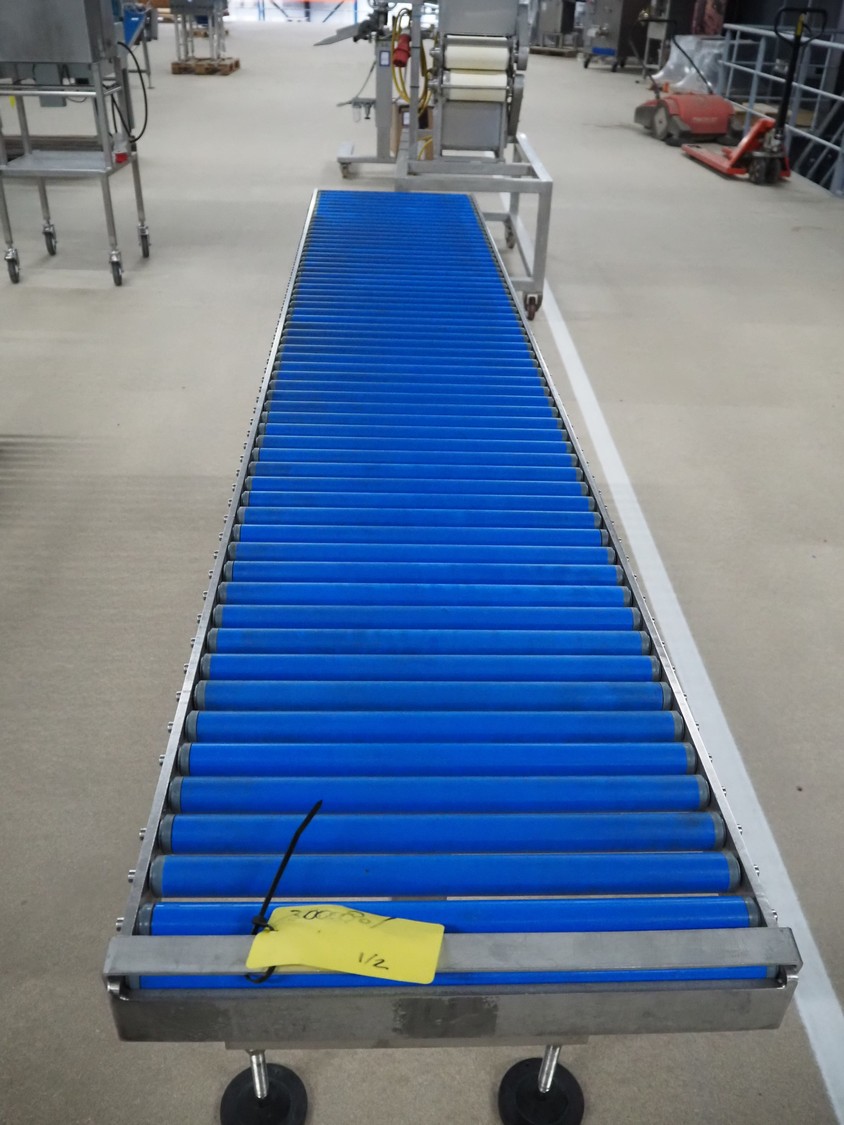 Roller conveyor, s/s frame, plastic rollers, roller width: 430 mm, total dimensions: 2500 mm x 500 mm x 800 mm.