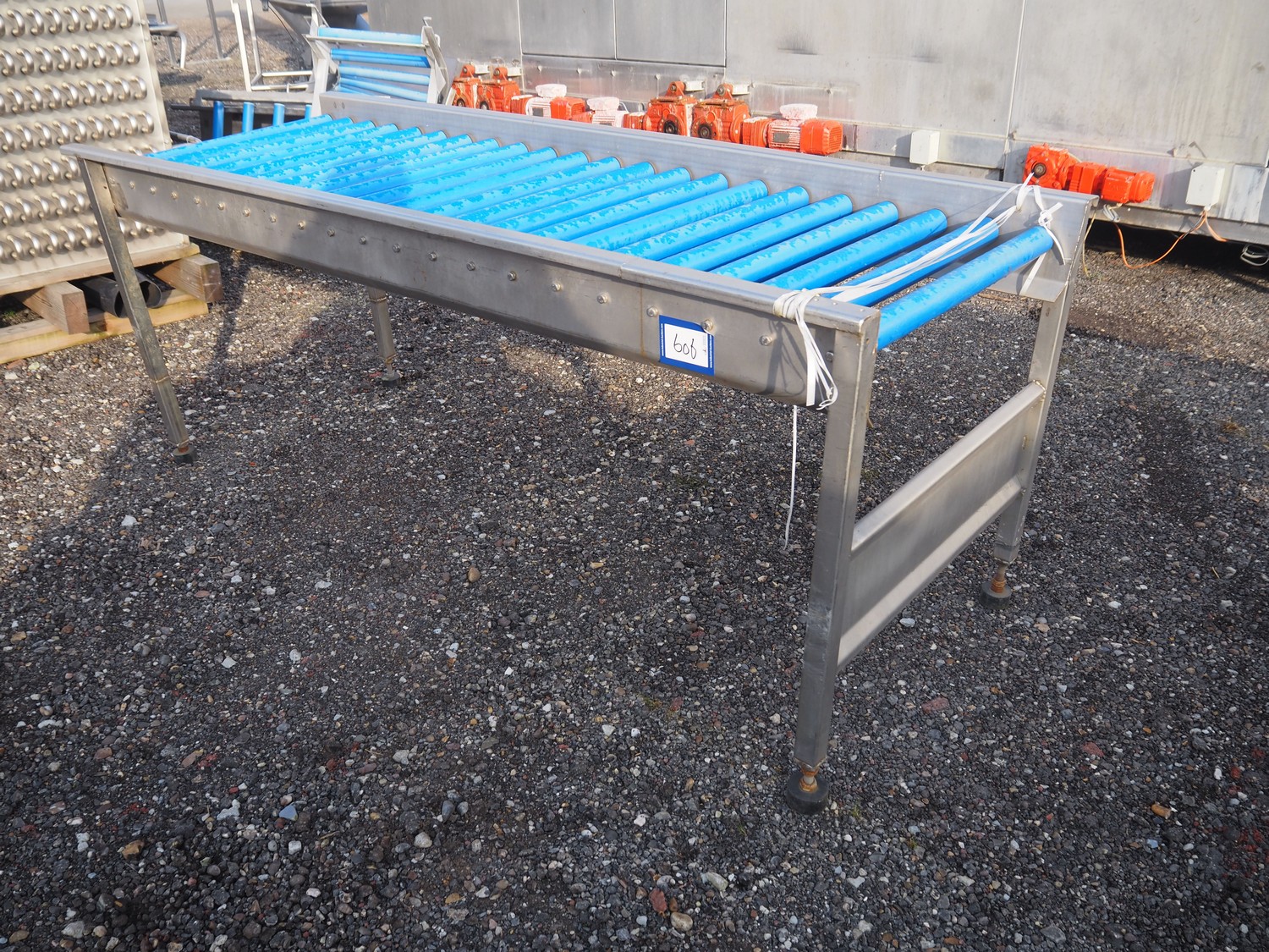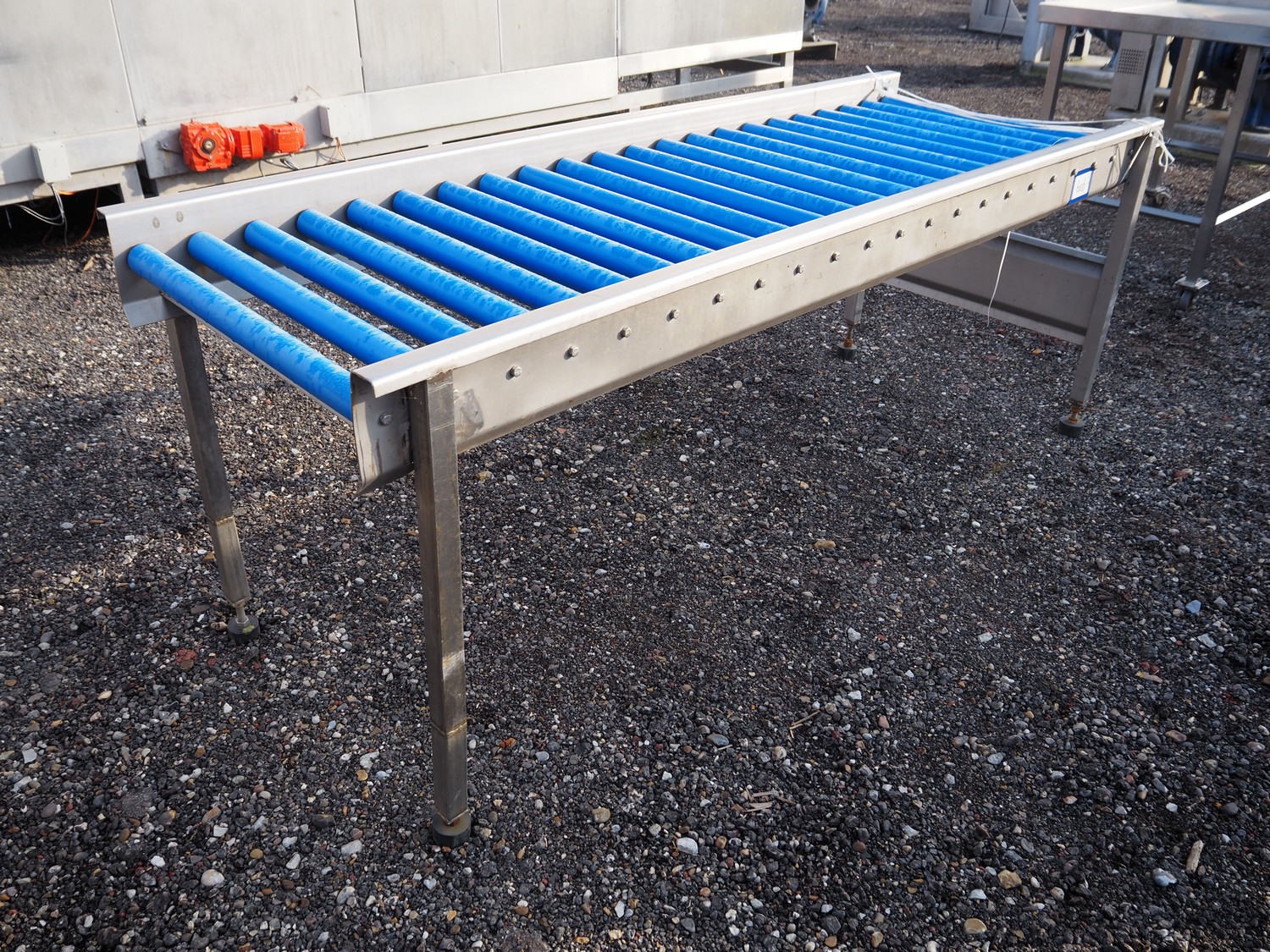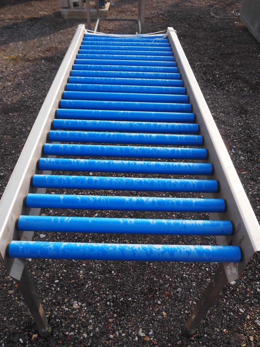 Roller conveyor, s/s frame, plastic rollers, roller width: 800 mm, total dimensions: 2200 mm x 800 mm x 840 mm.