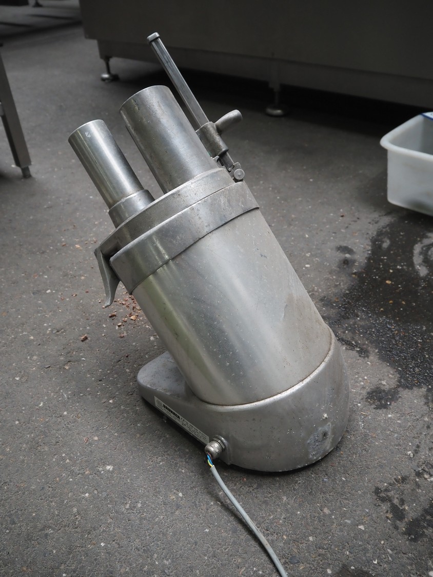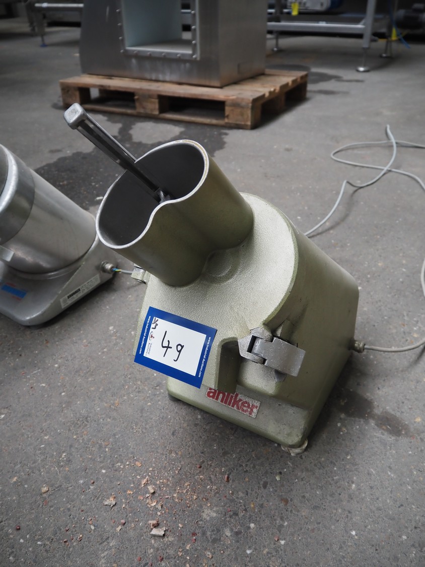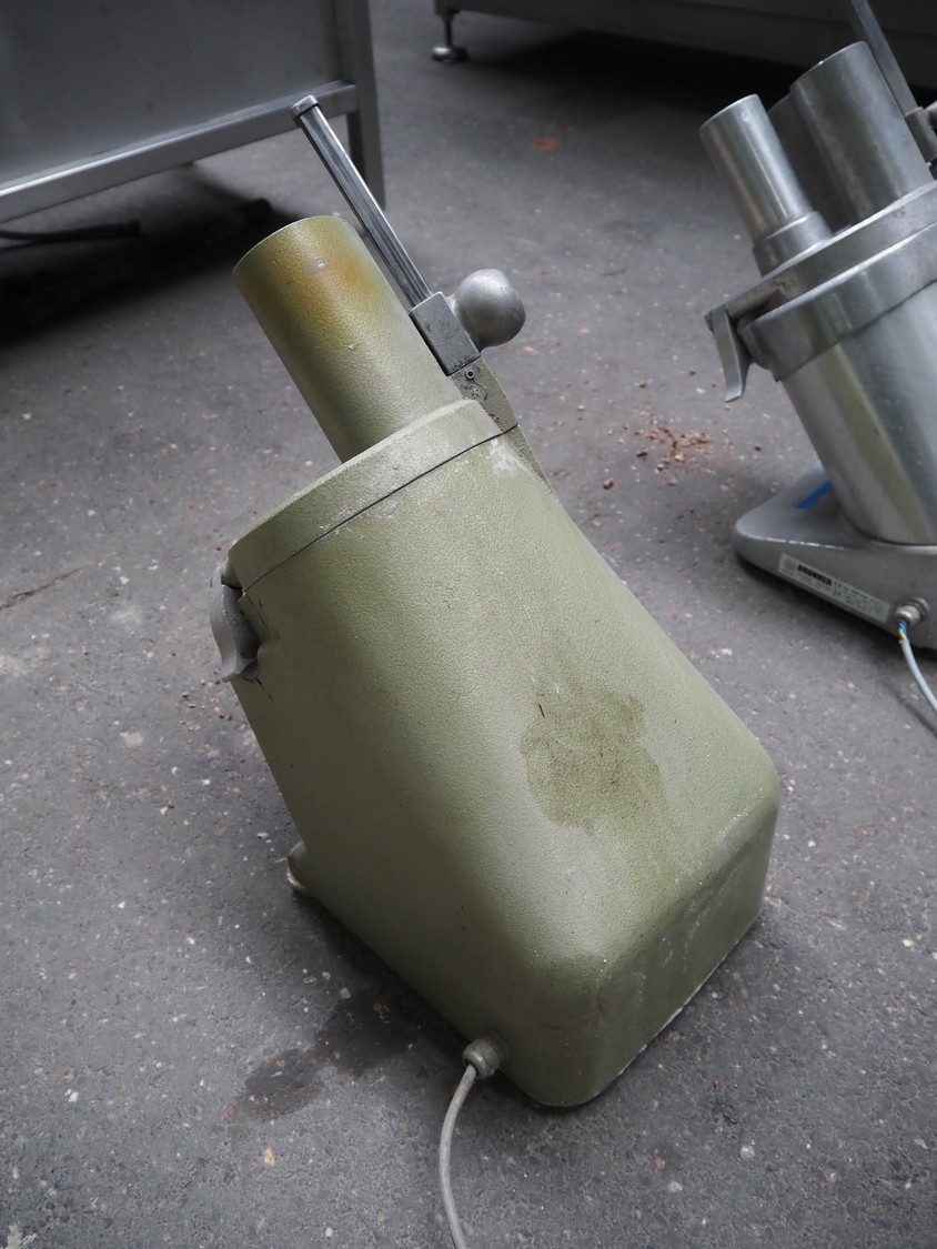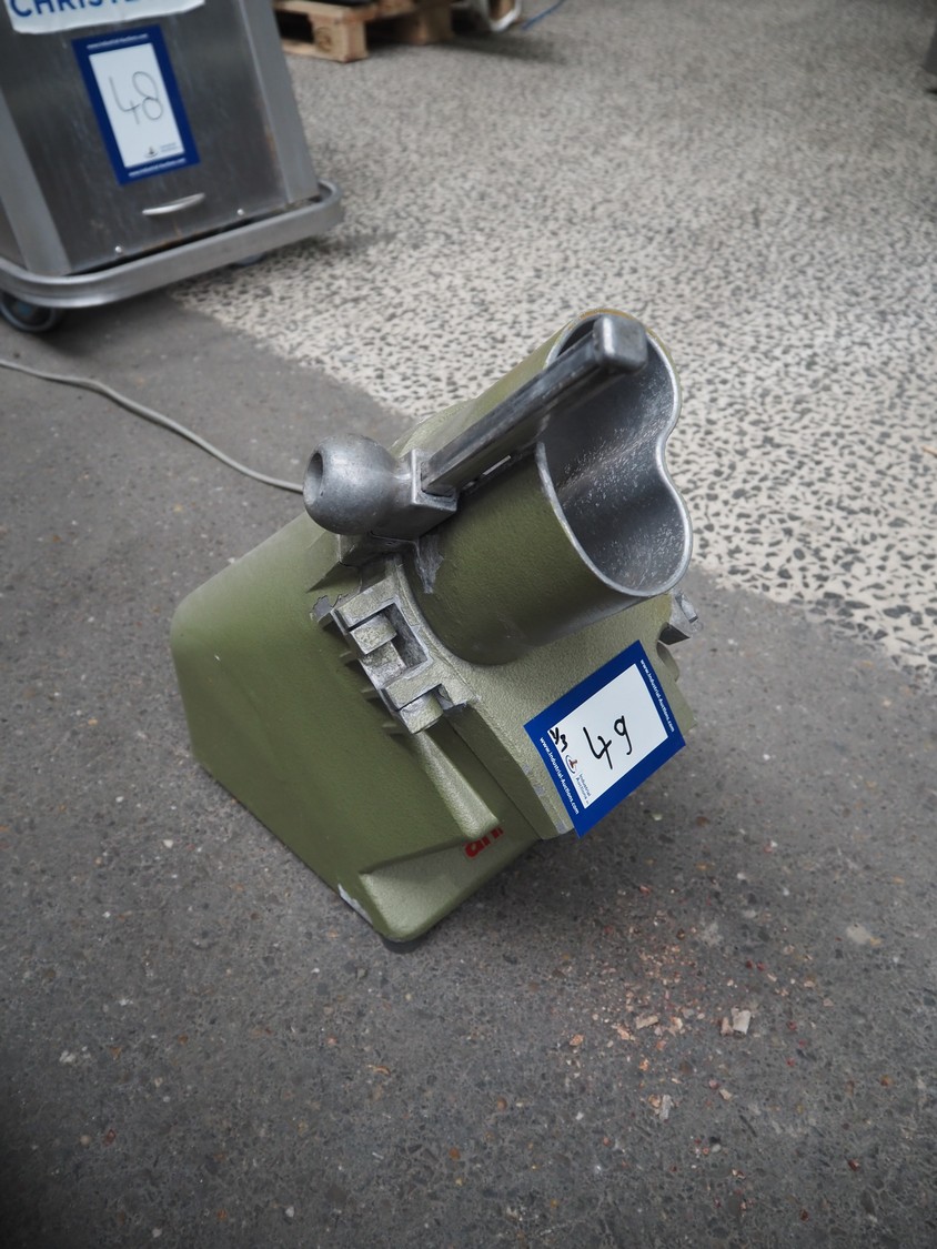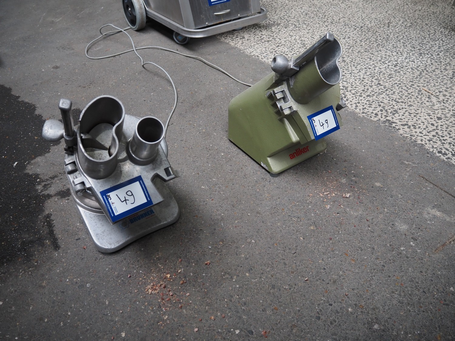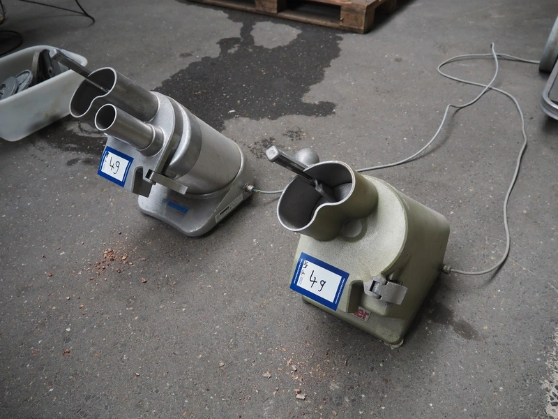 2 Brunner vegetable slicers, type: 1/77 S / GSM 4-SA, number: 28485 / 81711, 230 V, 1 Ph, 50 Hz, 1.8 A, 0.22 kW, dimensions: 450 mm x 300 mm x 570 mm and 450 mm x 250 mm x 520 mm. Including plastic crate with knives.