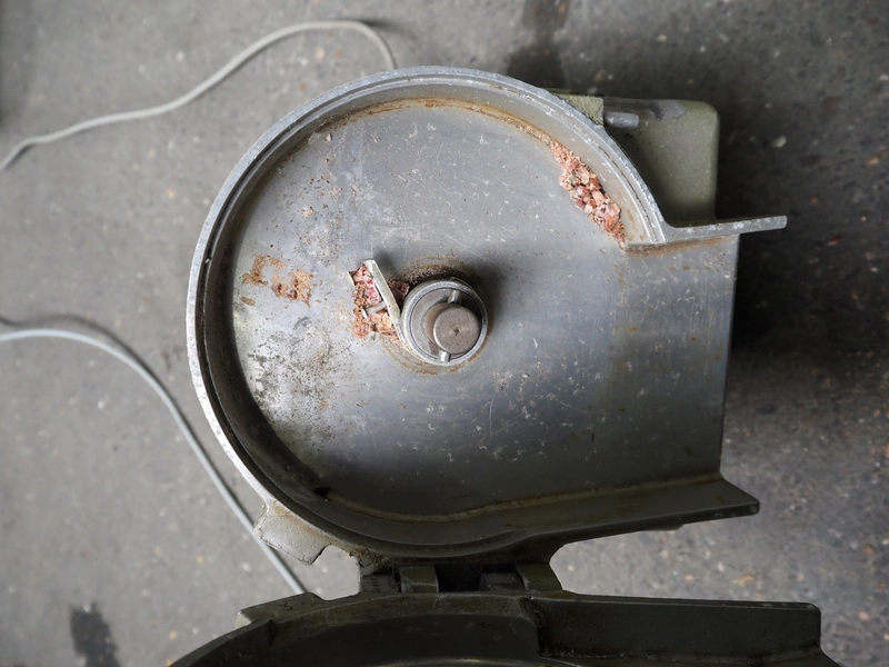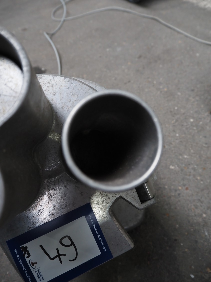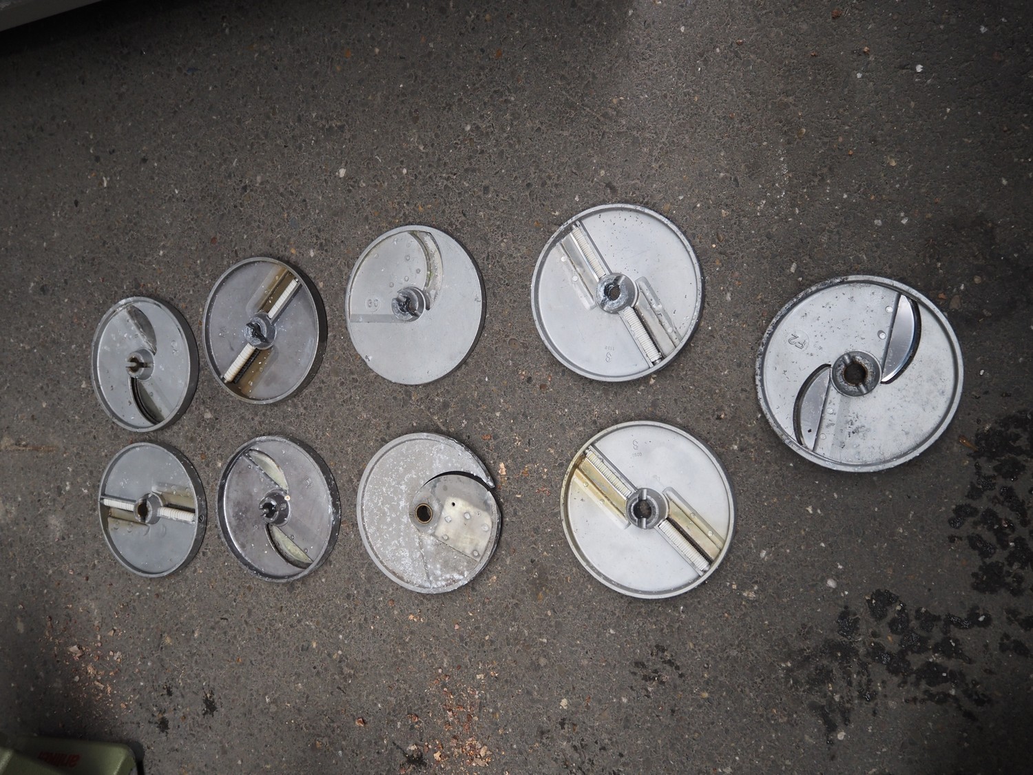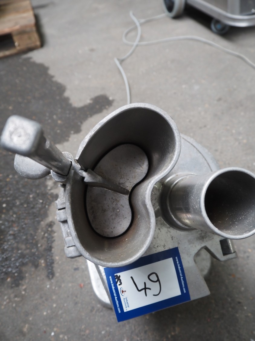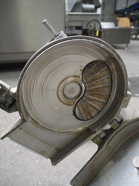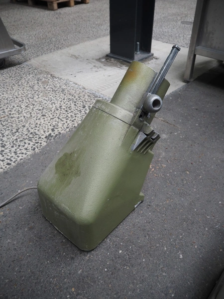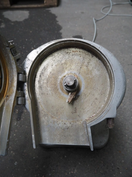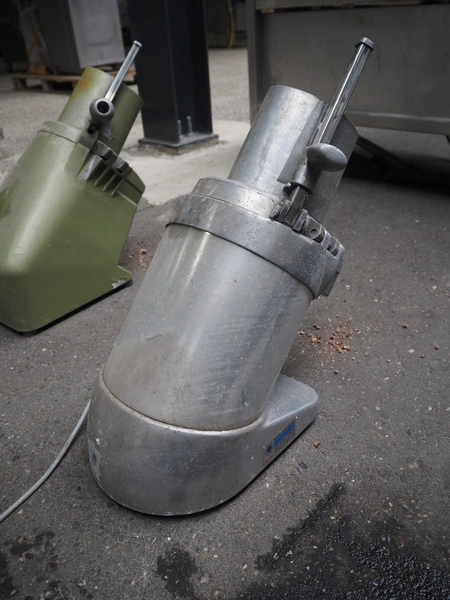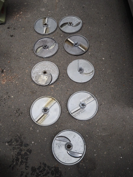 2 Brunner vegetable slicers, type: 1/77 S / GSM 4-SA, number: 28485 / 81711, 230 V, 1 Ph, 50 Hz, 1.8 A, 0.22 kW, dimensions: 450 mm x 300 mm x 570 mm and 450 mm x 250 mm x 520 mm. Including plastic crate with knives.