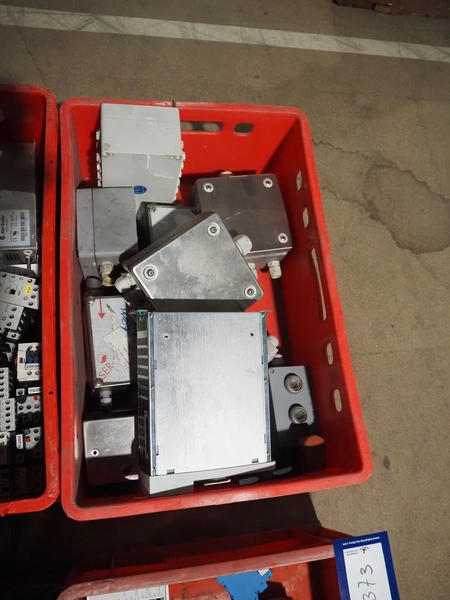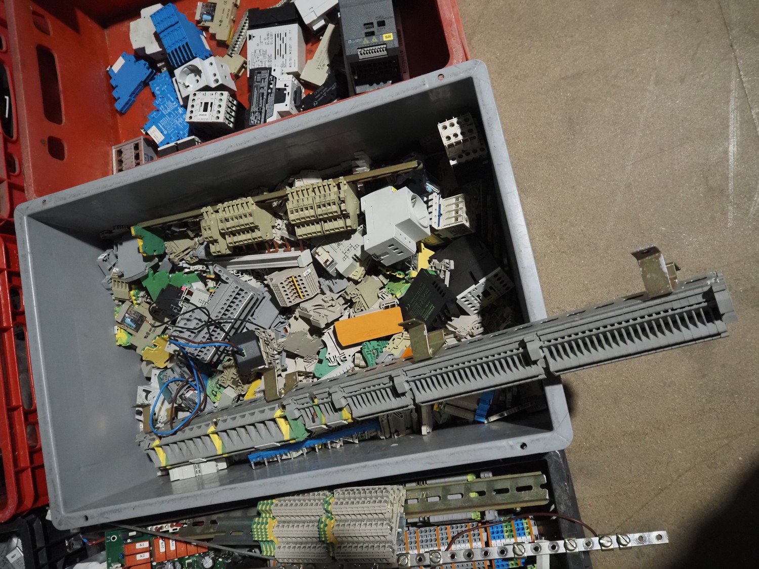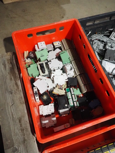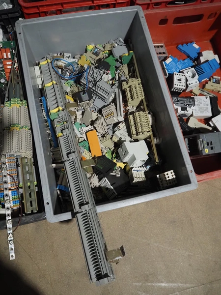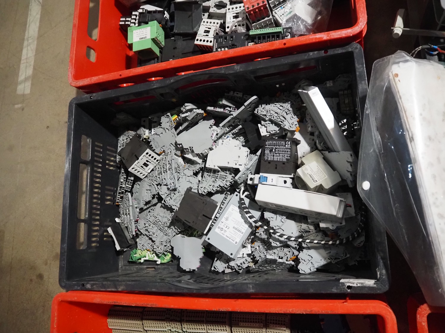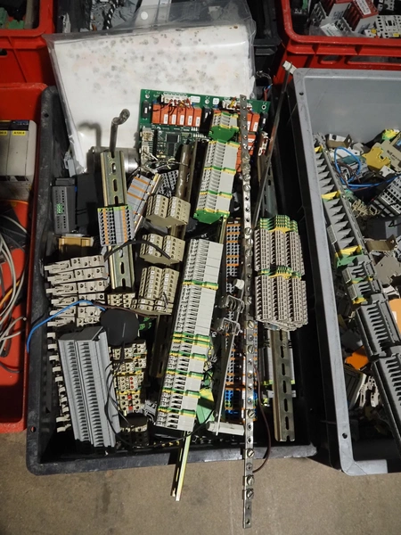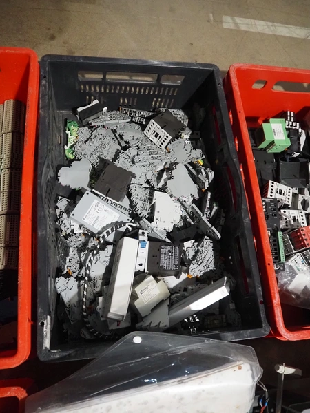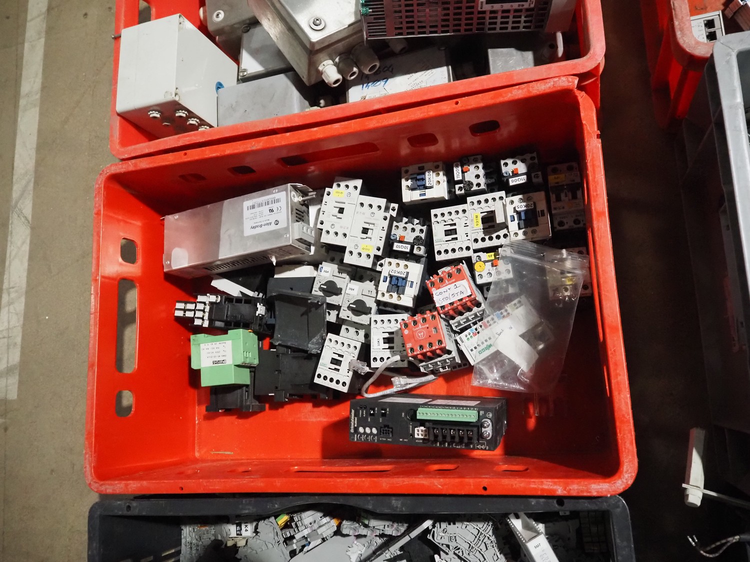 8 plastic crates with various electrical parts.