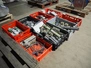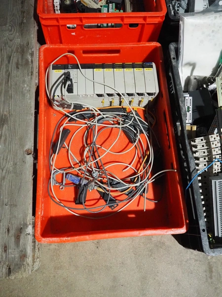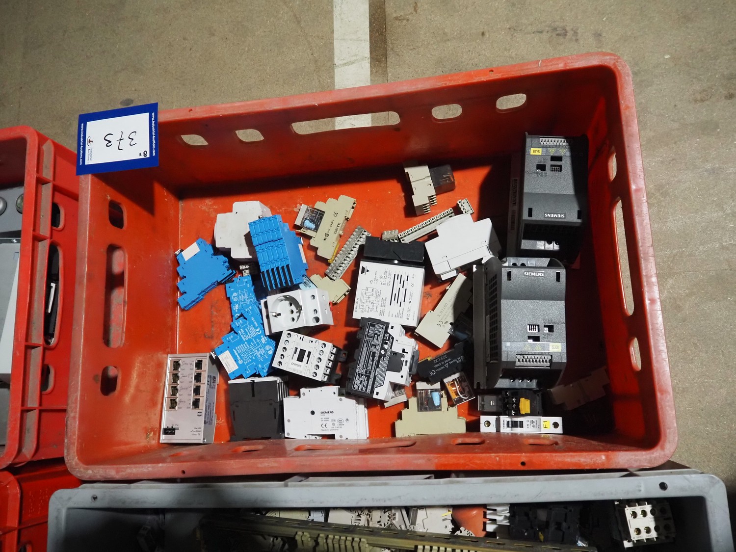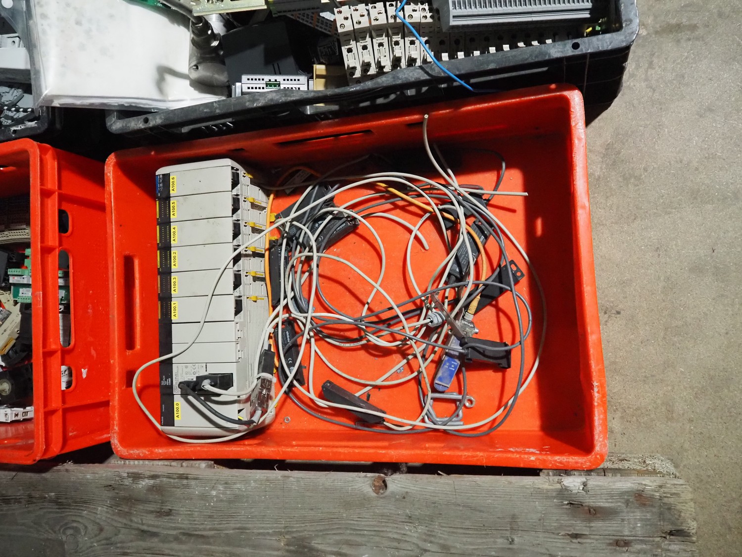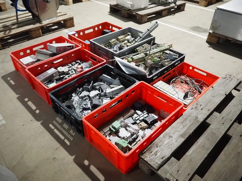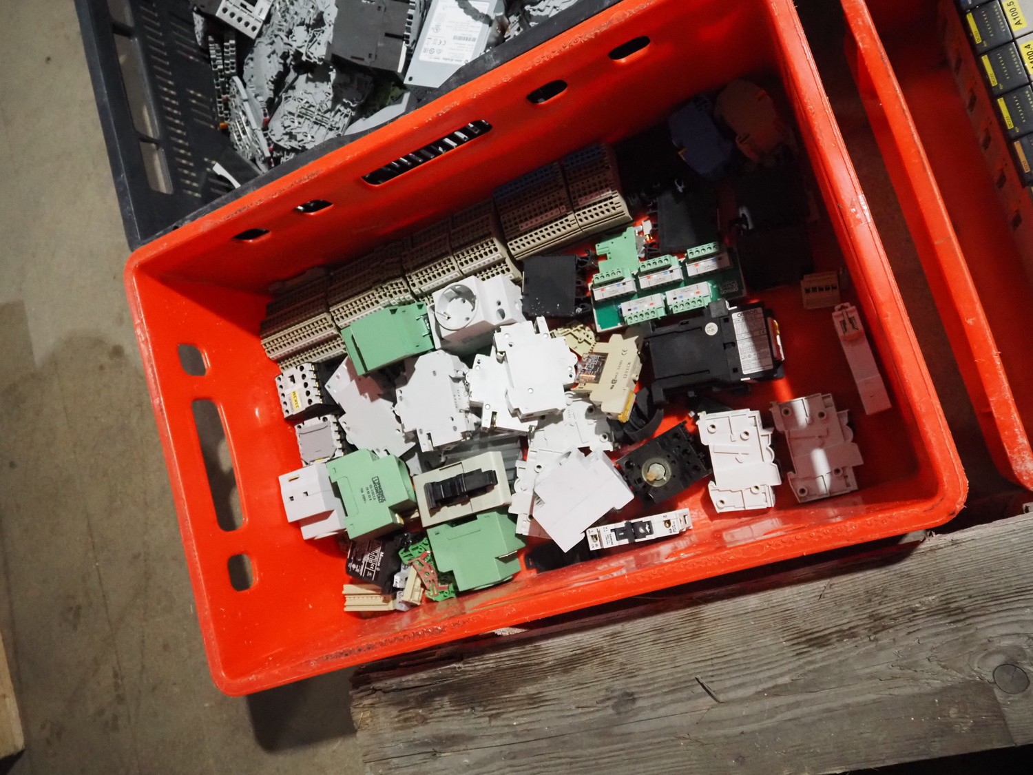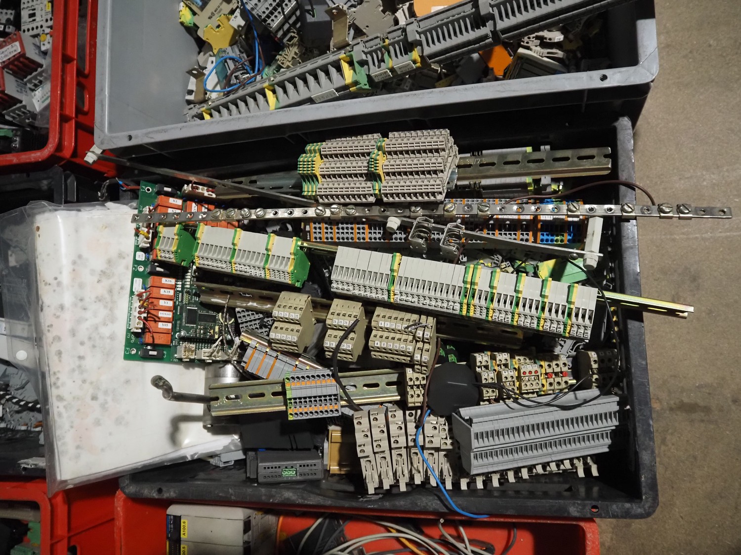 8 plastic crates with various electrical parts.