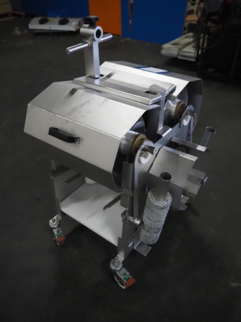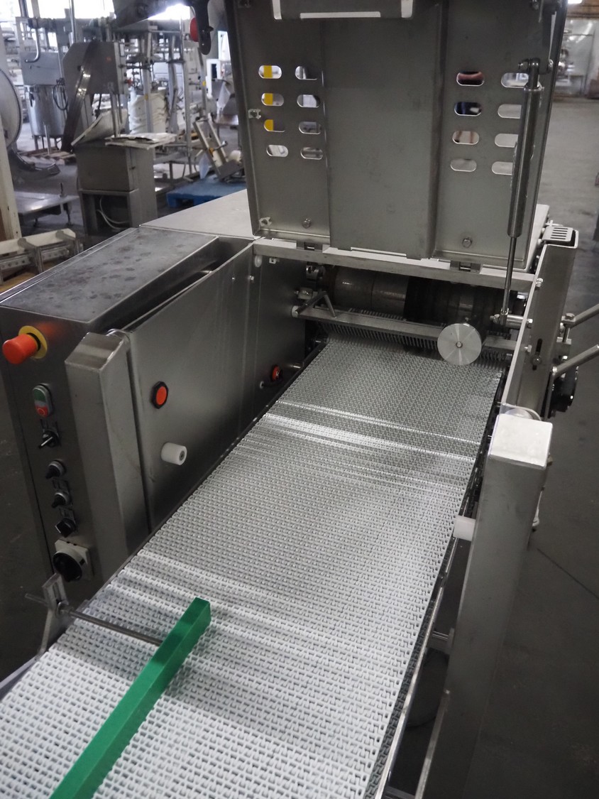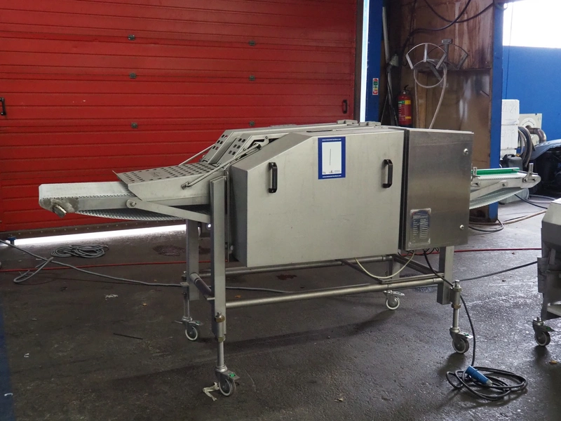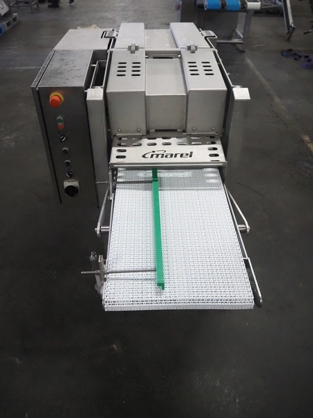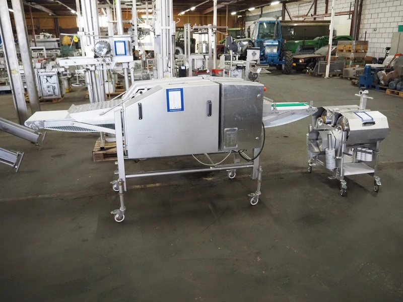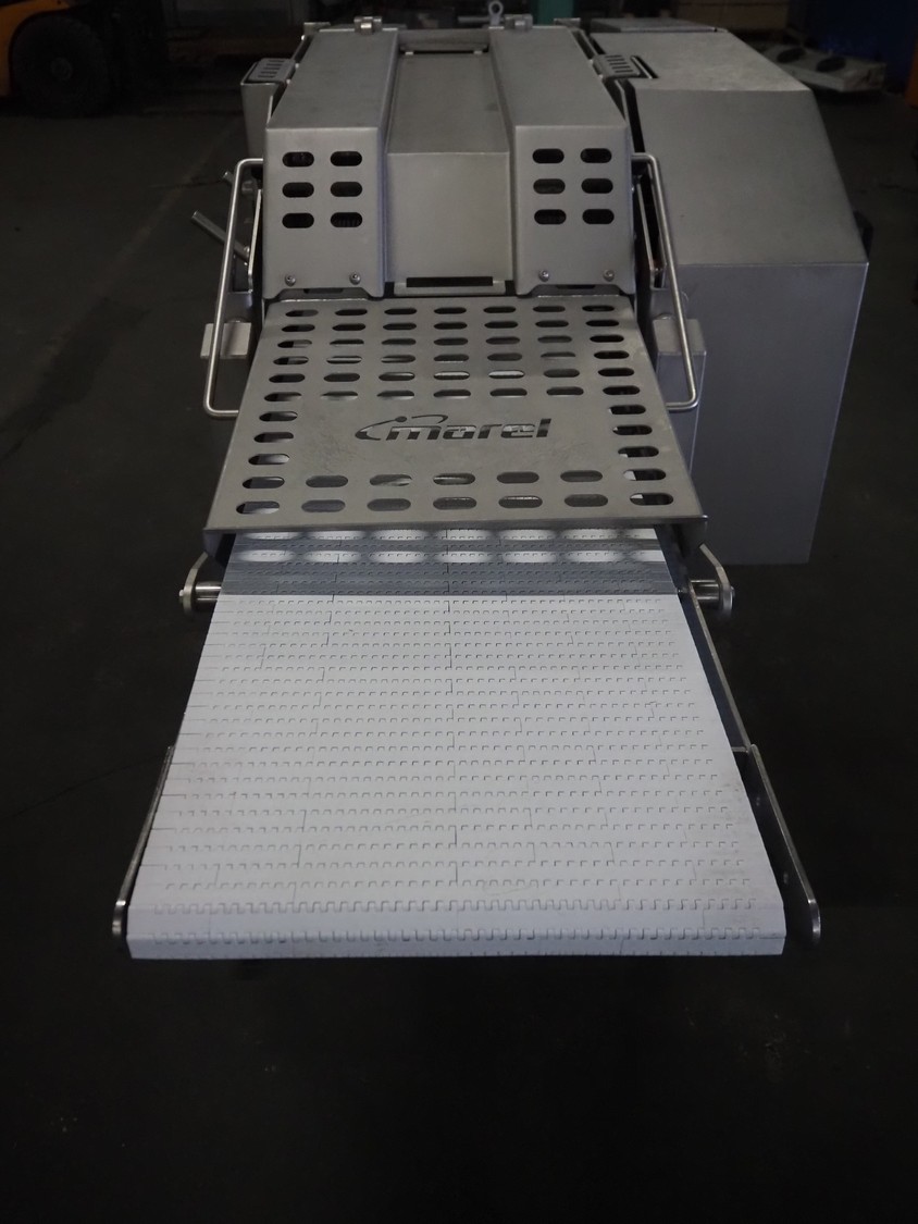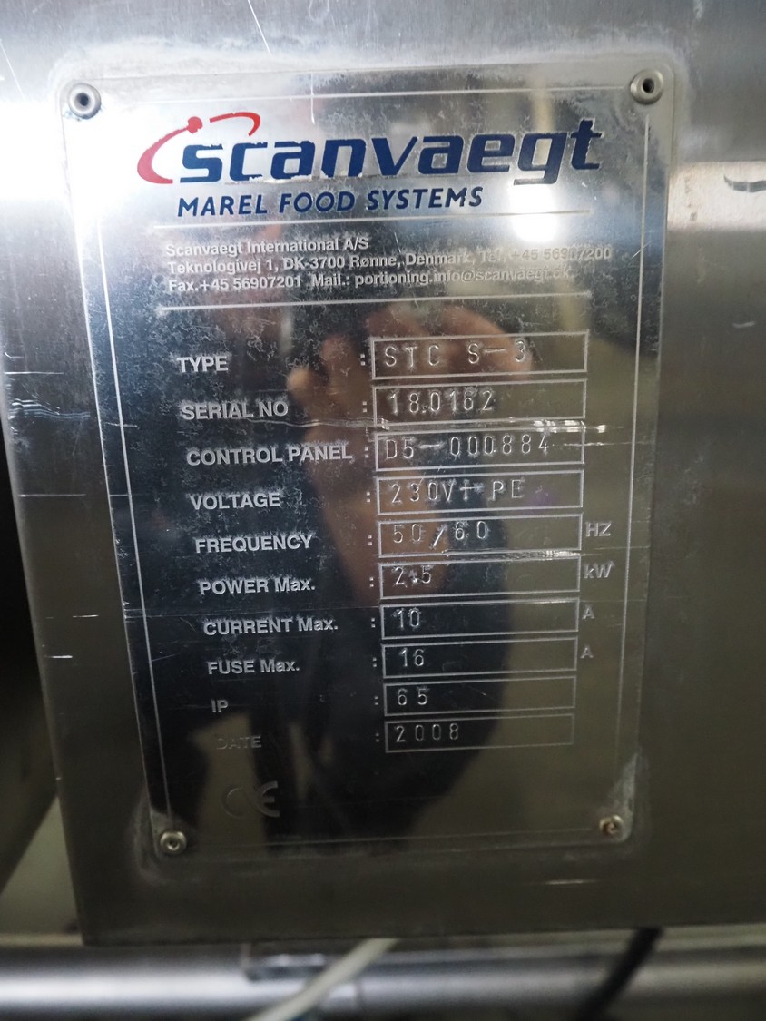 Scanvaegt Marel Food Systems mobile vertical slicer, type: STC S-3, serial number: 18.0162, year of construction: 2008, 230 V, 1 Ph, 50/60 Hz, 10/16 A, 2.5 kW, plastic mesh belt, belt width: 400 mm, distance between knives: 25 mm, total dimensions: 2900 mm x 900 mm x 1350 mm. Including s/s trolley with 2 extra knife sets, distance between knives: (1x) 30 mm, (1x) 18 mm, total dimensions: 850 mm x 800 mm x 1150 mm.