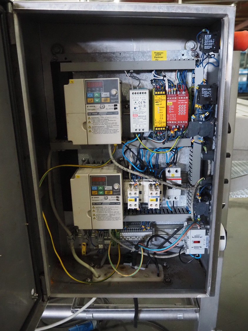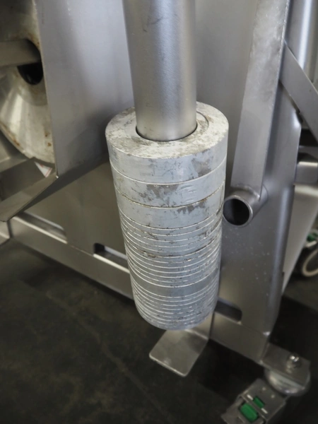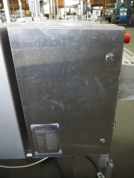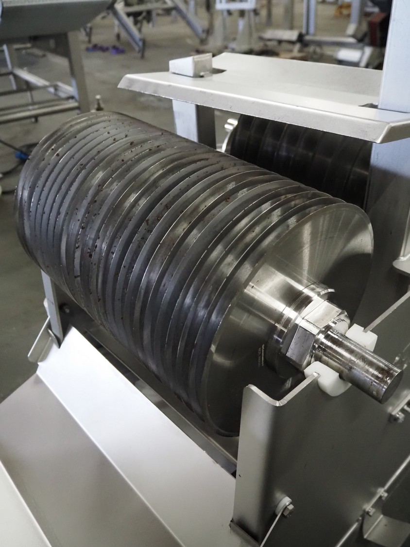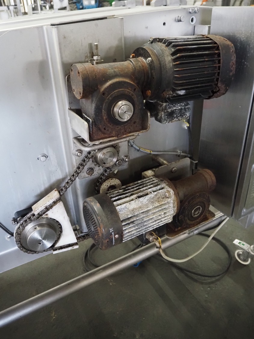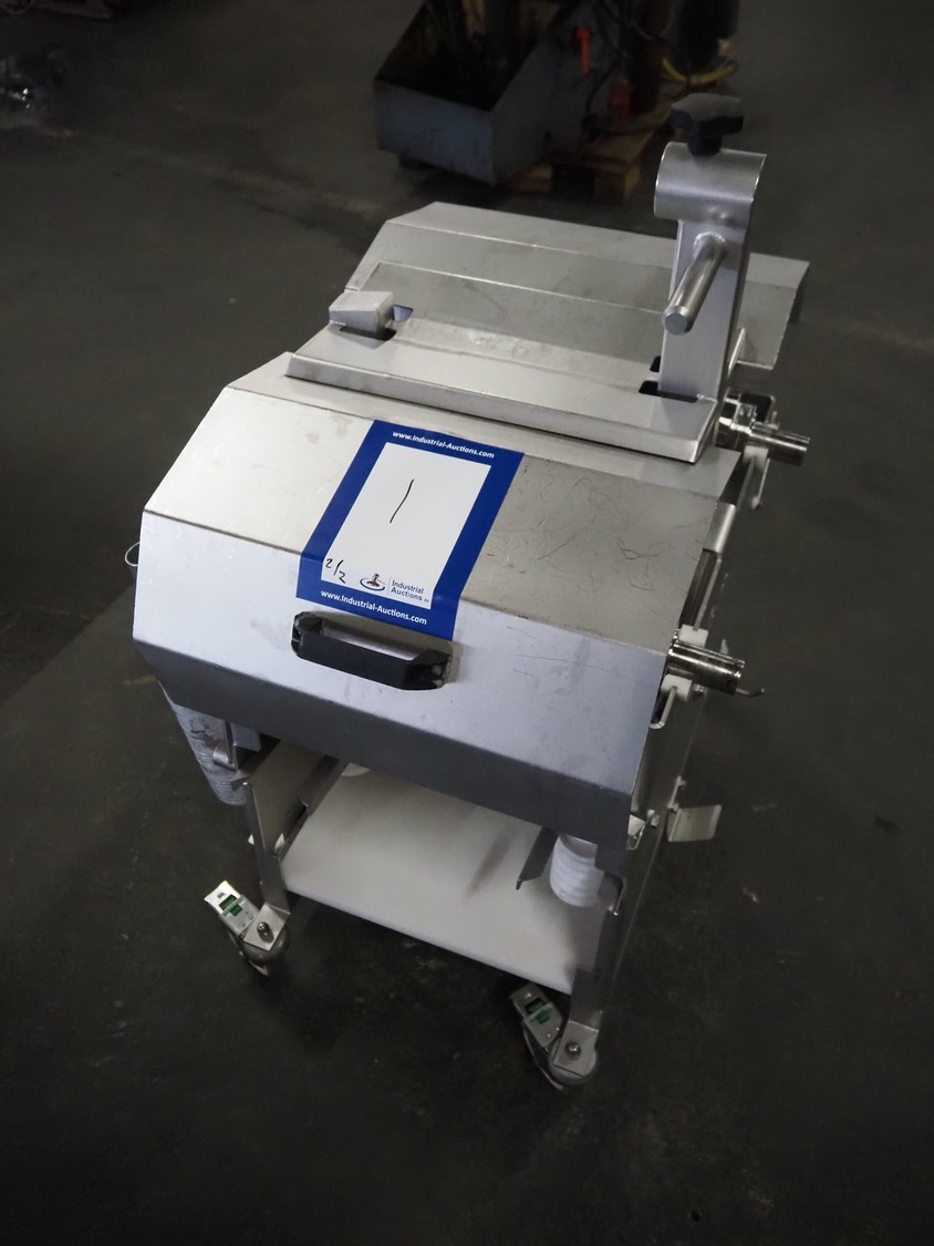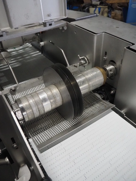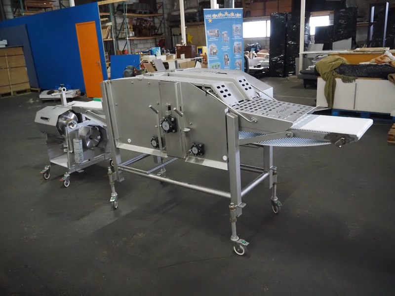 Scanvaegt Marel Food Systems mobile vertical slicer, type: STC S-3, serial number: 18.0162, year of construction: 2008, 230 V, 1 Ph, 50/60 Hz, 10/16 A, 2.5 kW, plastic mesh belt, belt width: 400 mm, distance between knives: 25 mm, total dimensions: 2900 mm x 900 mm x 1350 mm. Including s/s trolley with 2 extra knife sets, distance between knives: (1x) 30 mm, (1x) 18 mm, total dimensions: 850 mm x 800 mm x 1150 mm.