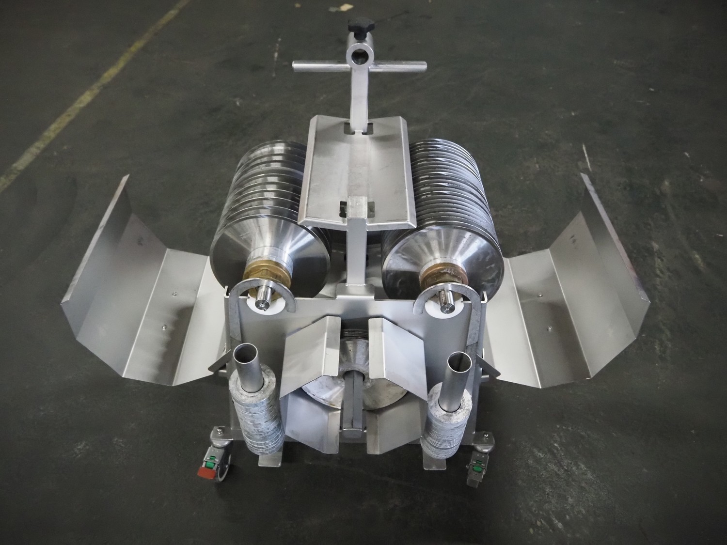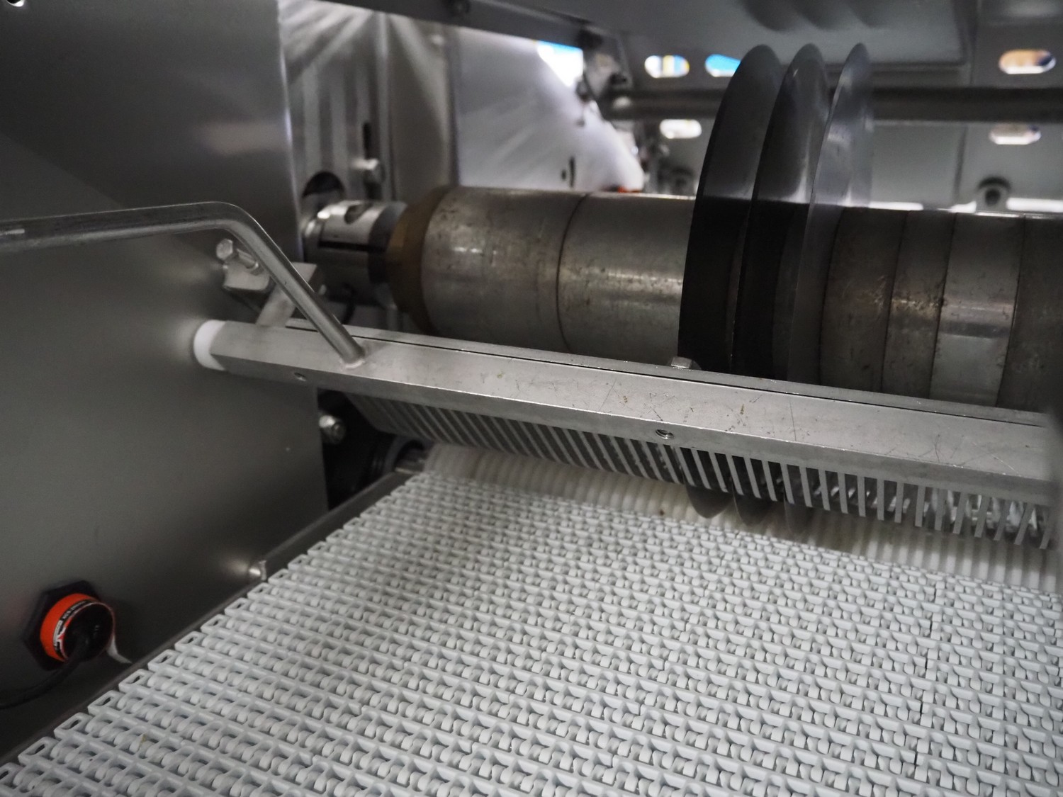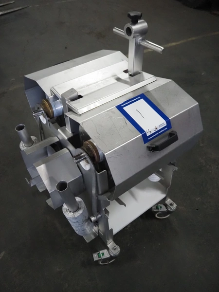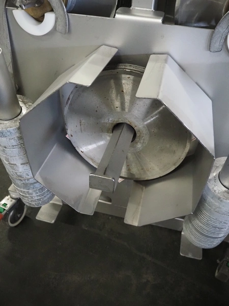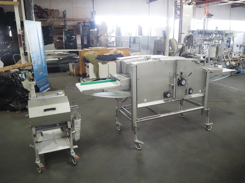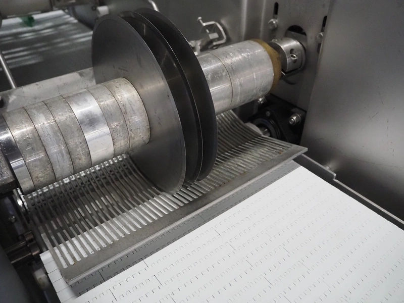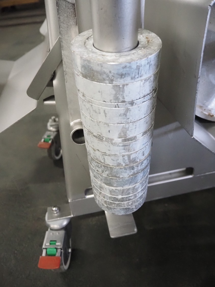 Scanvaegt Marel Food Systems mobile vertical slicer, type: STC S-3, serial number: 18.0162, year of construction: 2008, 230 V, 1 Ph, 50/60 Hz, 10/16 A, 2.5 kW, plastic mesh belt, belt width: 400 mm, distance between knives: 25 mm, total dimensions: 2900 mm x 900 mm x 1350 mm. Including s/s trolley with 2 extra knife sets, distance between knives: (1x) 30 mm, (1x) 18 mm, total dimensions: 850 mm x 800 mm x 1150 mm.