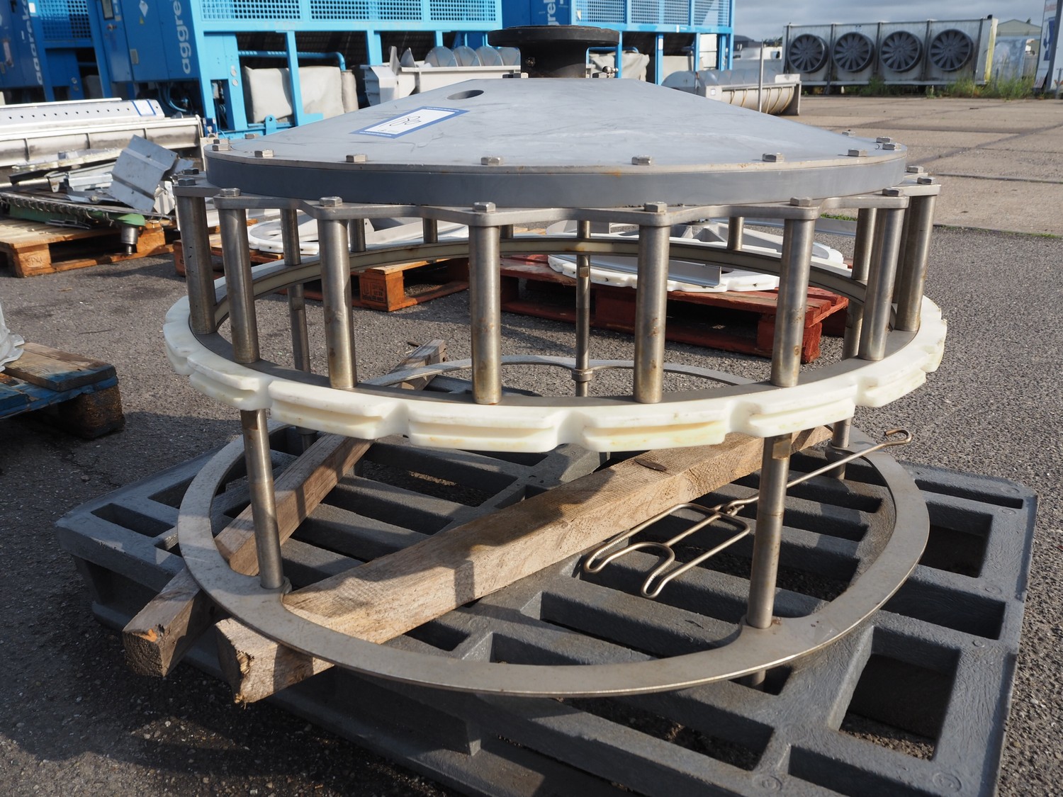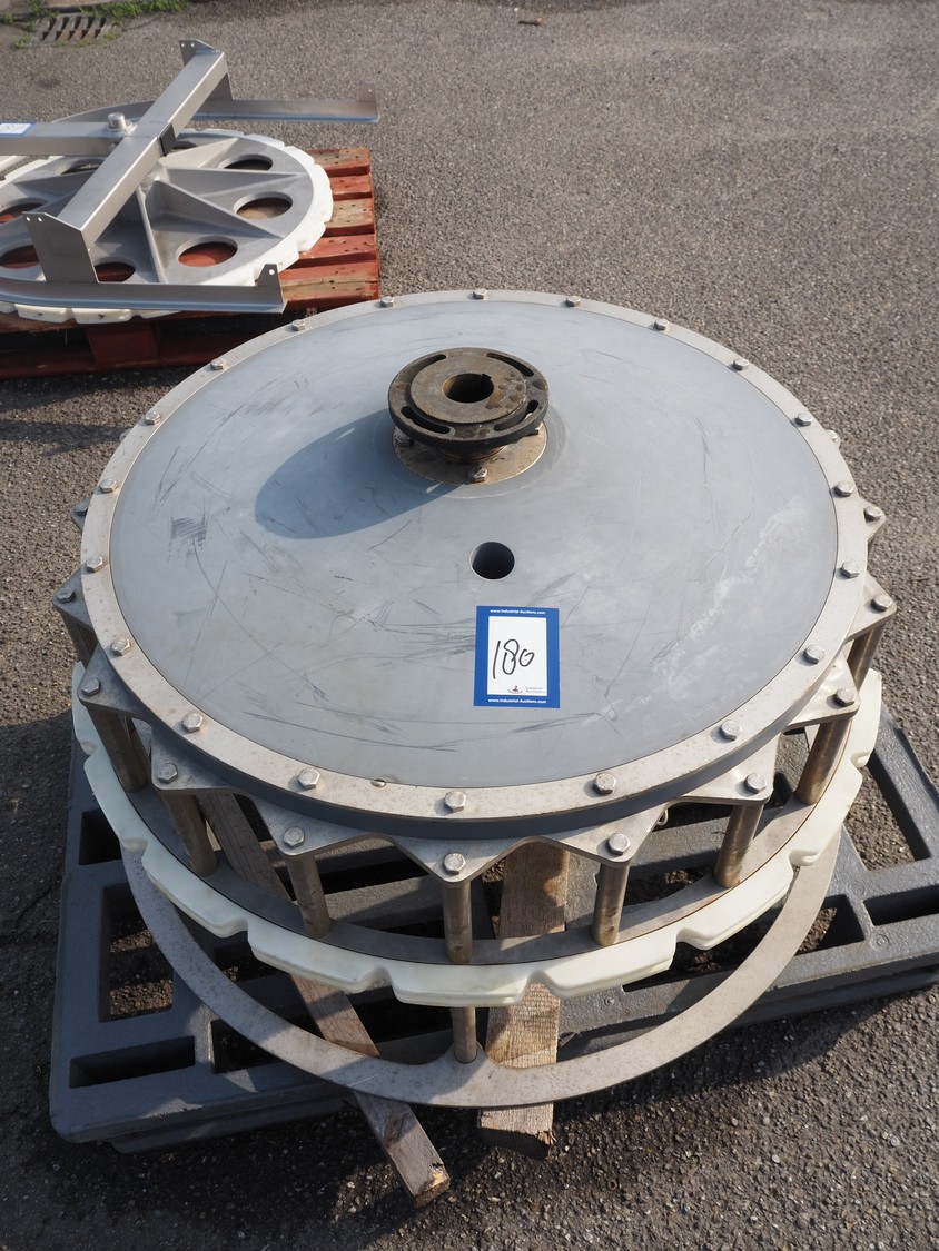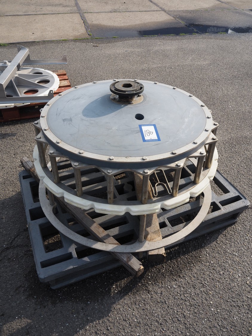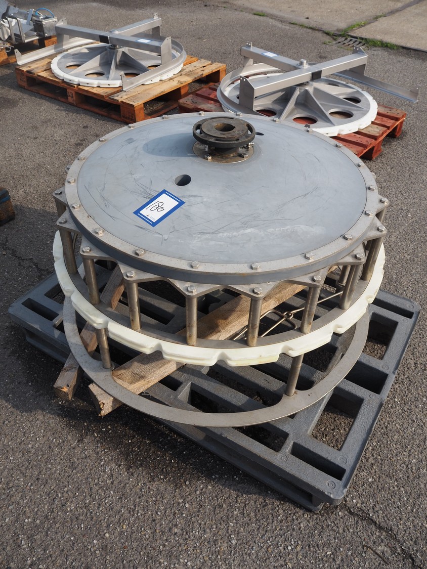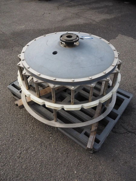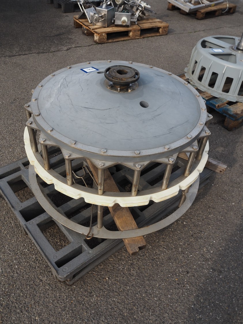 Meyn machine drive wheel, diameter: 900 mm, total dimensions: 900 mm x 900 mm x 600 mm.