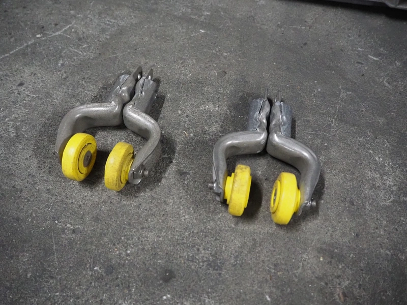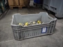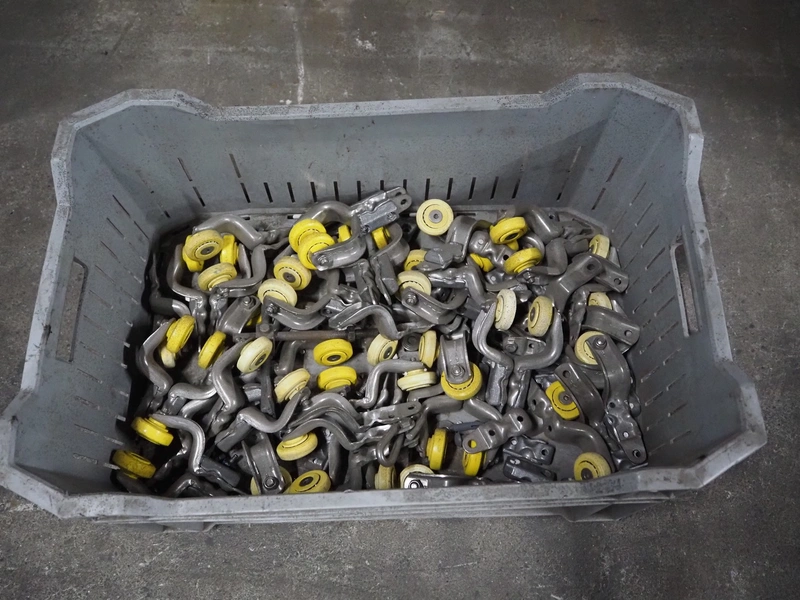 Crate with various trolleys for tube track, dimensions: 600 mm x 400 mm x 200 mm.
