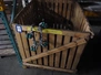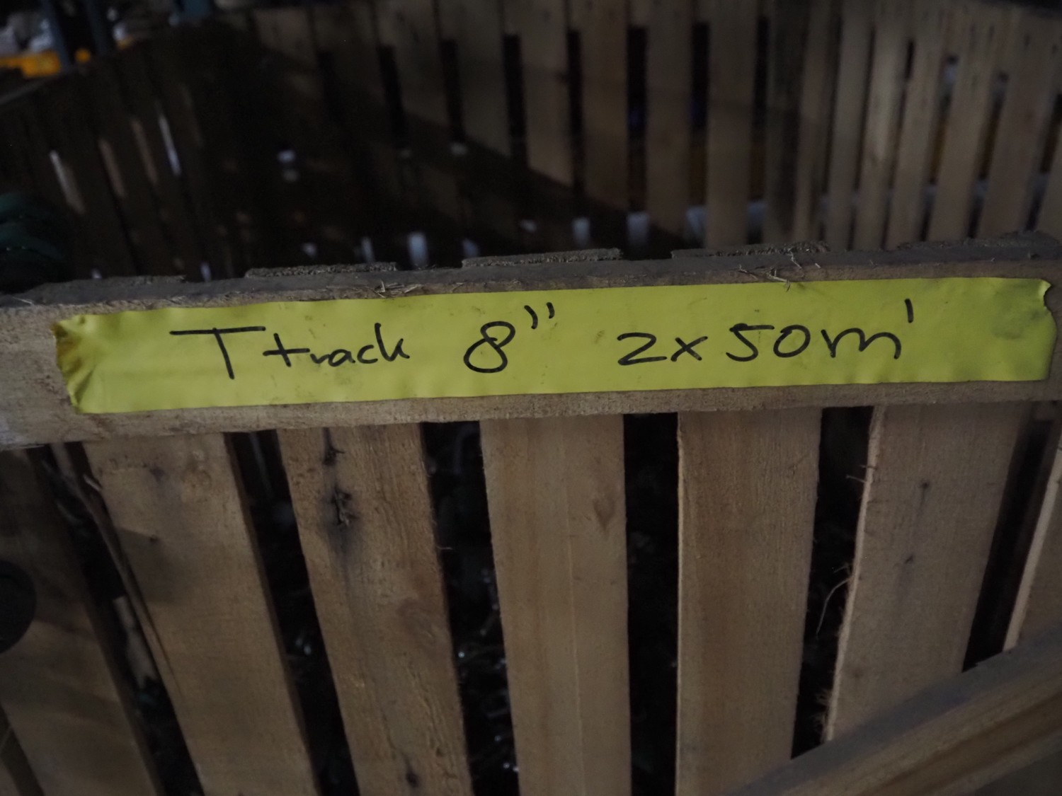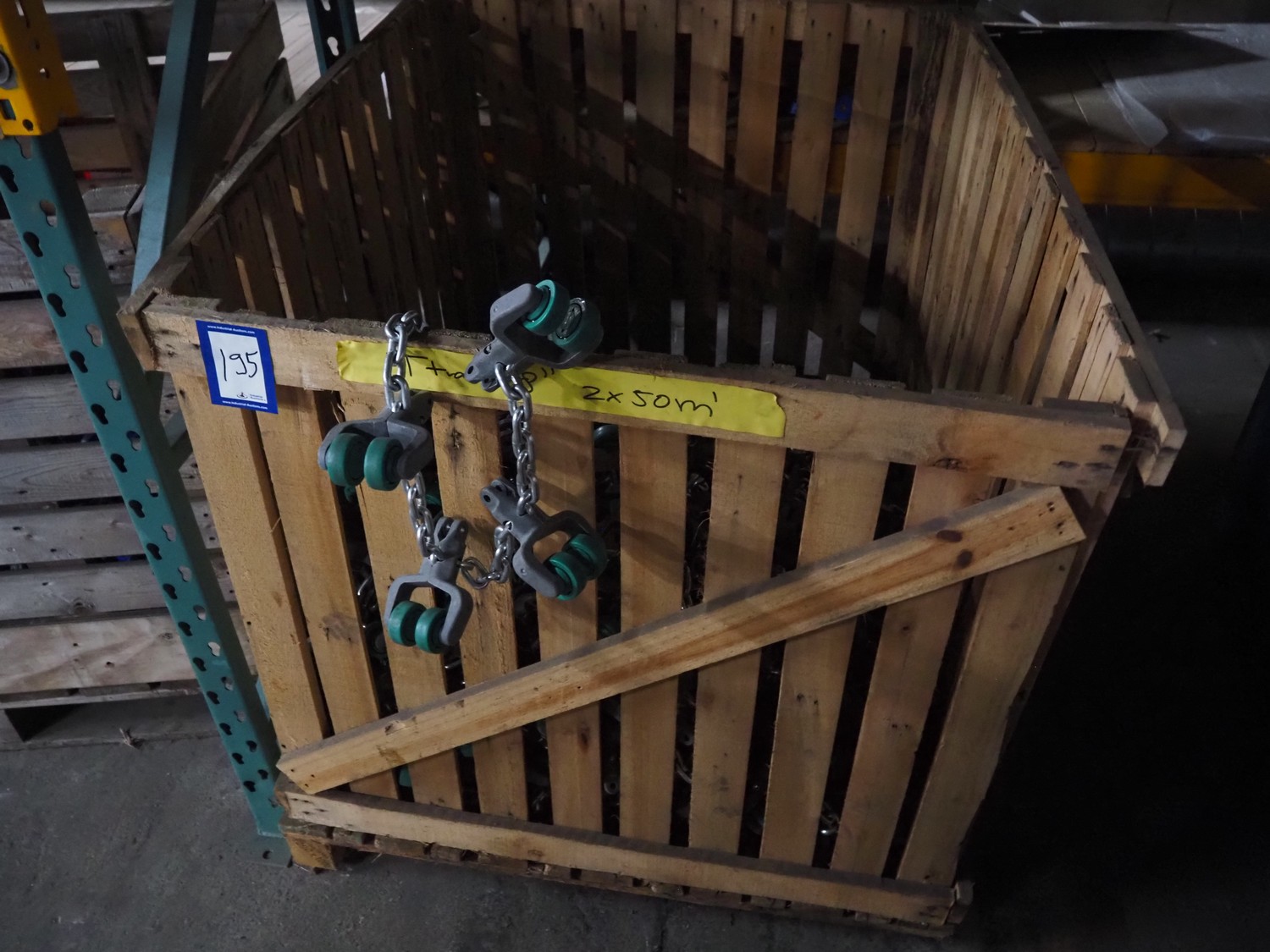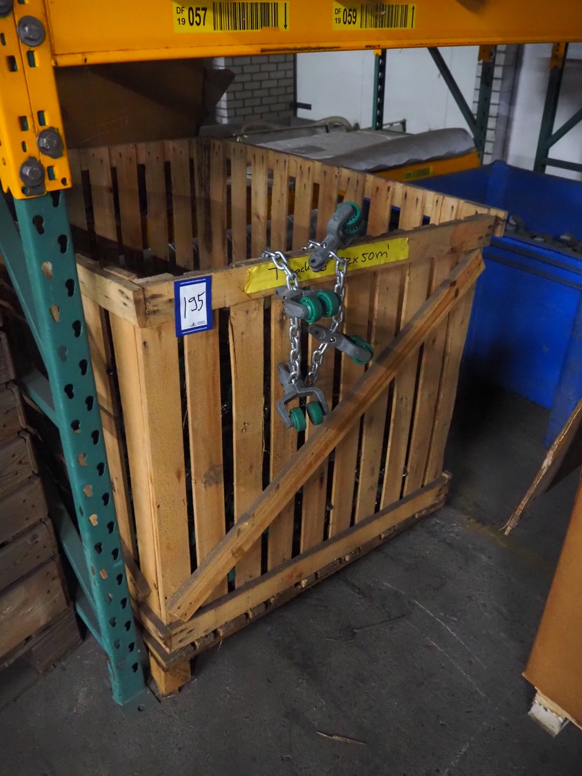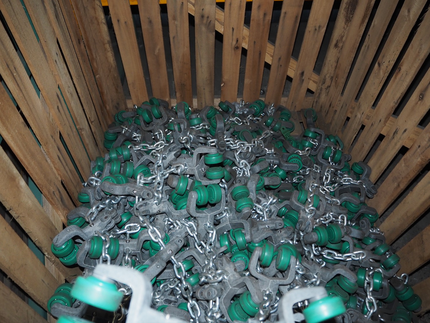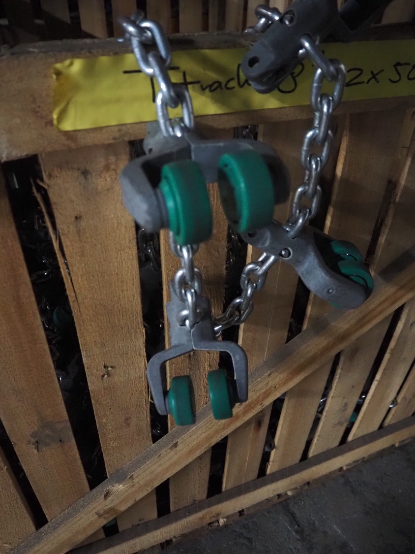 Pallet box with large amount of Meyn trolleys on tube track, T-track, (2x) 50 meters, dimensions: 1300 mm x 1200 mm x 900 mm.