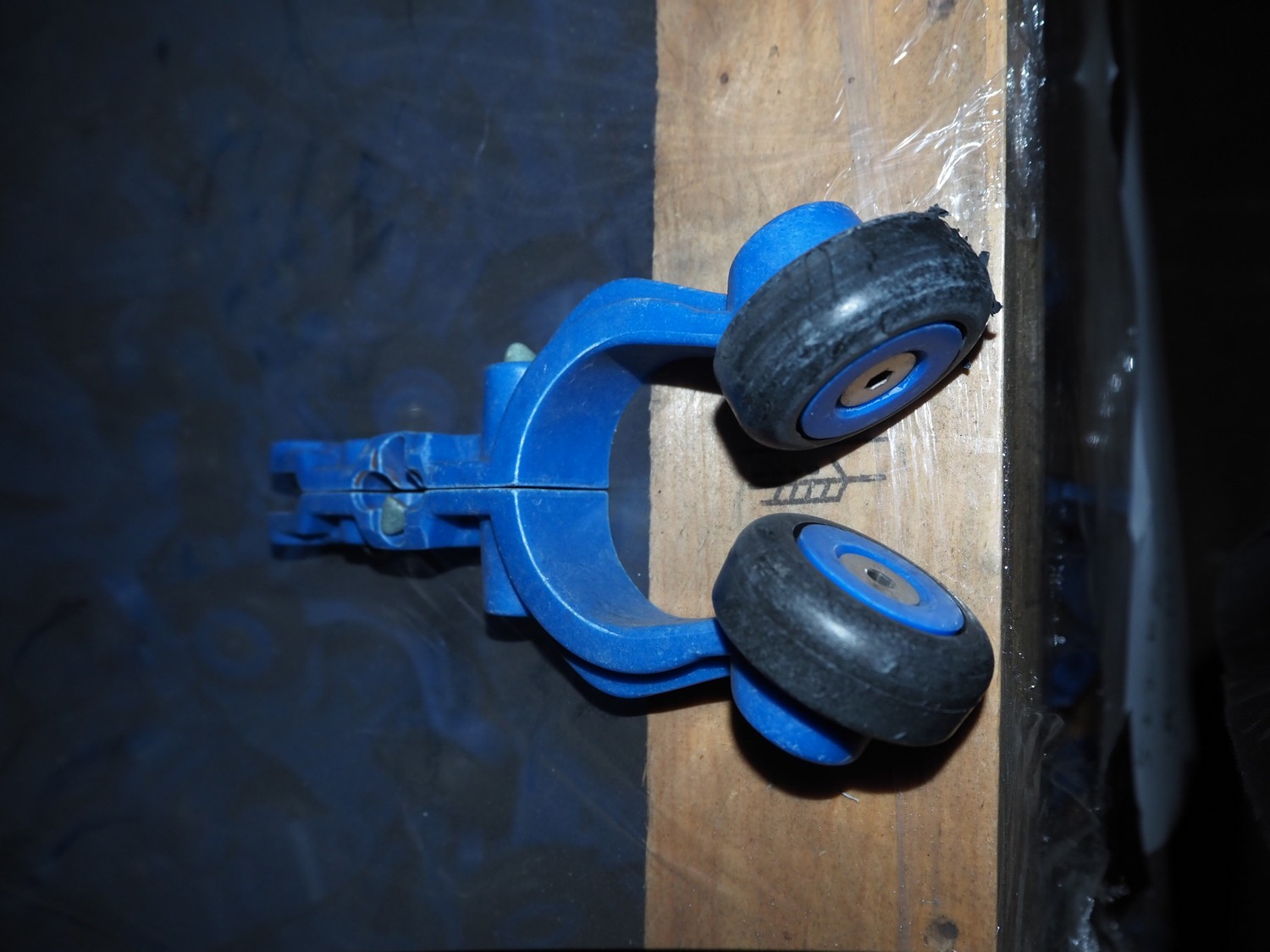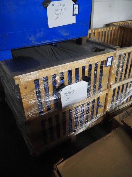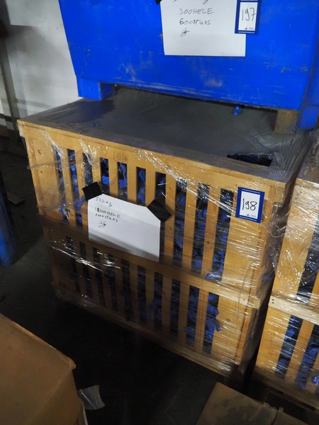 Crate with large amount Foodmate trolleys for tube track, 1800 pairs, weight: 522 kg, dimensions: 1300 mm x 1200 mm x 900 mm.