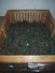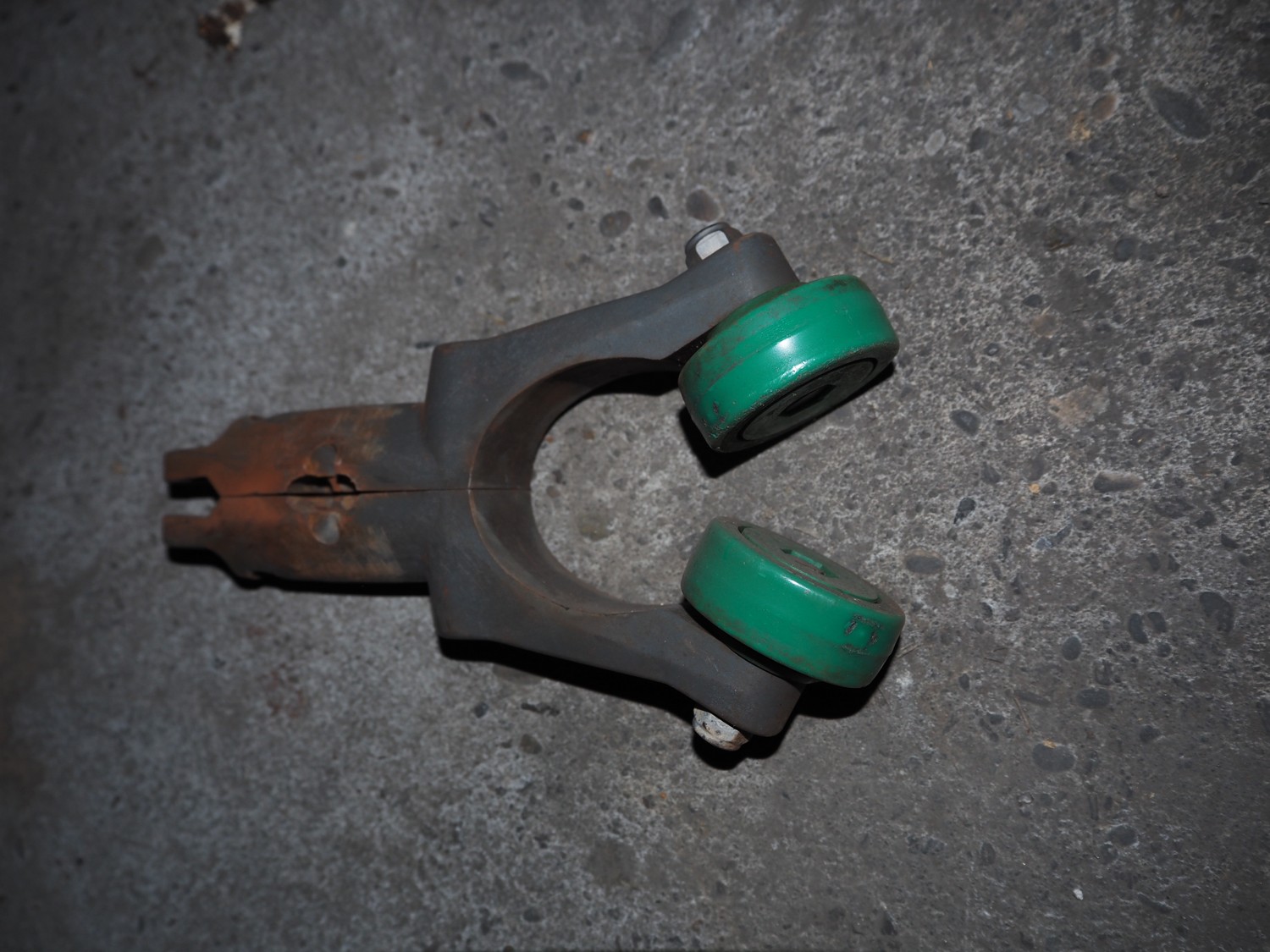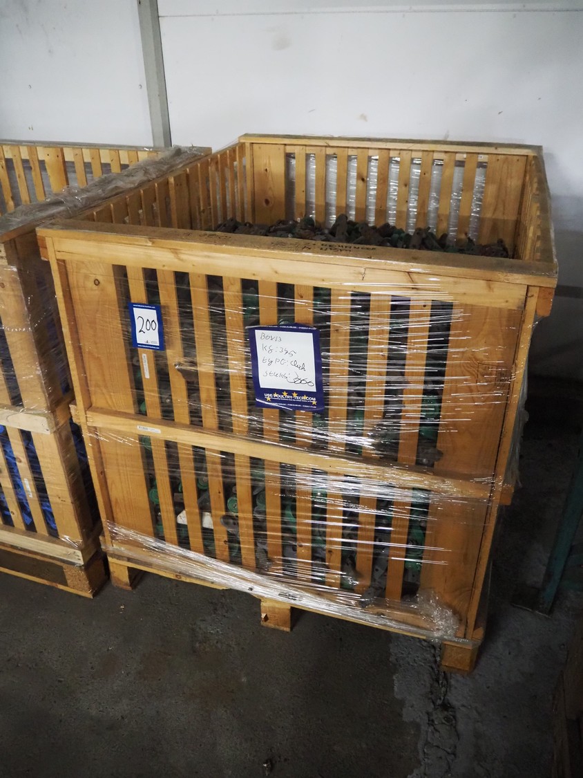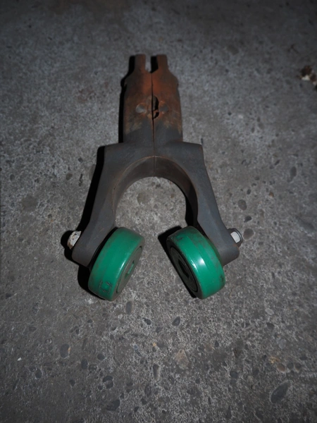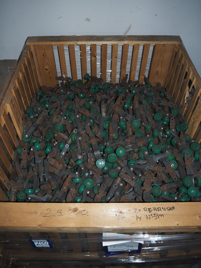 Pallet box with large amount of Meyn trolleys for tube track, 1500 pairs, weight: 375 kg, dimensions: 1200 mm x 760 mm x 580 mm.