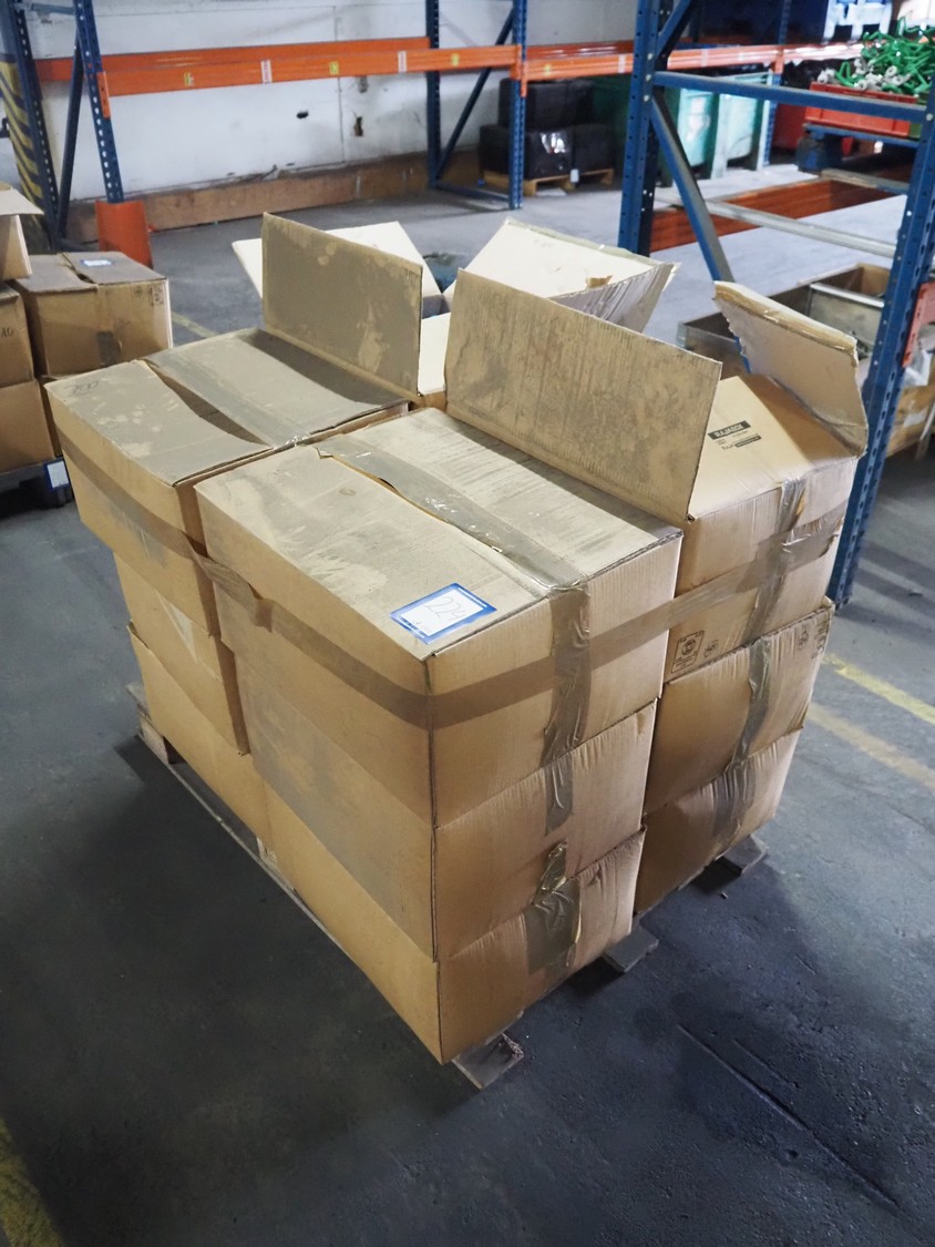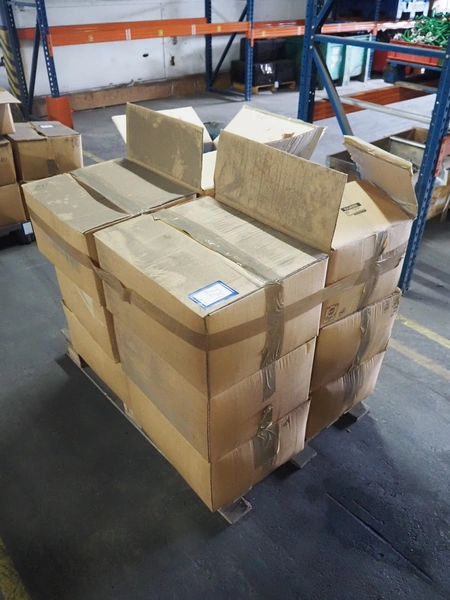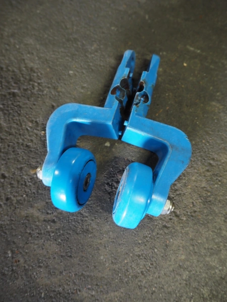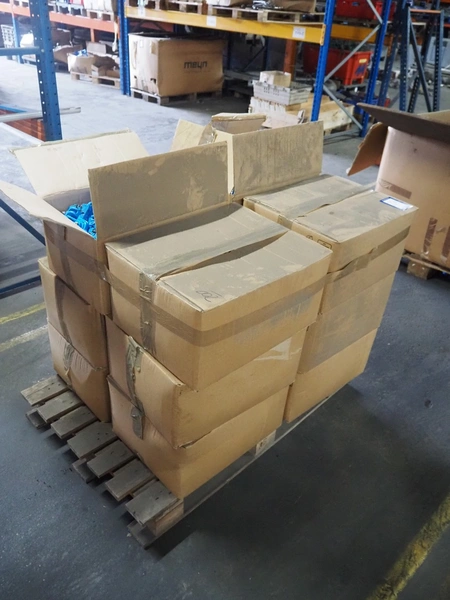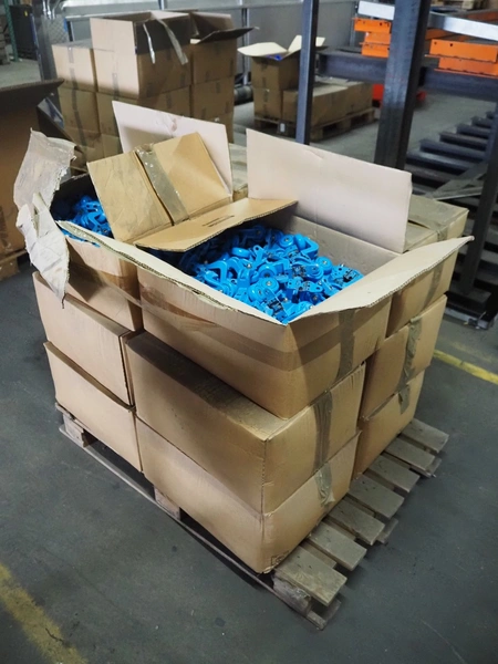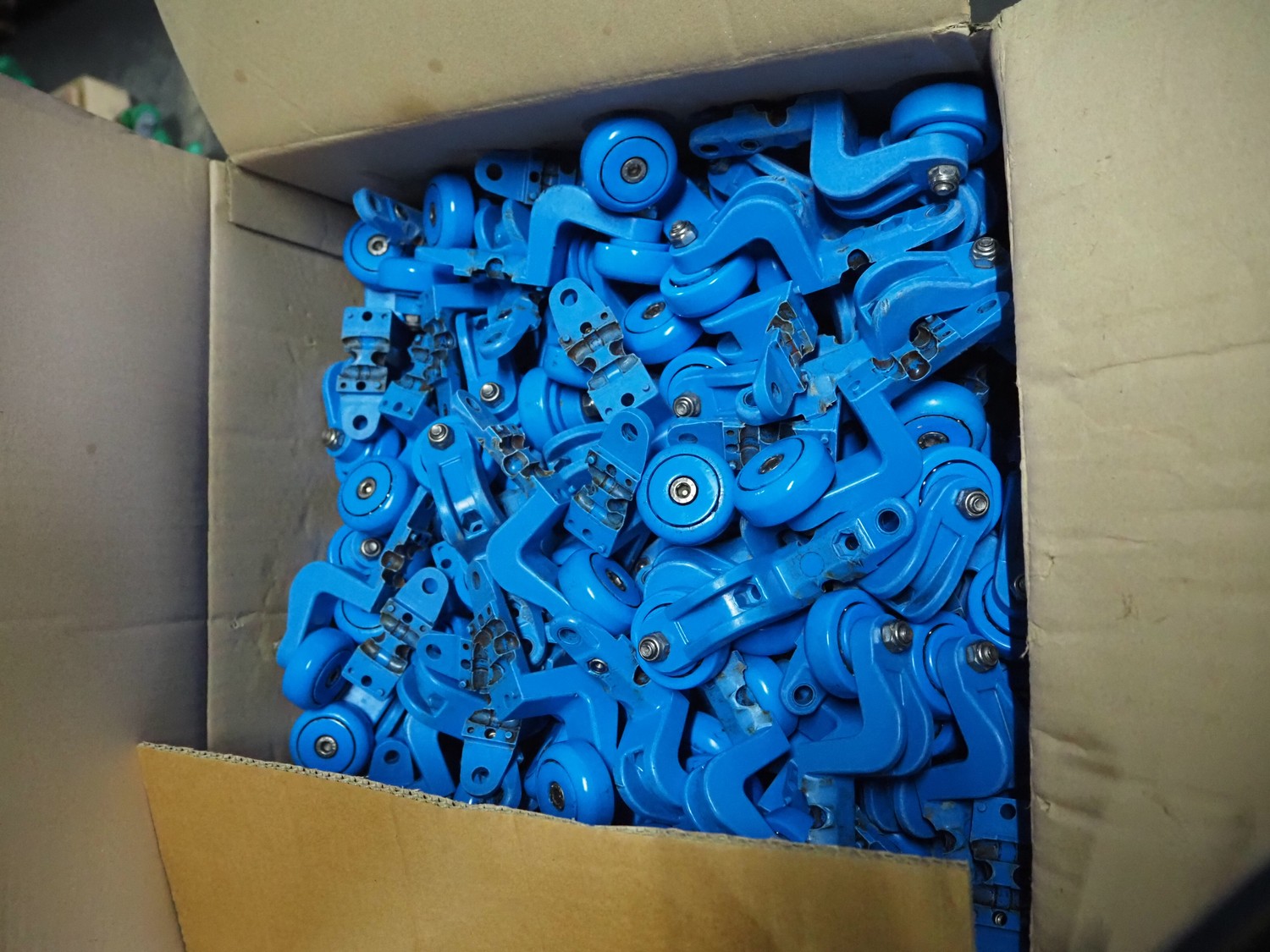 12 boxes with large amount of trolleys for track tube, approximately 2400 pieces, total dimensions: 1200 mm x 800 mm x 940 mm.