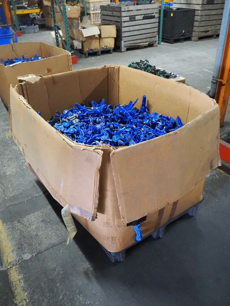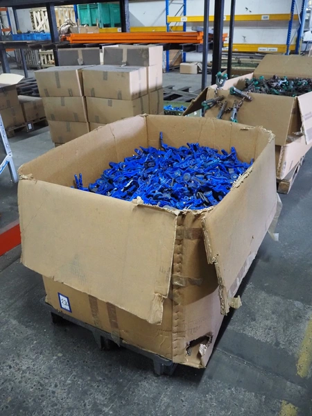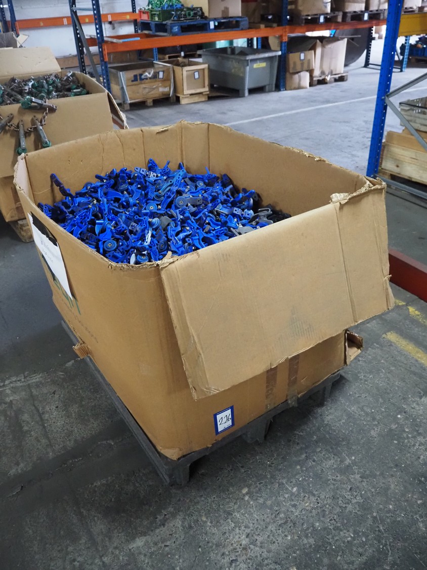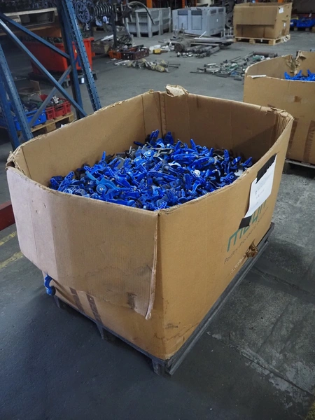 Pallet box with large amount of Foodmate trolleys for tube track, 800 pairs, weight: 245 kg, dimensions: 1300 mm x 1200 mm x 900 mm.