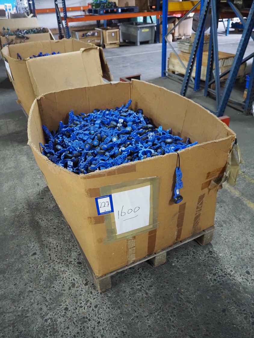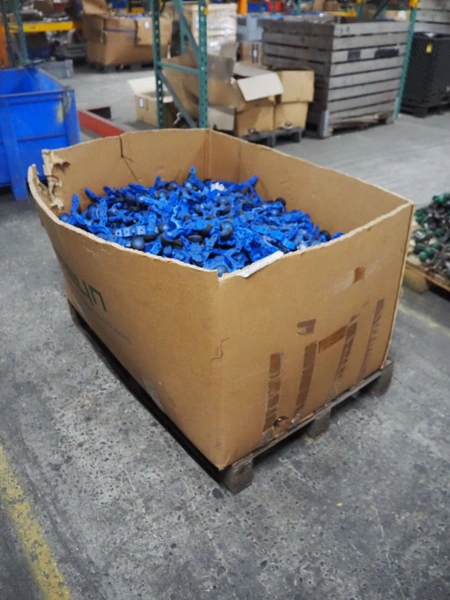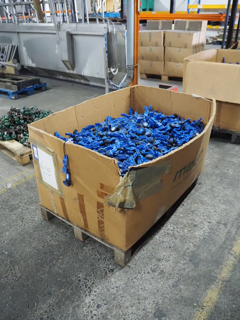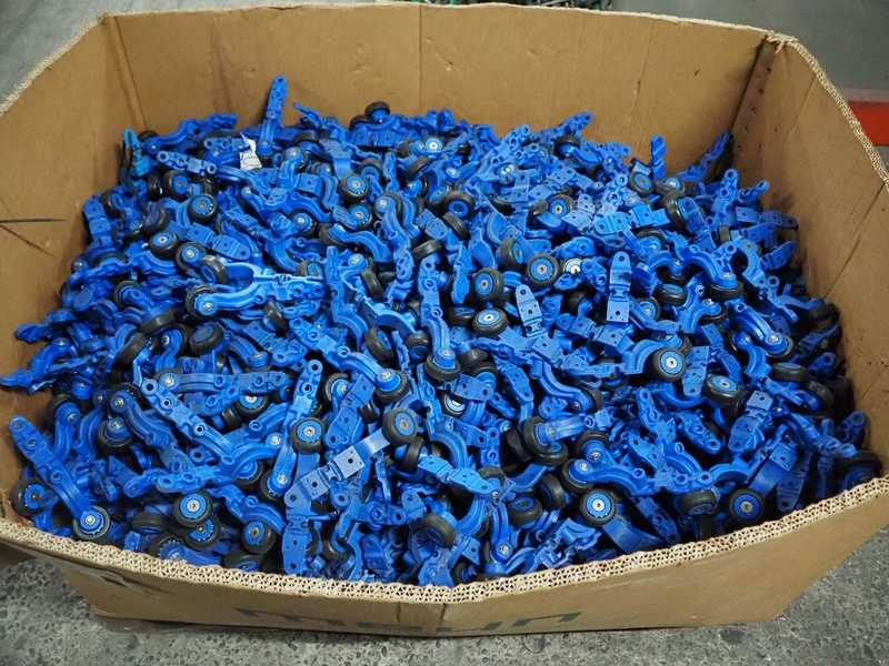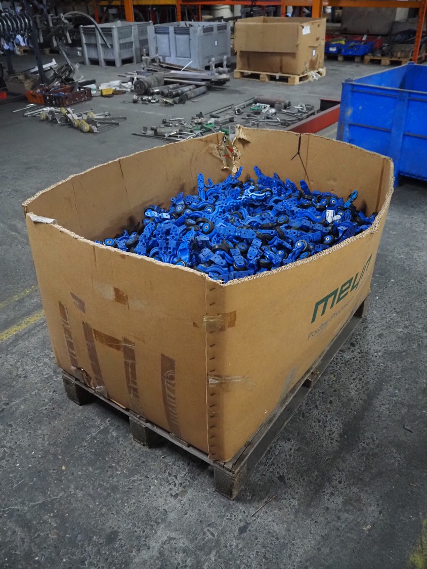 Pallet box with large amount of Foodmate trolleys for tube track, dimensions: 1300 mm x 1200 mm x 900 mm.