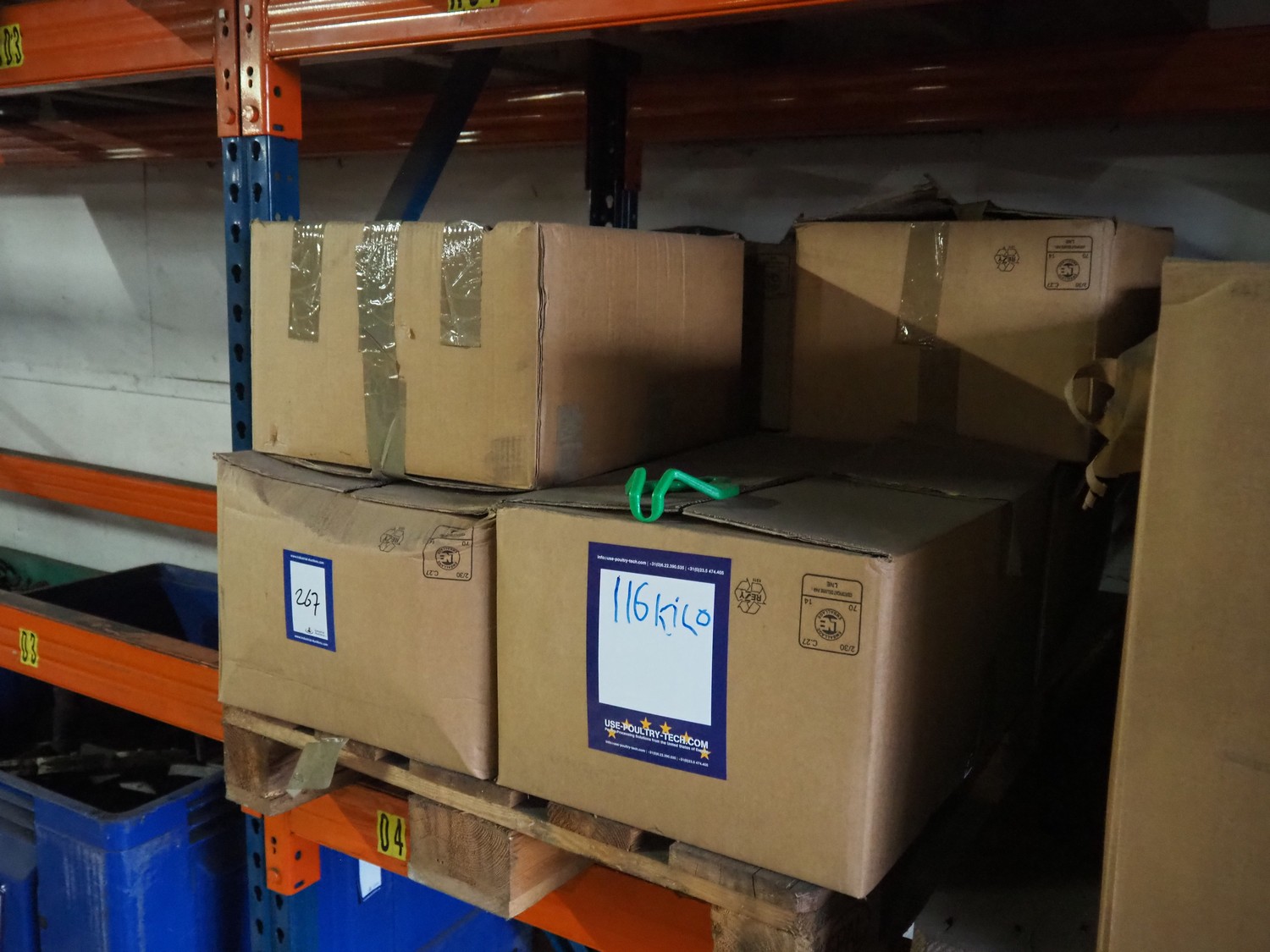 Pallet with Meyn physics weighing short shackles and housing cut up shackle parts.