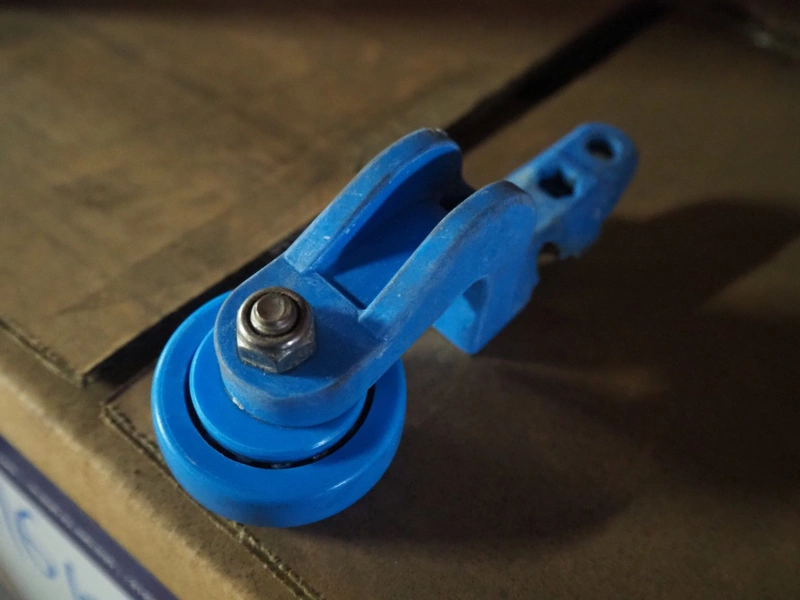 Pallet with large amount of trolleys for tube track, total weight: 182 kg.