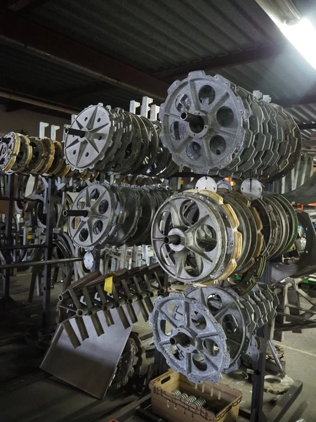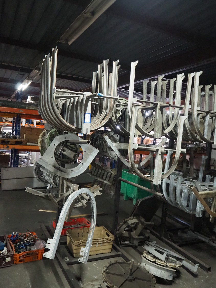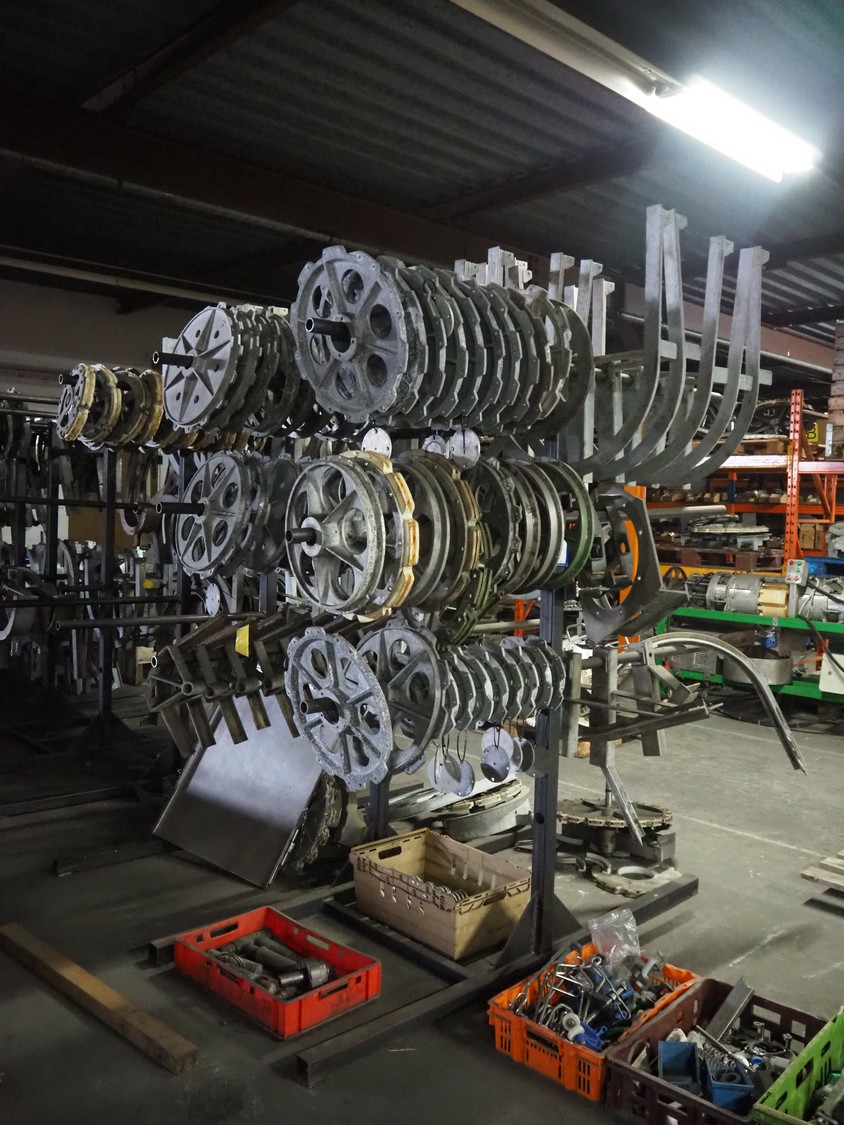 Steel rack with corner wheel segments, wheel diameter: 420 mm and 220 mm, dimensions rack: 1700 mm x 2000 mm x 2450 mm.