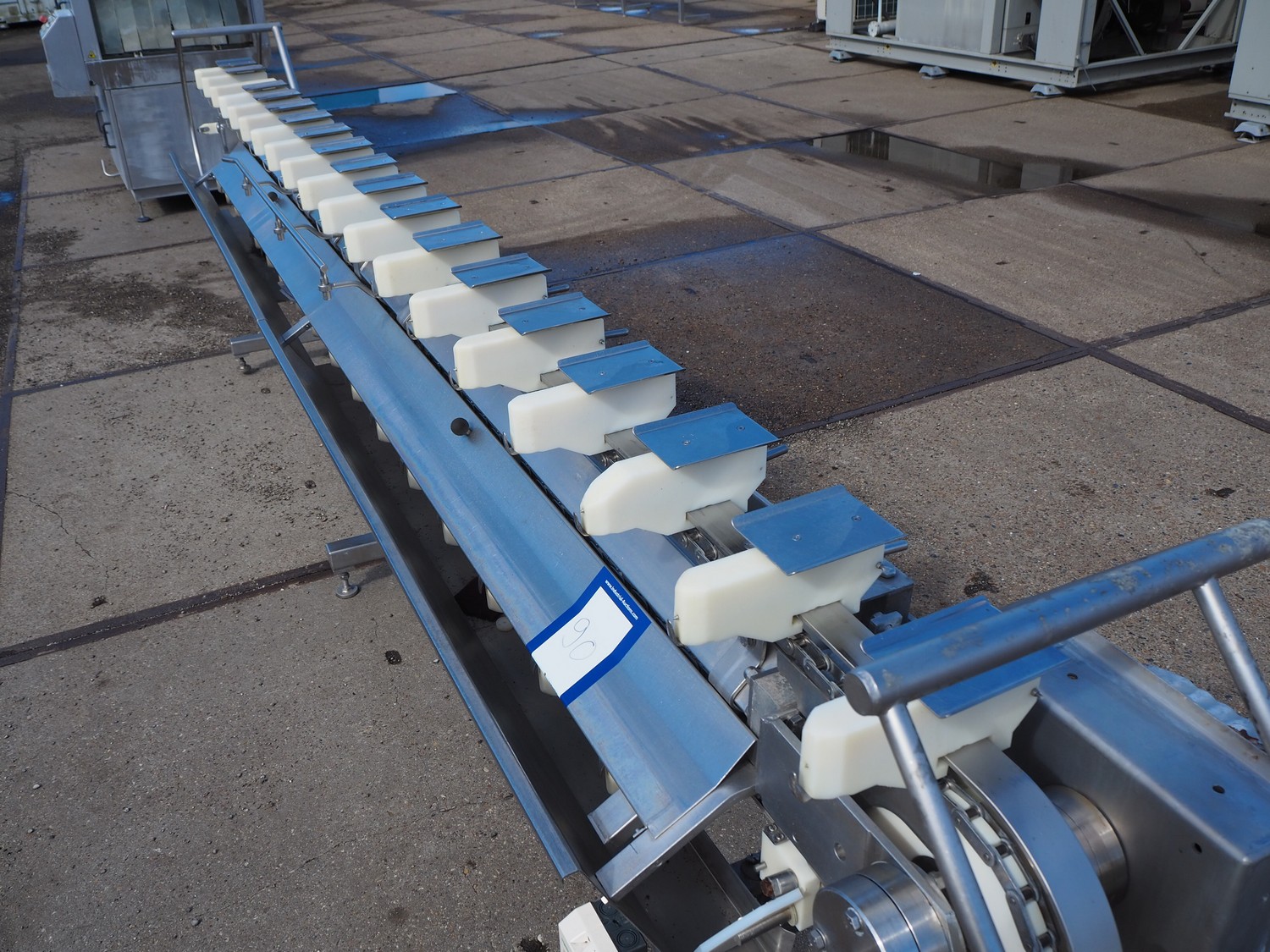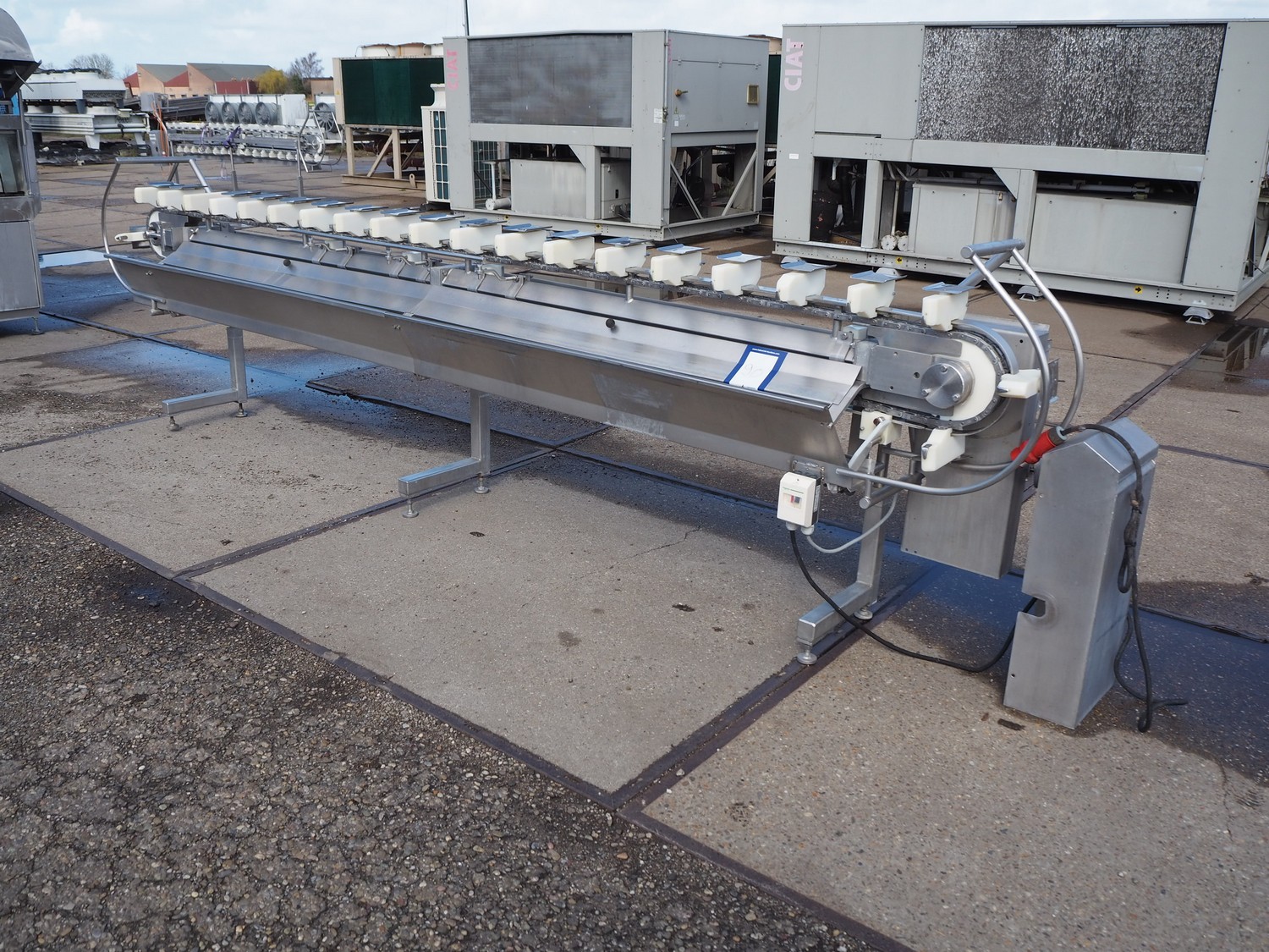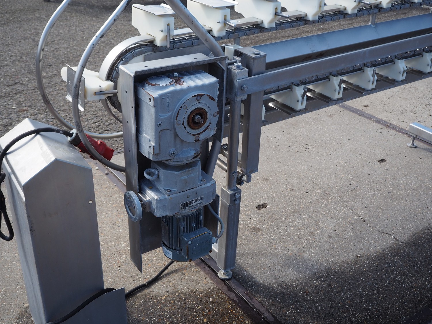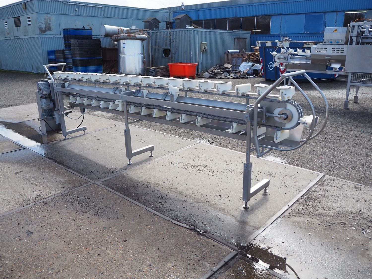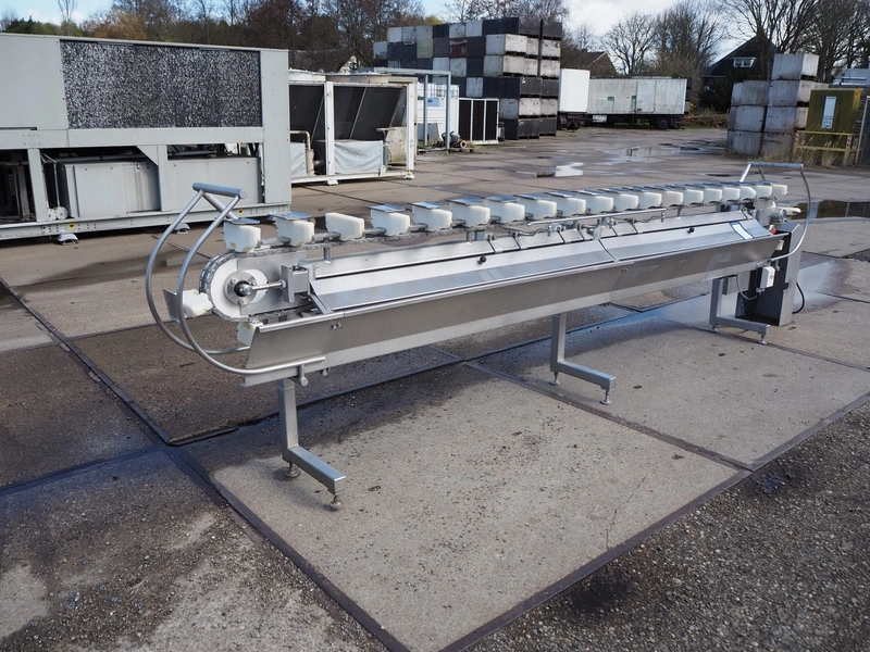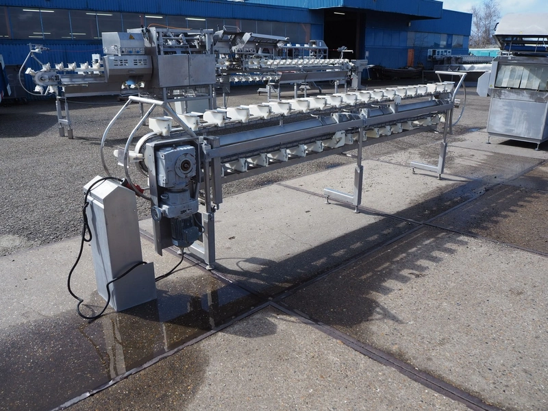 Stork hand filleting line for manual filleting of breast caps, working width: 145 mm x 115 mm, total dimensions: 4700 mm x 650 mm x 1350 mm.