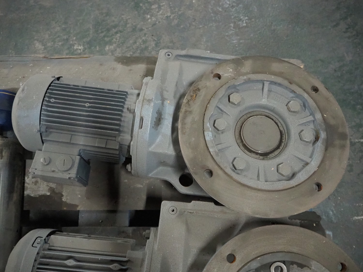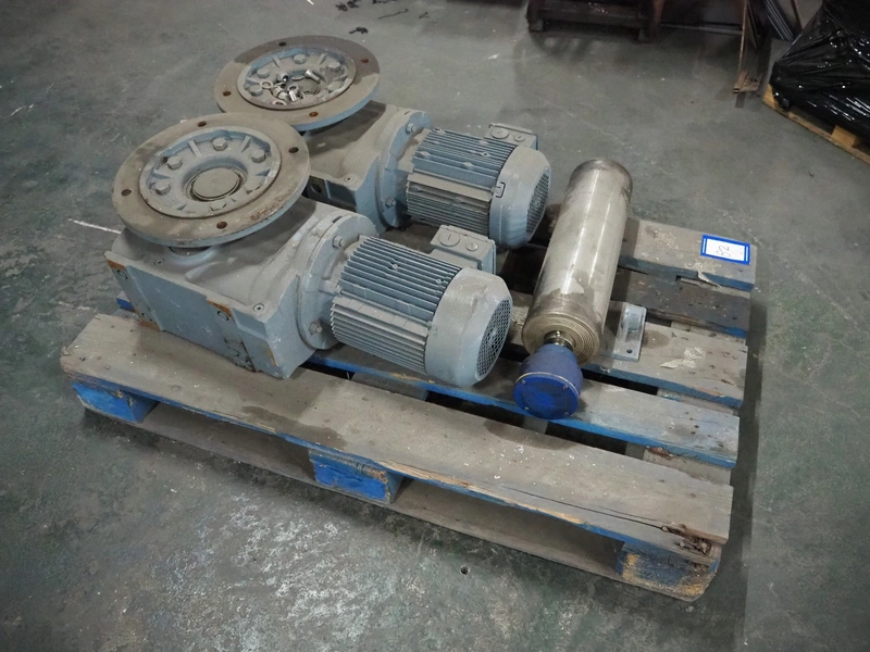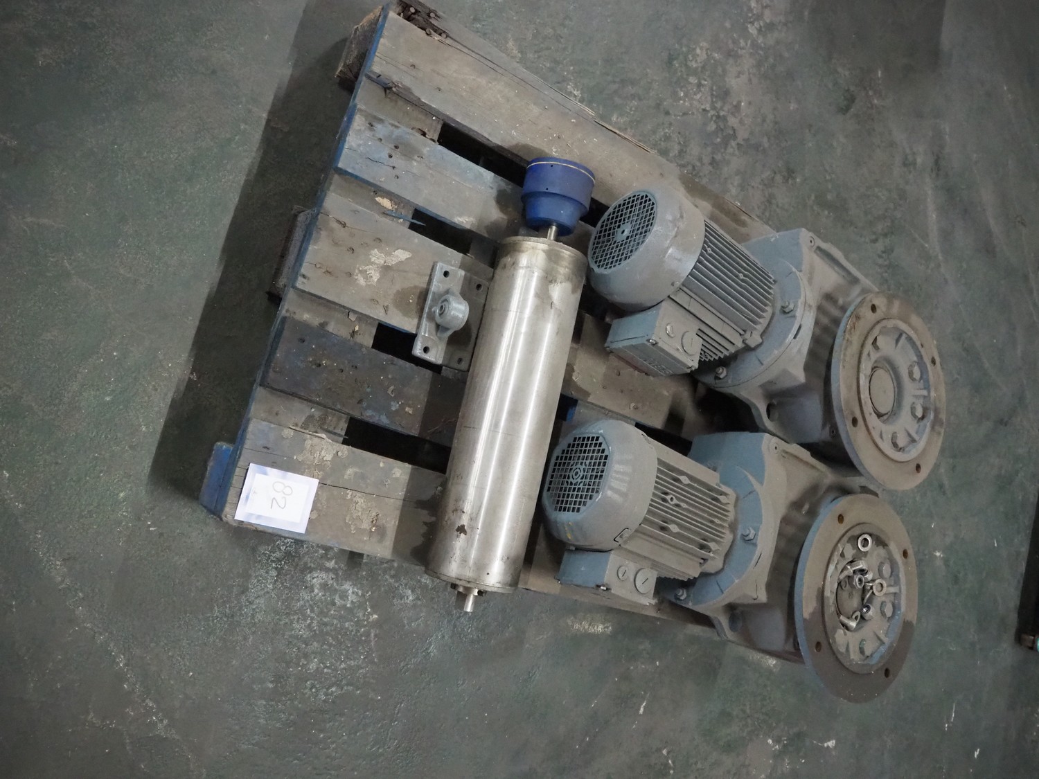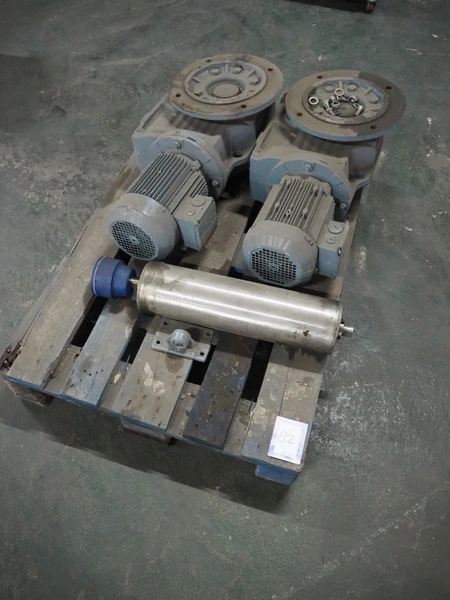 Pallet with 2 gear motors and 1 drum motor, dimensions gear motors: (2x) 750 mm x 300 mm x 400 mm, (1x) Ø 135 mm x 650 mm.