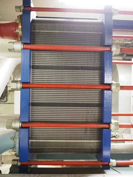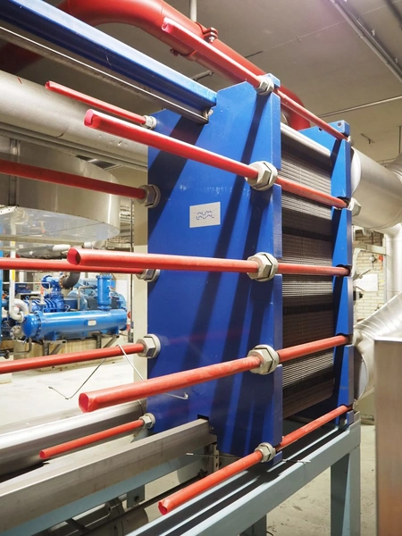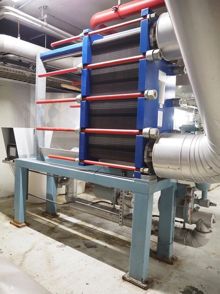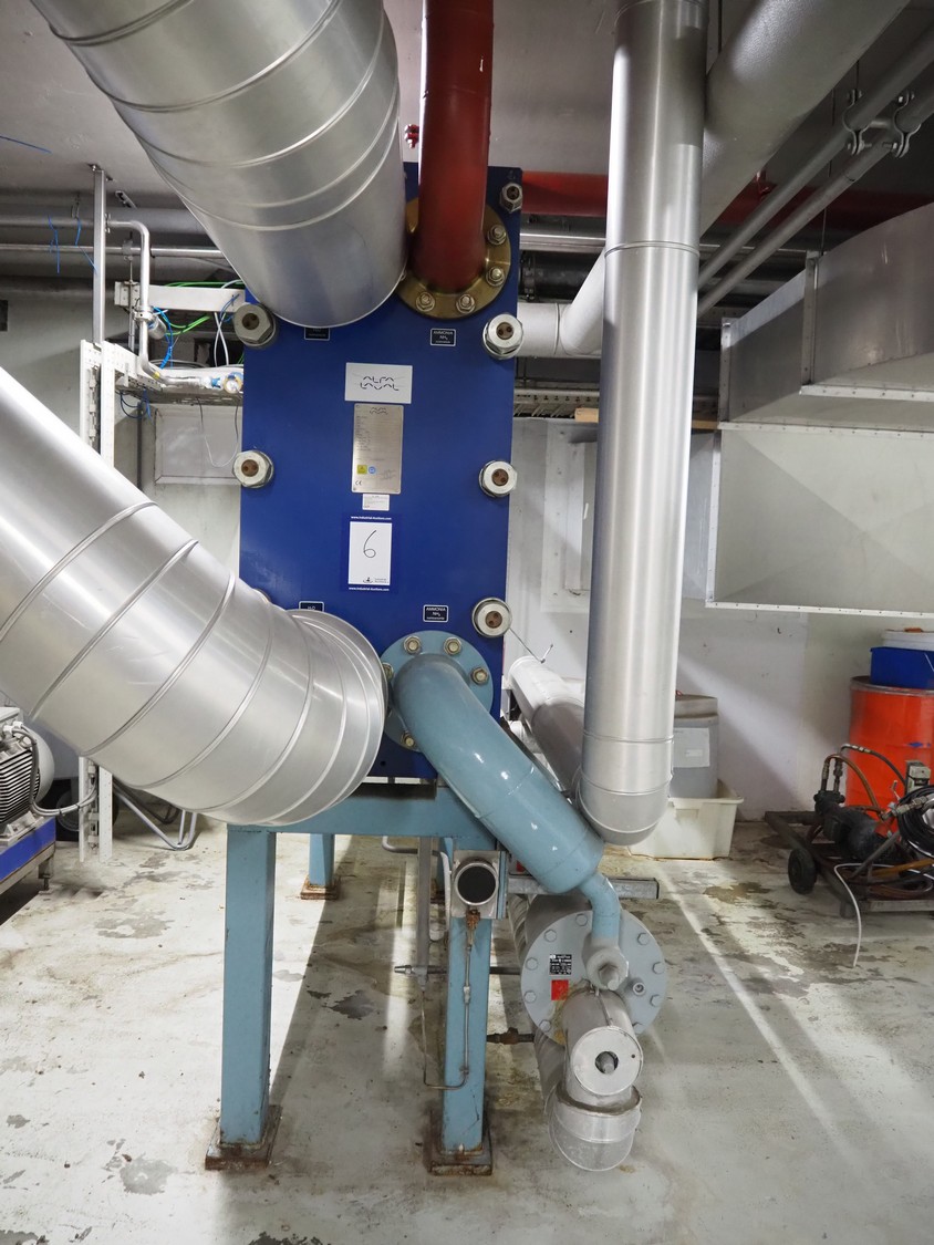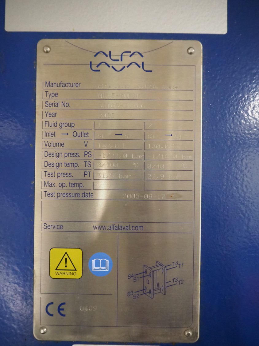 Steel skid with Alfa Laval plate heat exchanger, type: MK15-BWFDR, serial number: 30105-31166, year of construction: 2005, volume S1-S2: 132.0 liter, PS: -1/22.0 bar, TS: 0/100 °C, PT: 31.5 bar, volume S3-S4: 130.0 liter, PS: -1/16.0 bar, TS: 0/40 °C, PT: 22.9 bar, including GEA purger.
