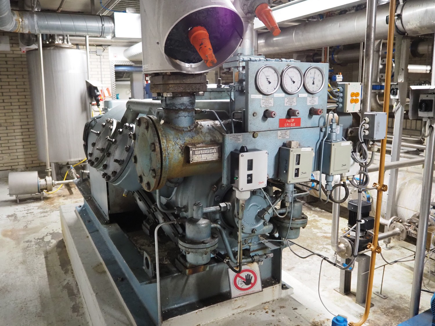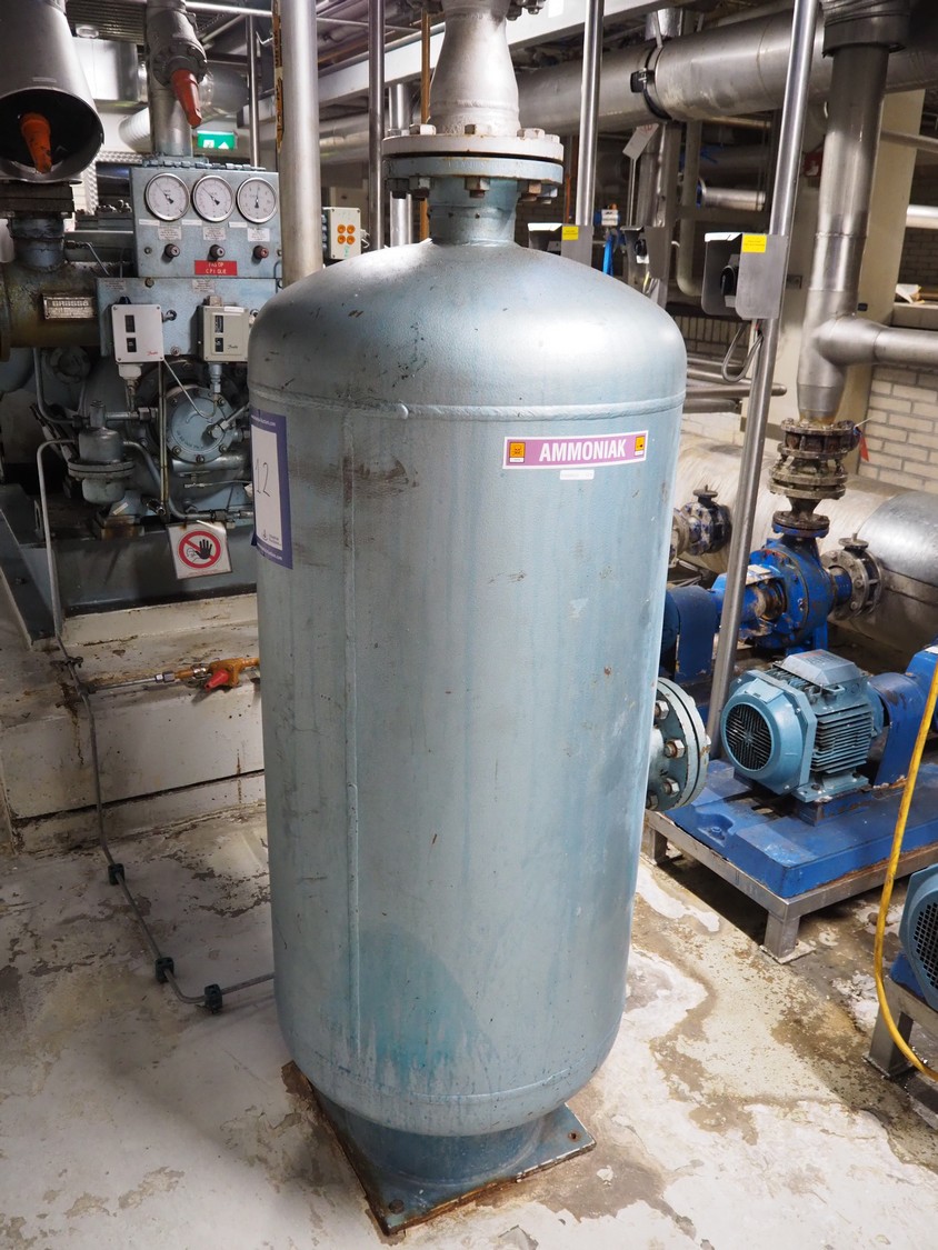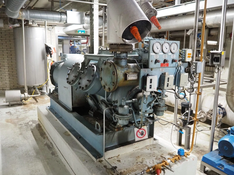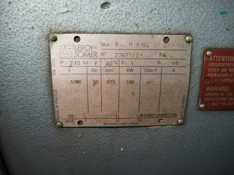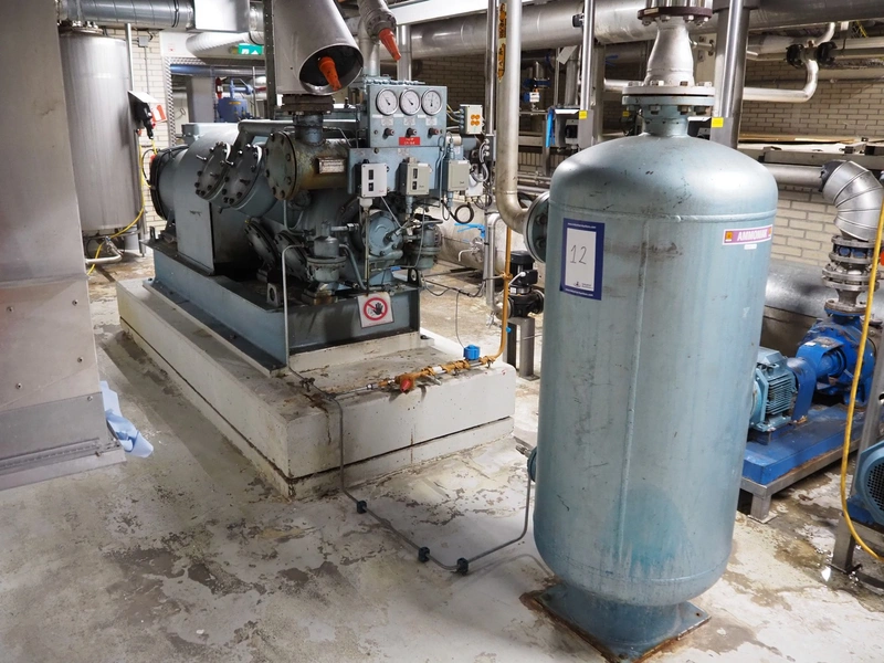 Grasso reciprocating cooling compressor, type: RC 611, serial number: 92061513, year of construction: 1992, max volume flow rate: 798 m³/h, max design pressure: 21 bar, max speed: 1000 rpm, refrigerant: NH3, with Leroy Somer motor, power: 160 kW, dimensions cooling compressor: 3100 mm x 1100 mm x 1800 mm, dimensions pressure vessel: 700 mm x 700 mm x 1600 mm, dimensions switch cabinet: (2x) 800 mm x 600 mm x 2200 mm. If desired, the concrete base is included, but this is not mandatory, dimensions concrete base: 3050 mm x 1200 mm x 350 mm.