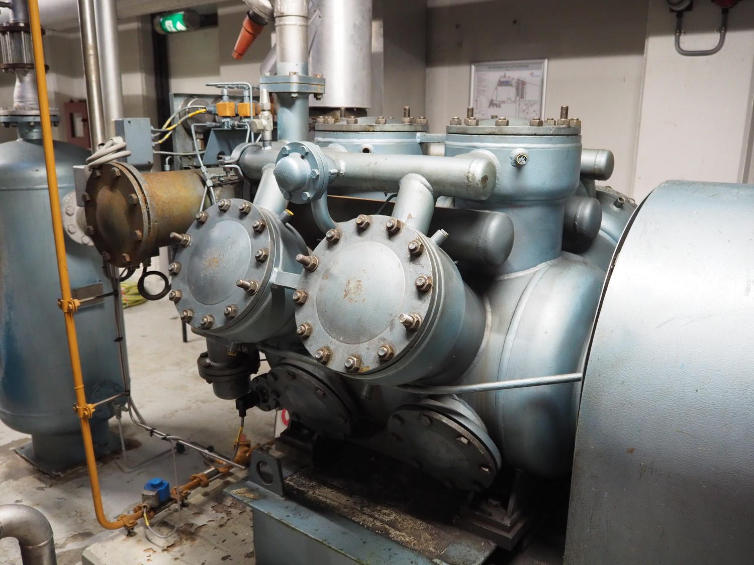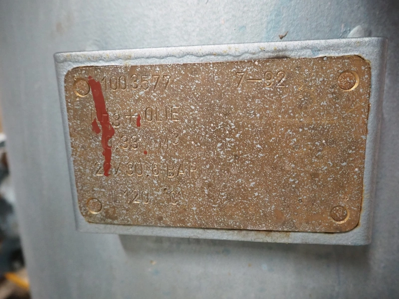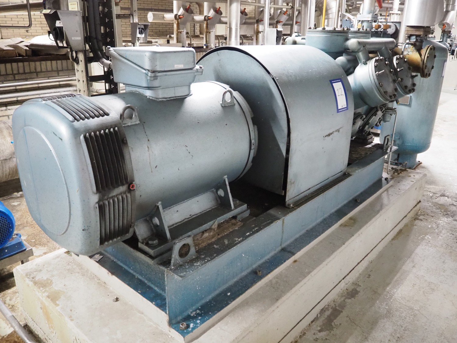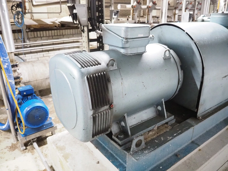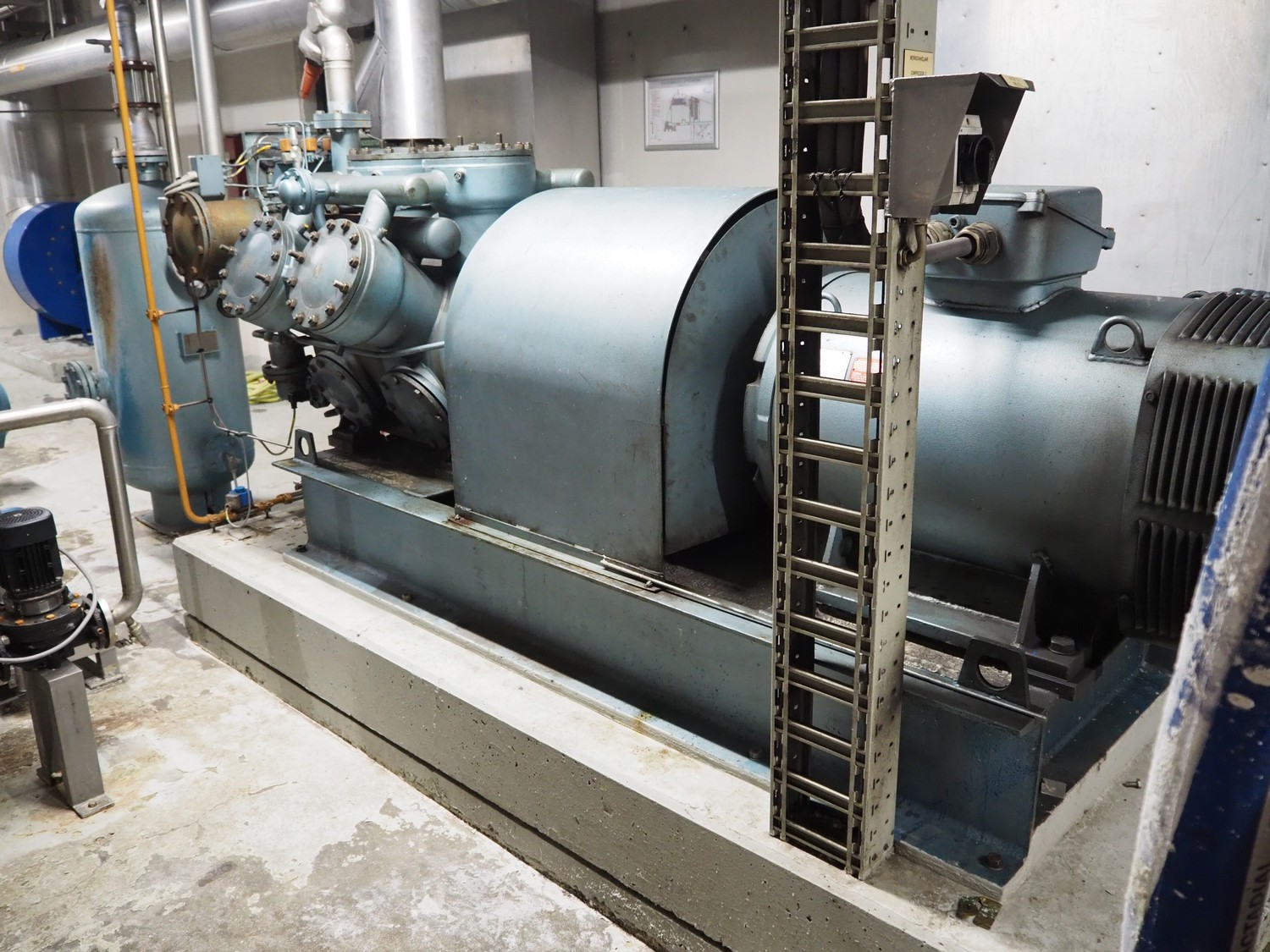 Grasso reciprocating cooling compressor, type: RC 611, serial number: 92061513, year of construction: 1992, max volume flow rate: 798 m³/h, max design pressure: 21 bar, max speed: 1000 rpm, refrigerant: NH3, with Leroy Somer motor, power: 160 kW, dimensions cooling compressor: 3100 mm x 1100 mm x 1800 mm, dimensions pressure vessel: 700 mm x 700 mm x 1600 mm, dimensions switch cabinet: (2x) 800 mm x 600 mm x 2200 mm. If desired, the concrete base is included, but this is not mandatory, dimensions concrete base: 3050 mm x 1200 mm x 350 mm.