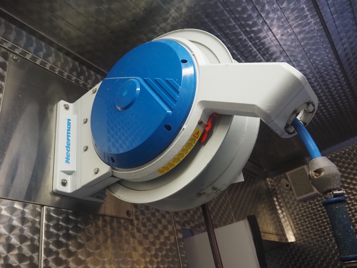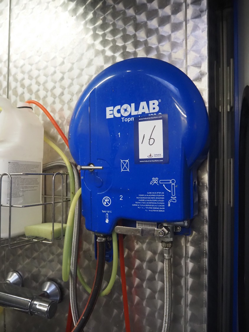 Nederman hose reel with plastic hose and spray pistol, dimensions: 650 mm x 250 mm x 550 mm, with Ecolab soap mixing unit, dimensions: 300 mm x 400 mm x 150 mm.
