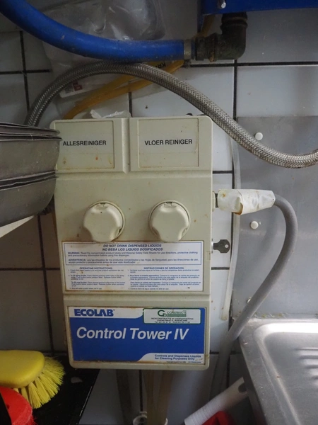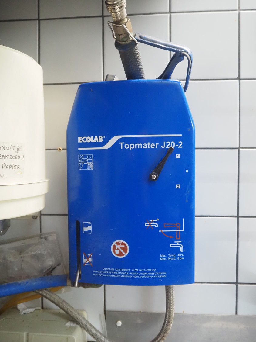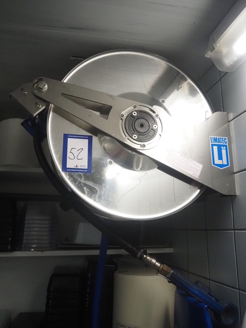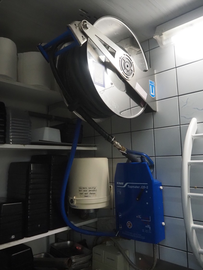 Limatec hose reel with plastic hose and spray pistol, dimensions: 600 mm x 300 mm x 500 mm, with Ecolab soap mixing unit, dimensions: 300 mm x 400 mm x 150 mm.