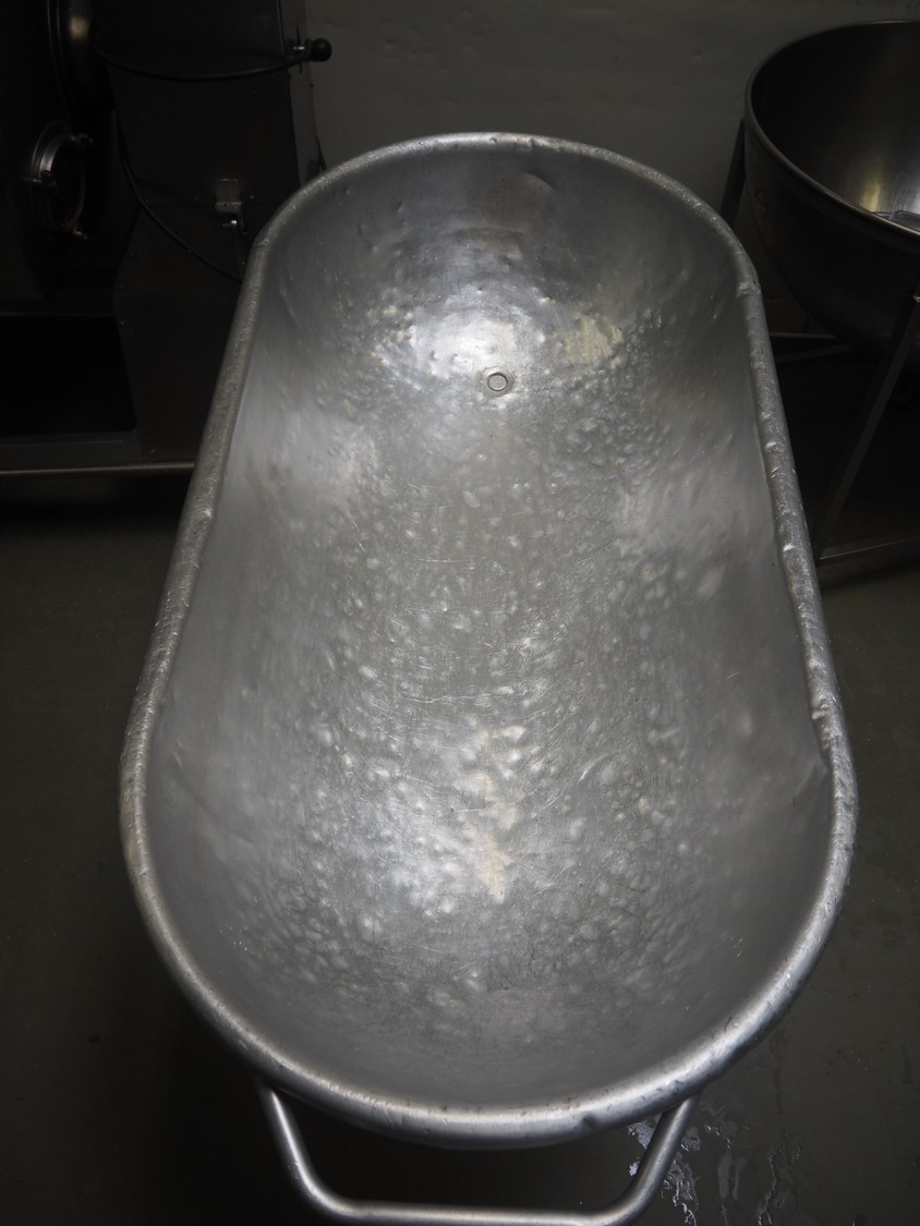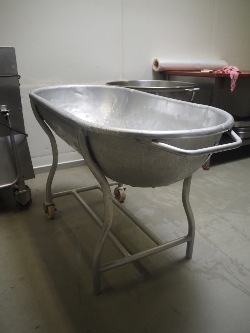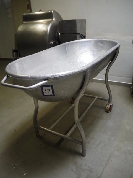 Mobile steel tub, dimensions: 1200 mm x 650 mm x 750 mm.