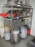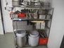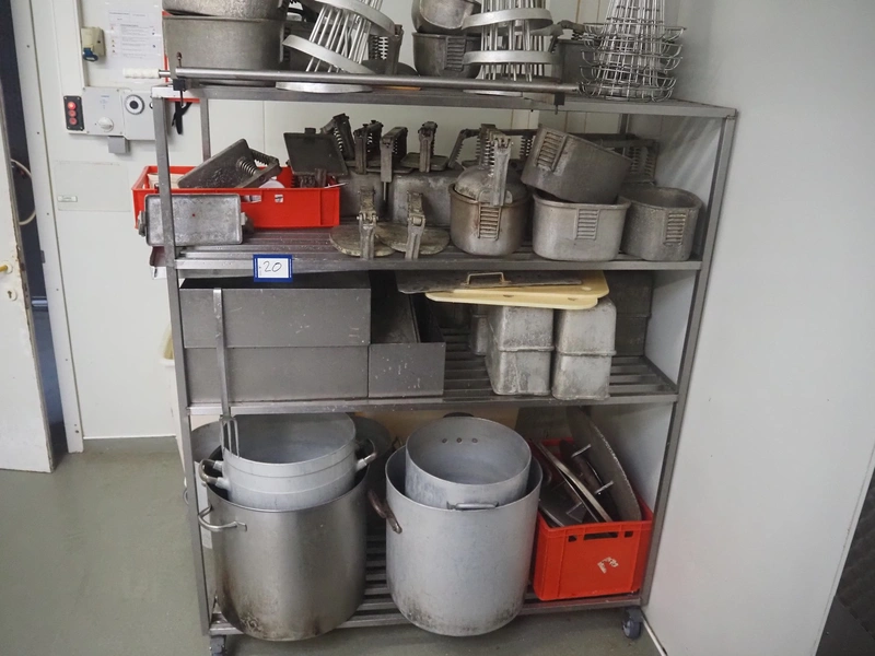 S/s rack with various pans and ham forms, dimensions: 1500 mm x 750 mm x 1800 mm.