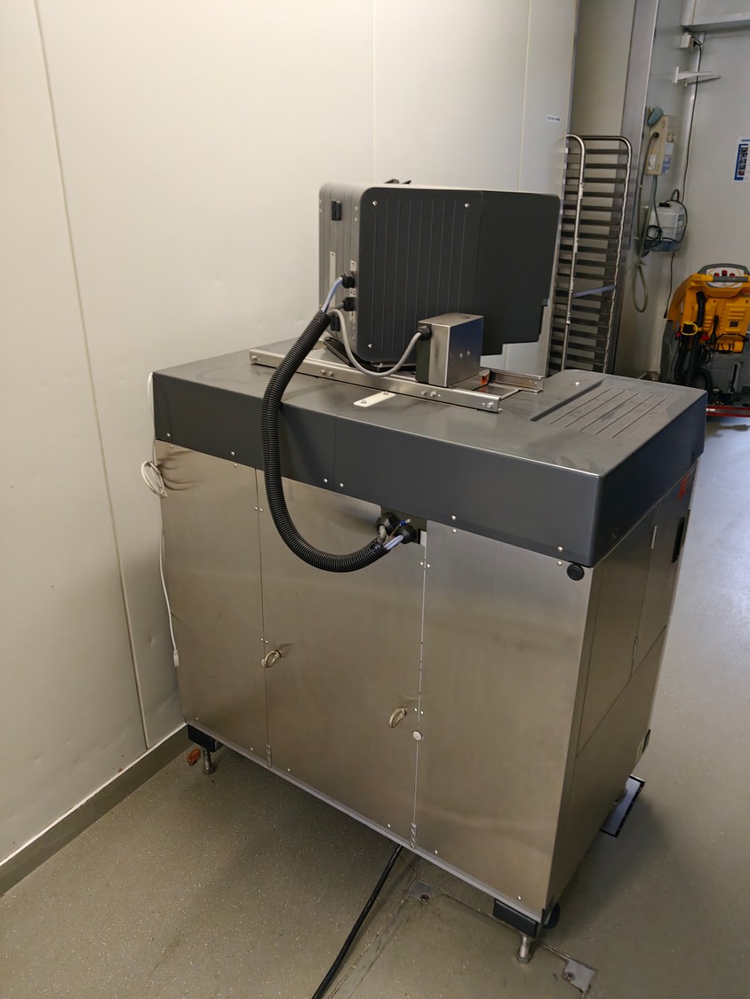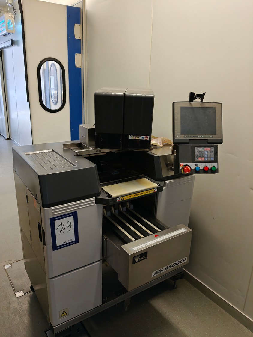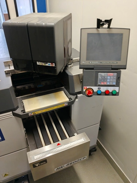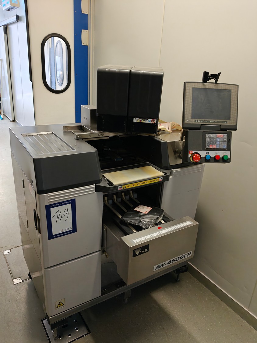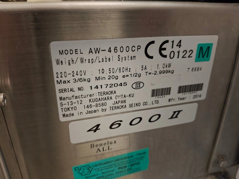 Teraoka Seiko Co., LTD semi automatic weigh, wrap and labelling machine, model: AW-4600CP, serial number: 14172045, year of construction: 2014, 220-240 V, 1 Ph, 50/60 Hz, 5 A, 1.0 kW, maximum weight: 3/6 kg, minimum weight: 20 gram, e=1/2 gram, T=-2.999 kg, dimensions: 1100 mm x 1050 mm x 1500 mm.