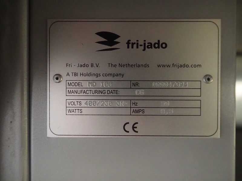 Fri-Jado refrigerated showcase, model: MD 100, number: 100047094, year of construction: 2006, 400/230 V, 3 Ph, 50 Hz, 8.5 A, dimensions: 1000 mm x 950 mm x 1900 mm.
