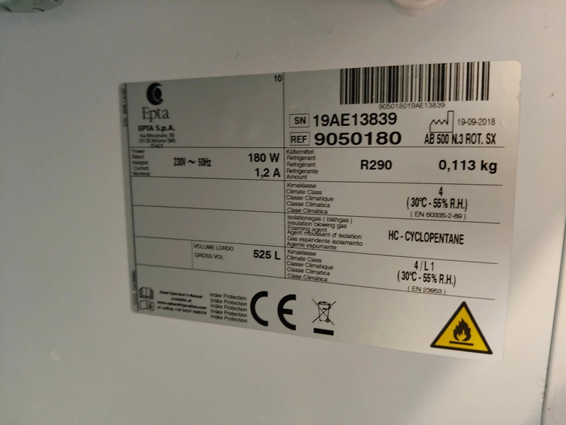 IARP freezer, model: AB 500 NL3 ROT. SX, serial number: 19AE13839, 230 V, 50 Hz, refrigerant: R290, 0113 kg, gross volume: 525 L, dimensions: 770mm x 730 mm x 1700 mm.