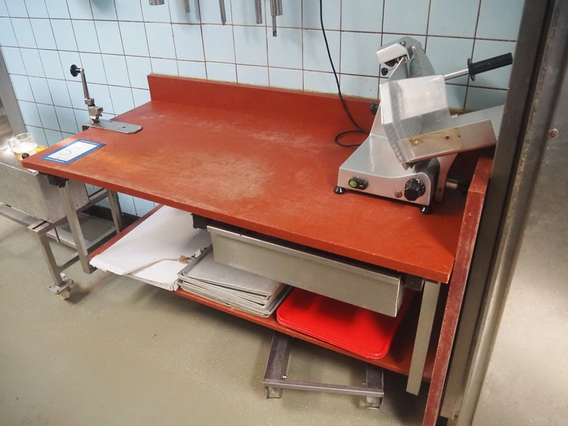 Deboning table, s/s frame, plastic cutting top, dimensions: 1500 mm x 750 mm x 850 mm. Without content.