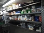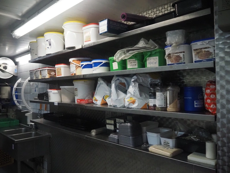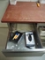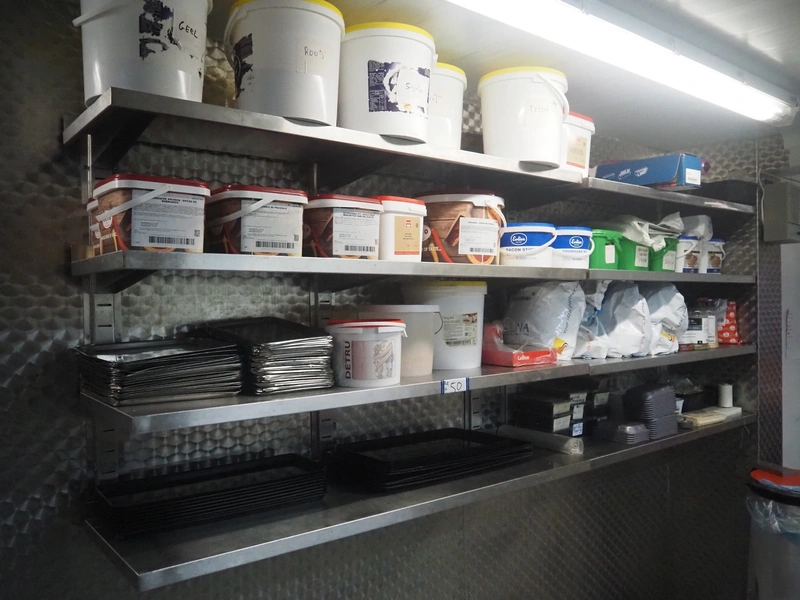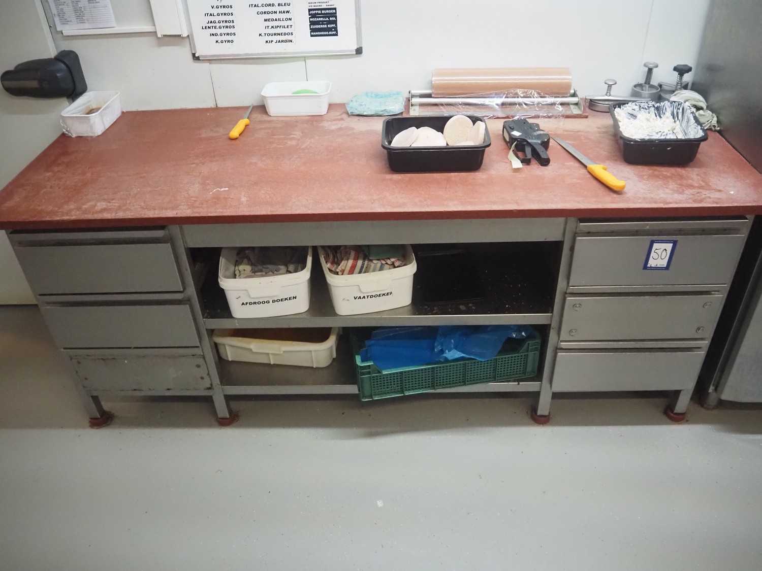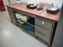 Deboning table, s/s frame with drawers, plastic cutting top, dimensions: 2100 mm x 850 mm x 900 mm, with s/s wall mounted rack, dimensions: 2550 mm x 420 mm x 1000 mm. Without content.