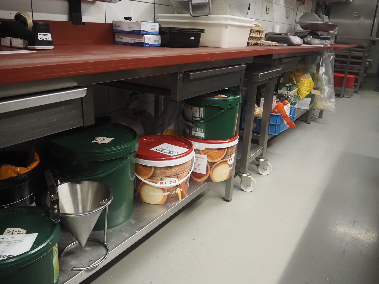 Deboning table, s/s frame, plastic cutting top, dimensions: 4000 mm x 700 mm x 880 mm. Without content.