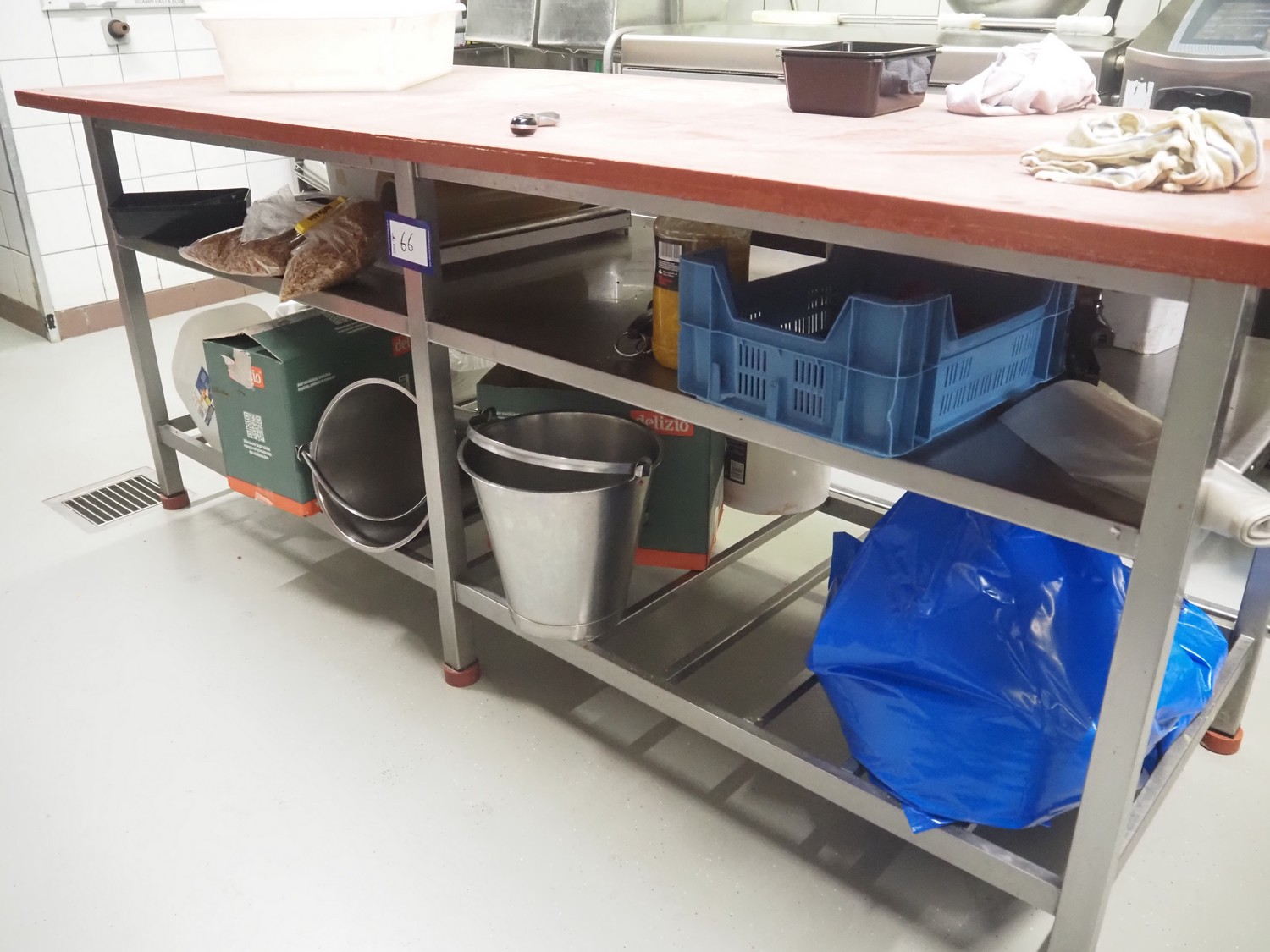 Deboning table, s/s frame, plastic cutting top, dimensions: 2180 mm x 900 mm x 920 mm. Without content.
