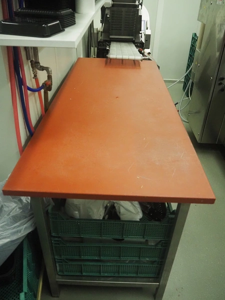 Deboning table, s/s frame, plastic cutting top, dimensions: 2000 mm x 800 mm x 900 mm. Without content.