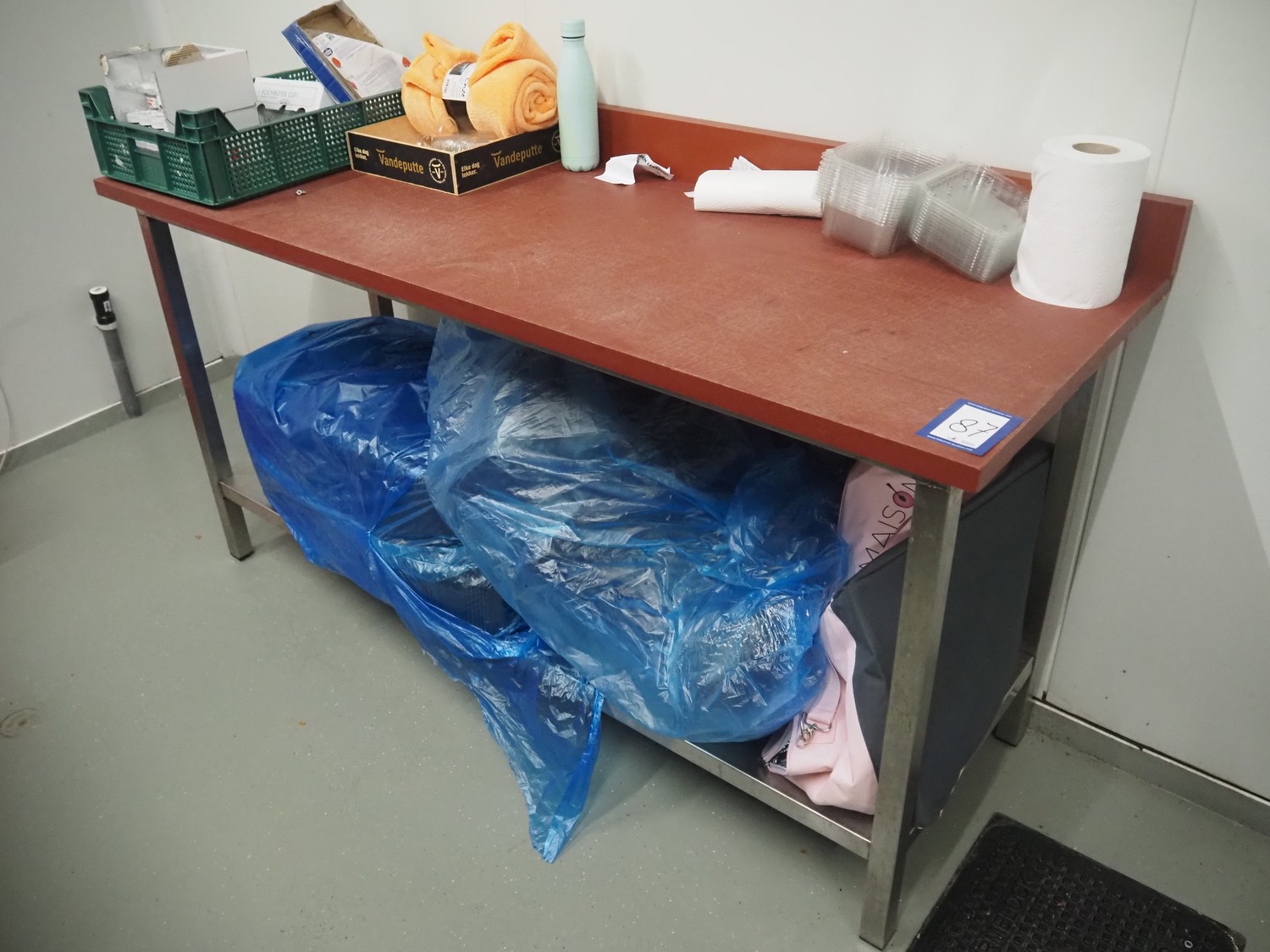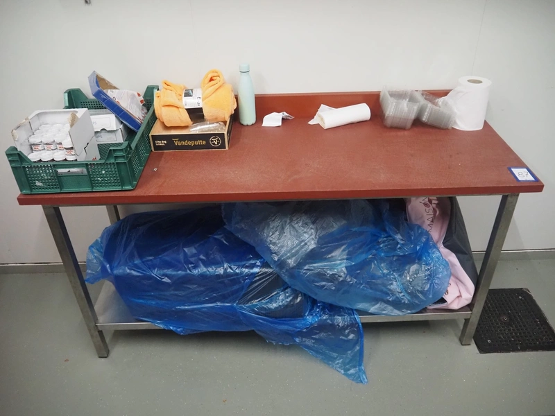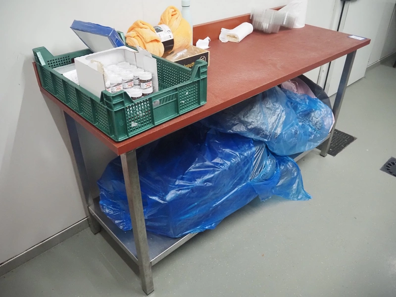 Deboning table, s/s frame, plastic cutting top, dimensions: 1800 mm x 650 mm x 1000 mm. Without content.