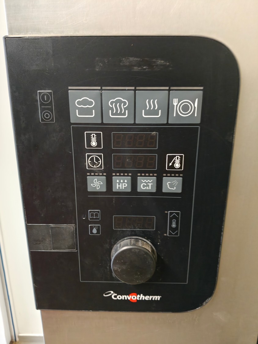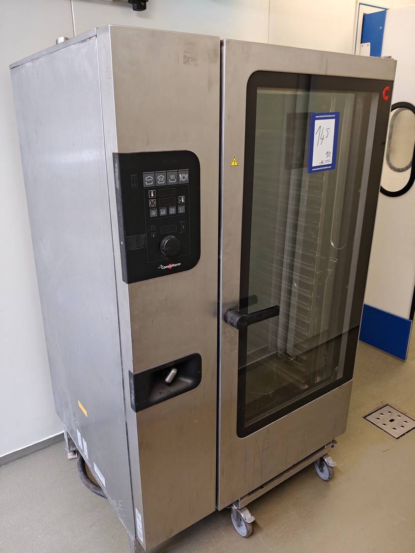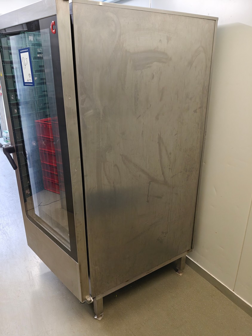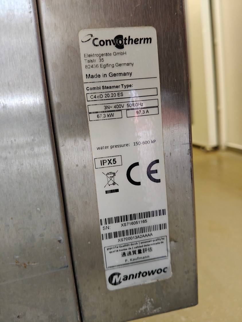 Convotherm combi steamer, type: C4eD20.20 ES, serial number: XS716051165, 400 V, 3Ph, 50/60 Hz, 67.3 kW, 97.3 A, dimensions: 1150 mm x 1100 mm x 1950 mm. Including 1 s/s trolleys, 20 floors each, dimensions floors: (20x) 650 m x 535 mm.