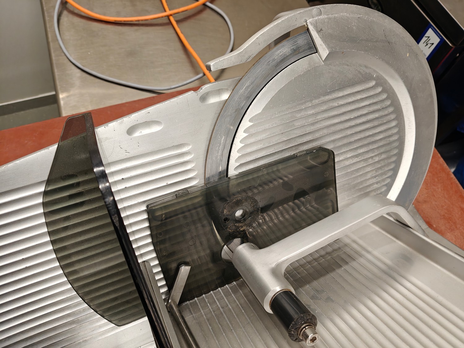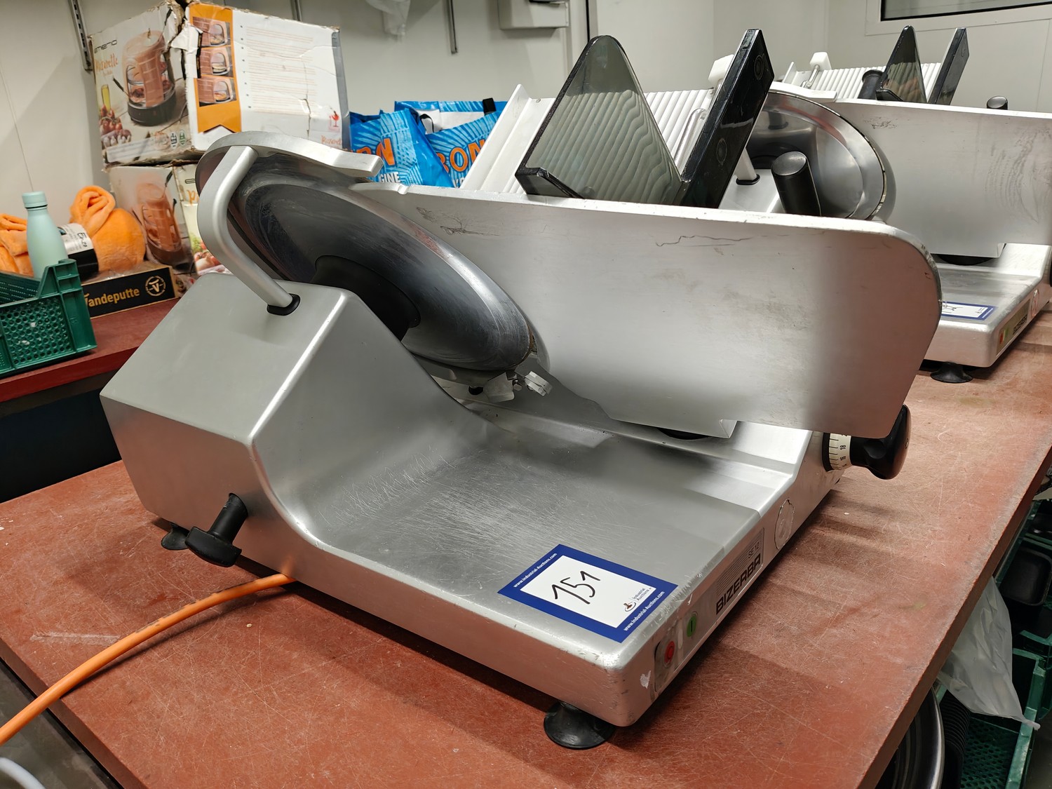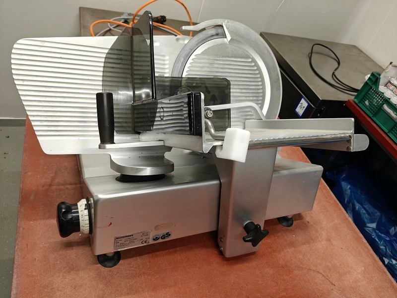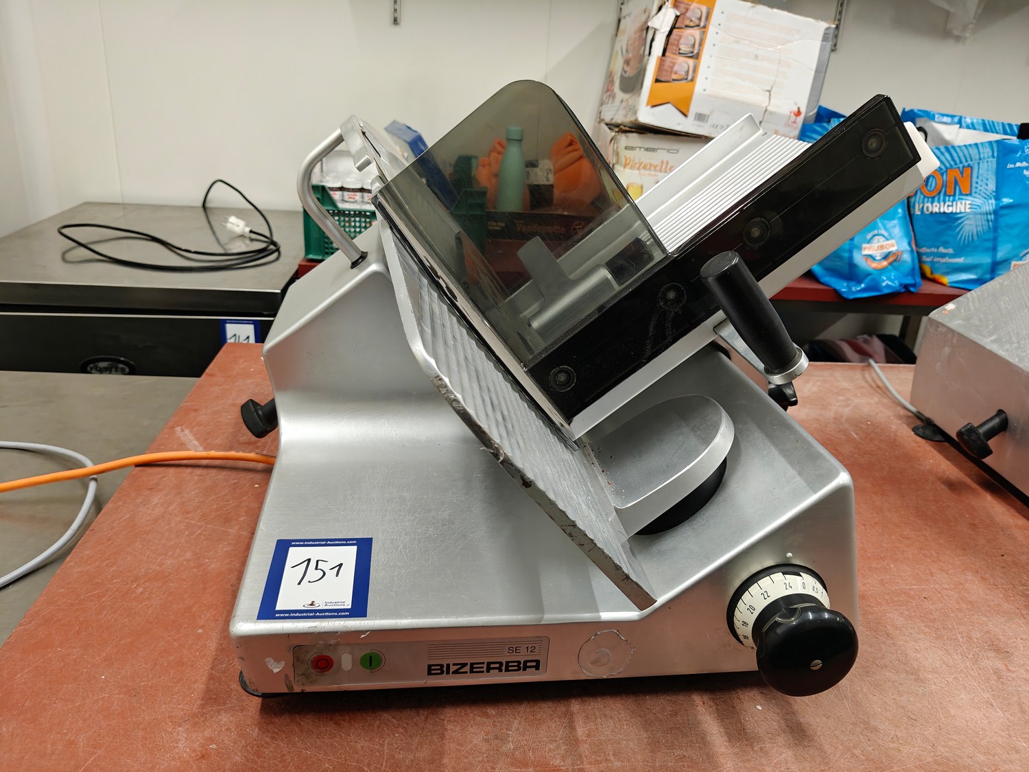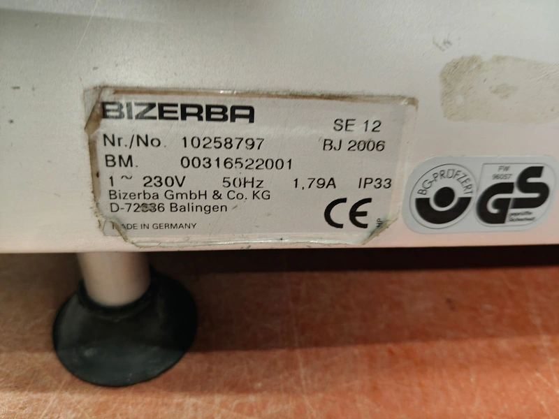 Bizerba slicer, type: SE 12, number: 10258797, year of construction: 2006, 230 V, 1 Ph, 50 Hz, 1.79 A, dimensions: 750 mm x 600 mm x 450 mm.