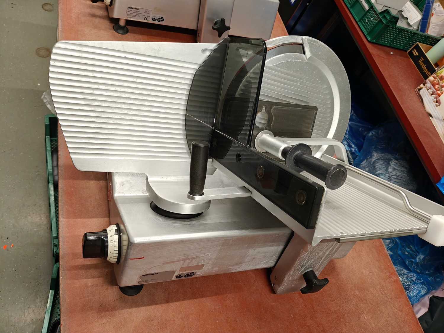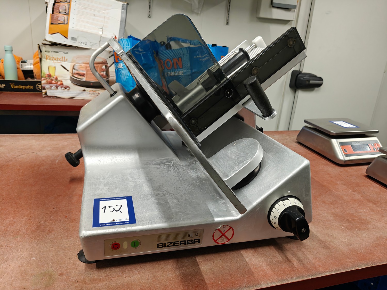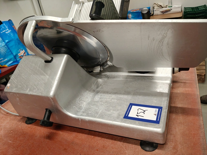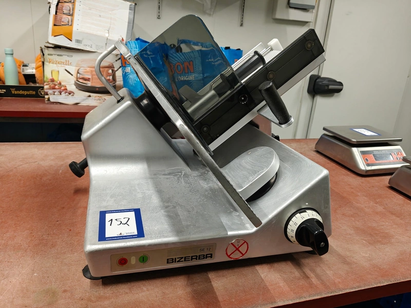 Bizerba slicer, type: SE 12, 230 V, 1 Ph, 50 Hz, 1.79 A, dimensions: 750 mm x 600 mm x 450 mm.