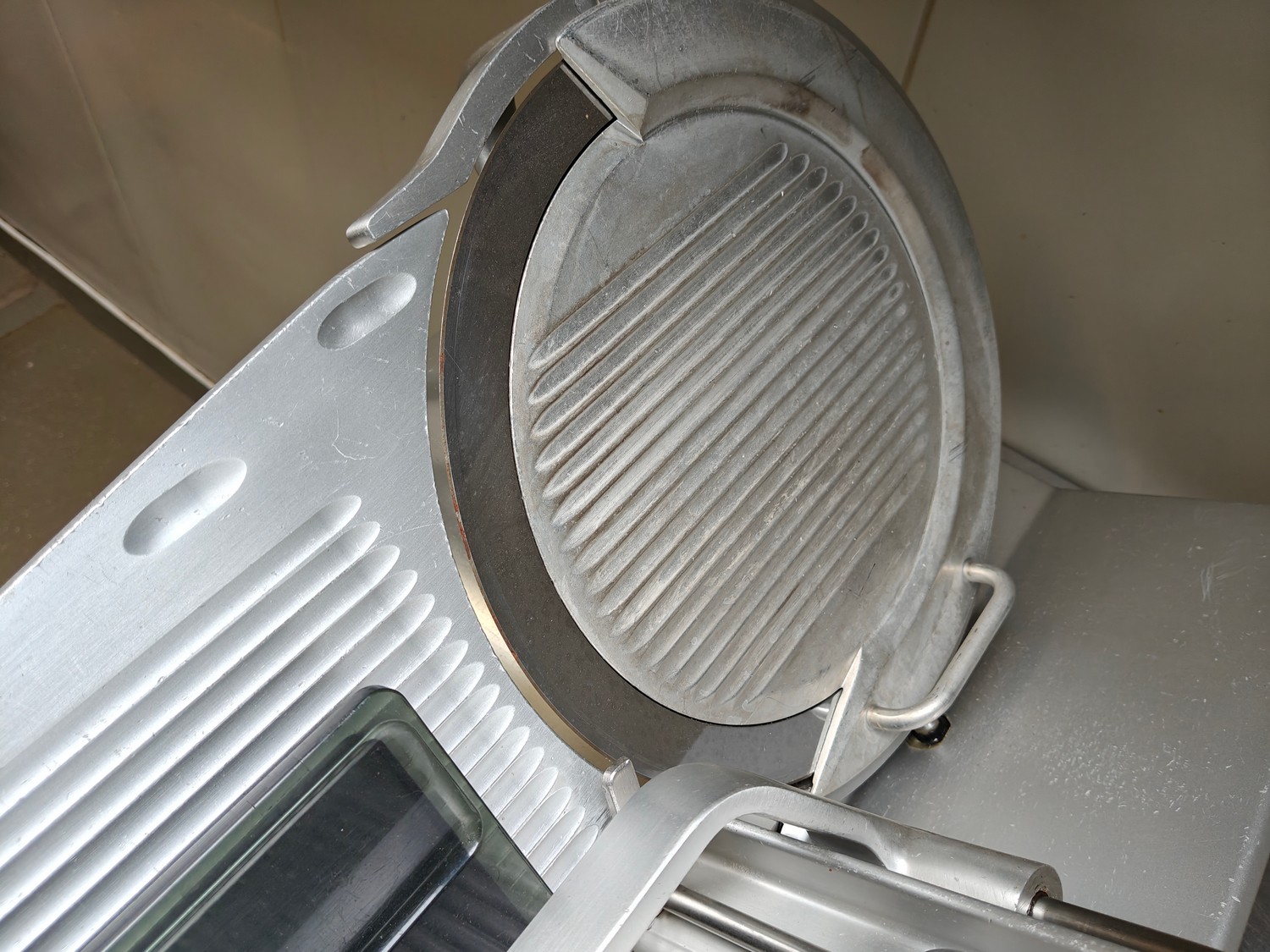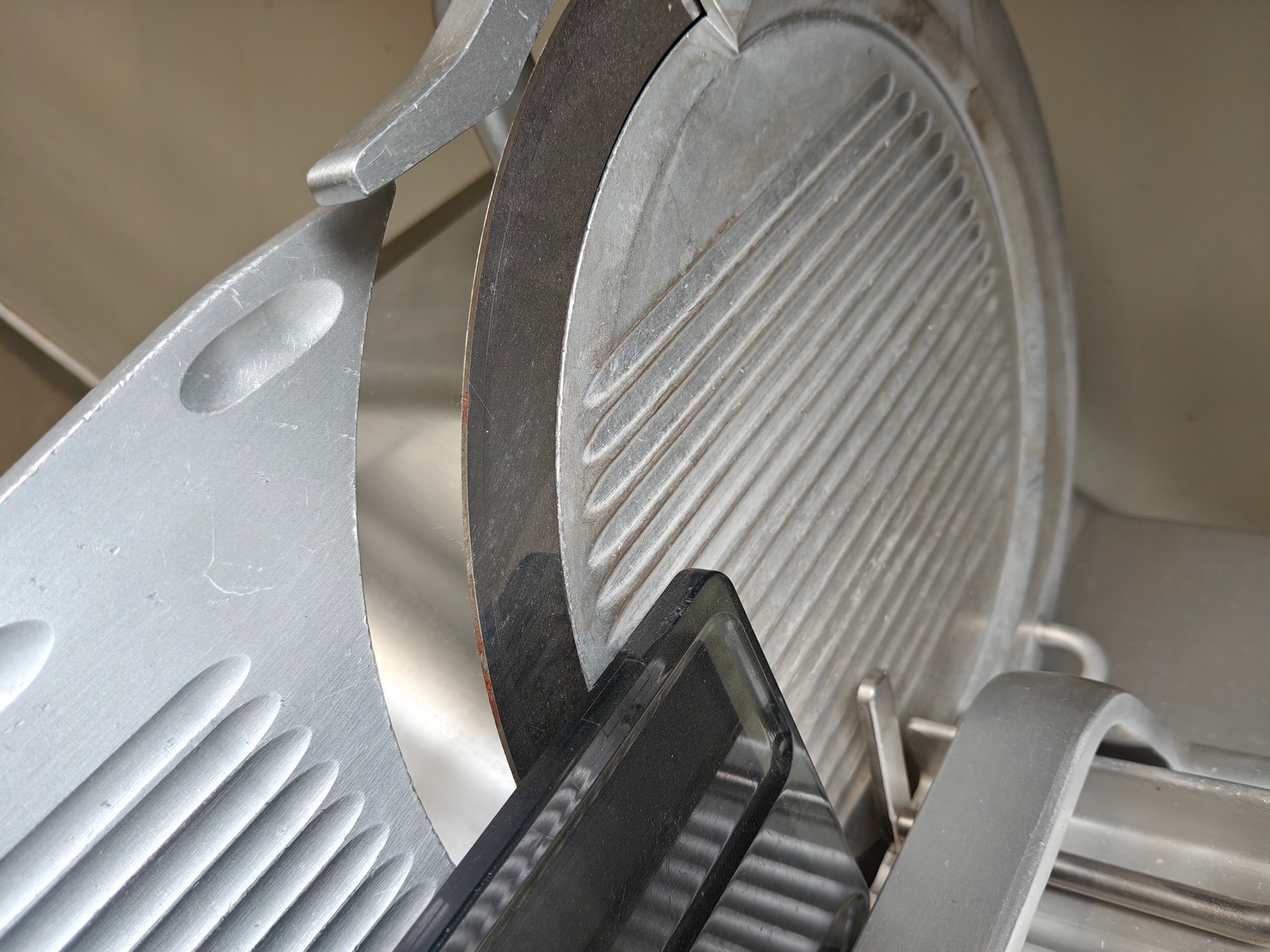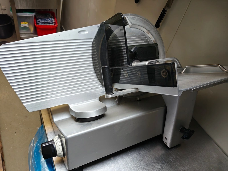 Bizerba slicer, type: SE 12, 230 V, 1 Ph, 50 Hz, 1.79 A, dimensions: 750 mm x 600 mm x 450 mm.