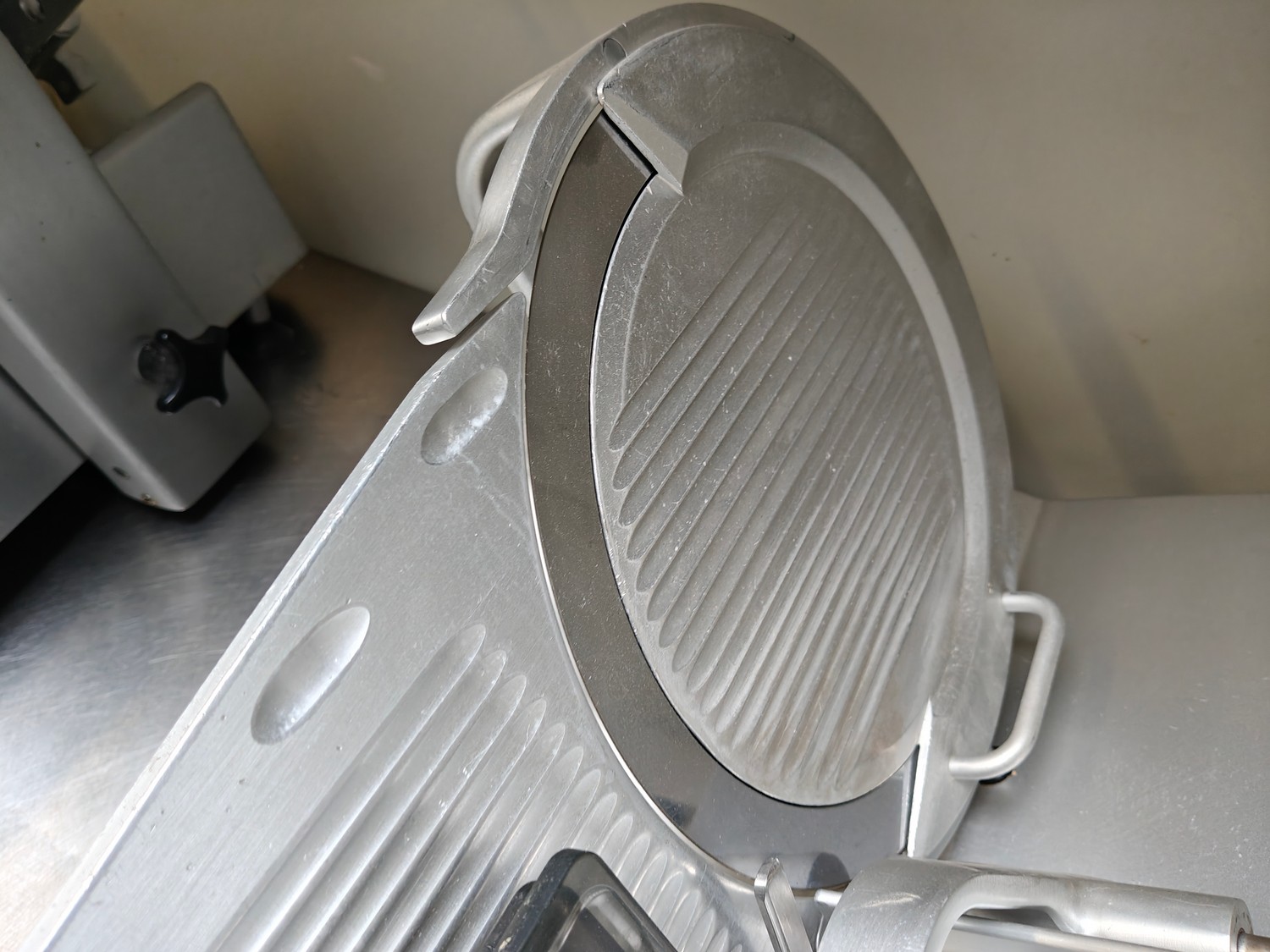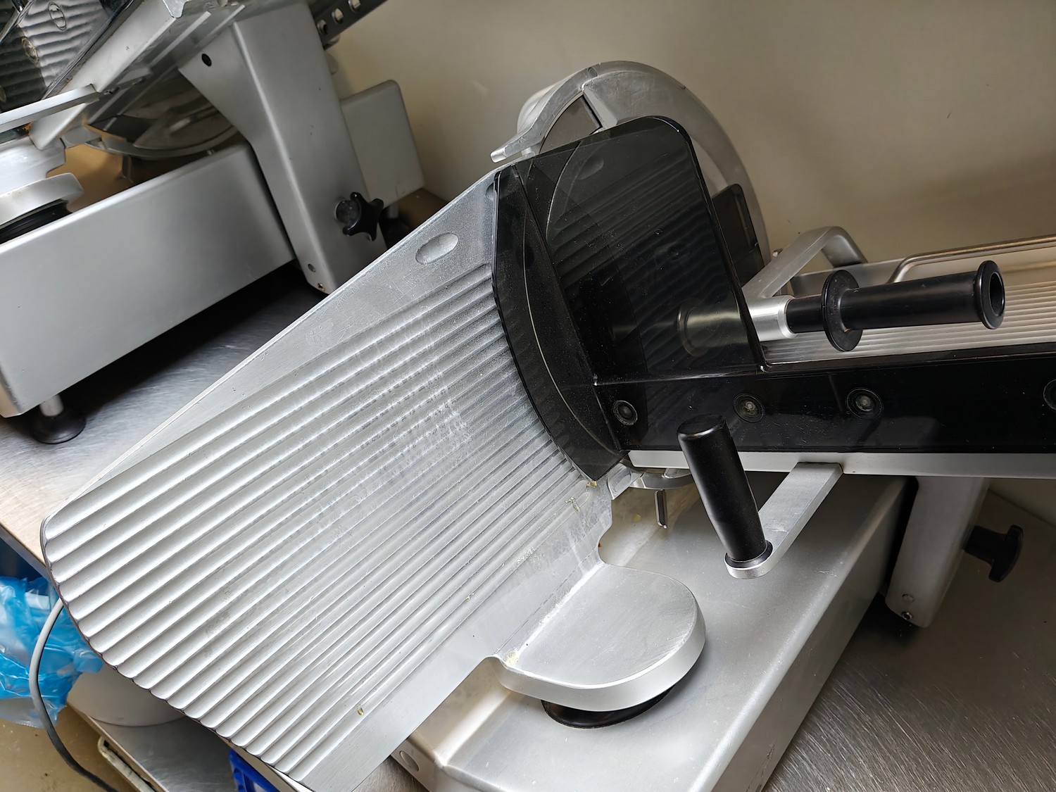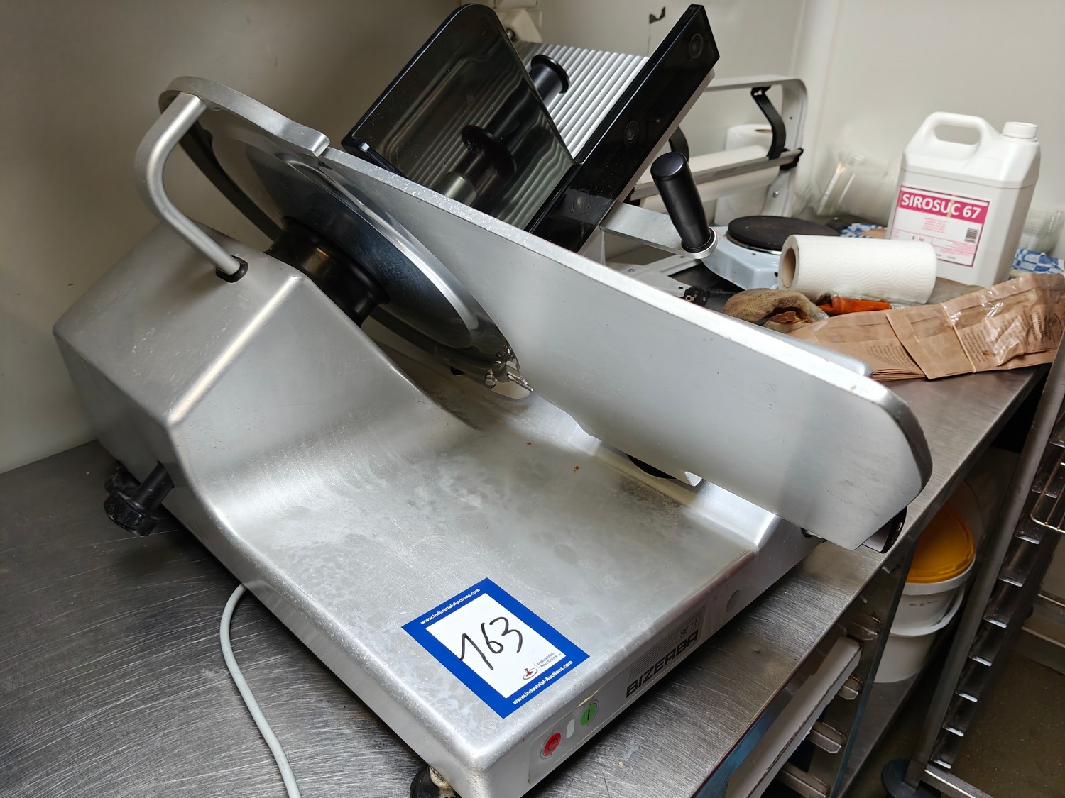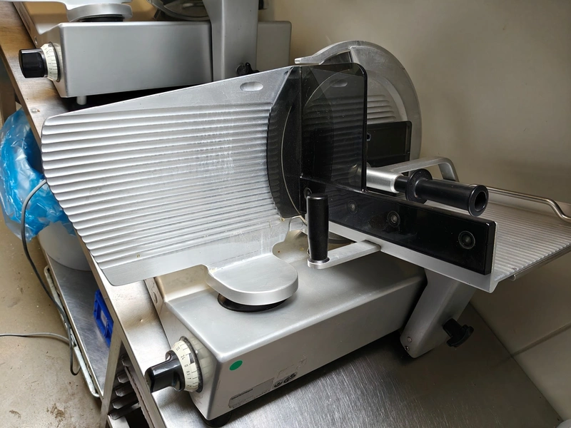 Bizerba slicer, type: SE 12, 230 V, 1 Ph, 50 Hz, 1.79 A, dimensions: 750 mm x 600 mm x 450 mm.